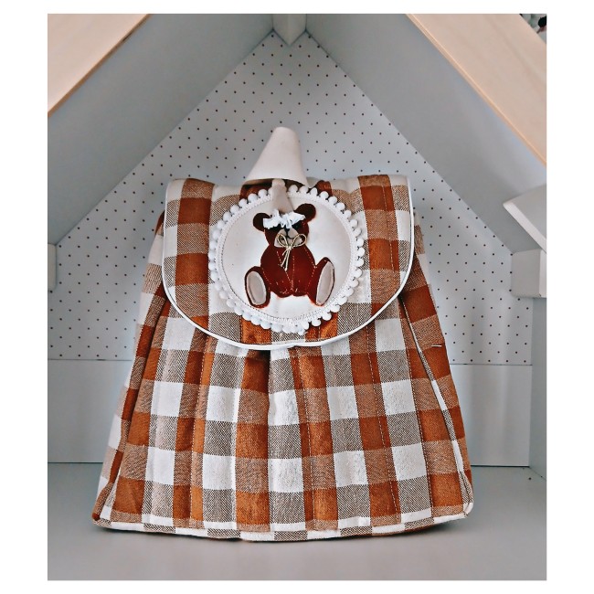 Il est en coton vichy beige et matelassé . Le rabat est en double gaze. Les deux versions se ferment avec une fermeture cartable bronze, si vous souhaitez un bouton aimanté à la place me le préciser en commentaire lors de la commande.