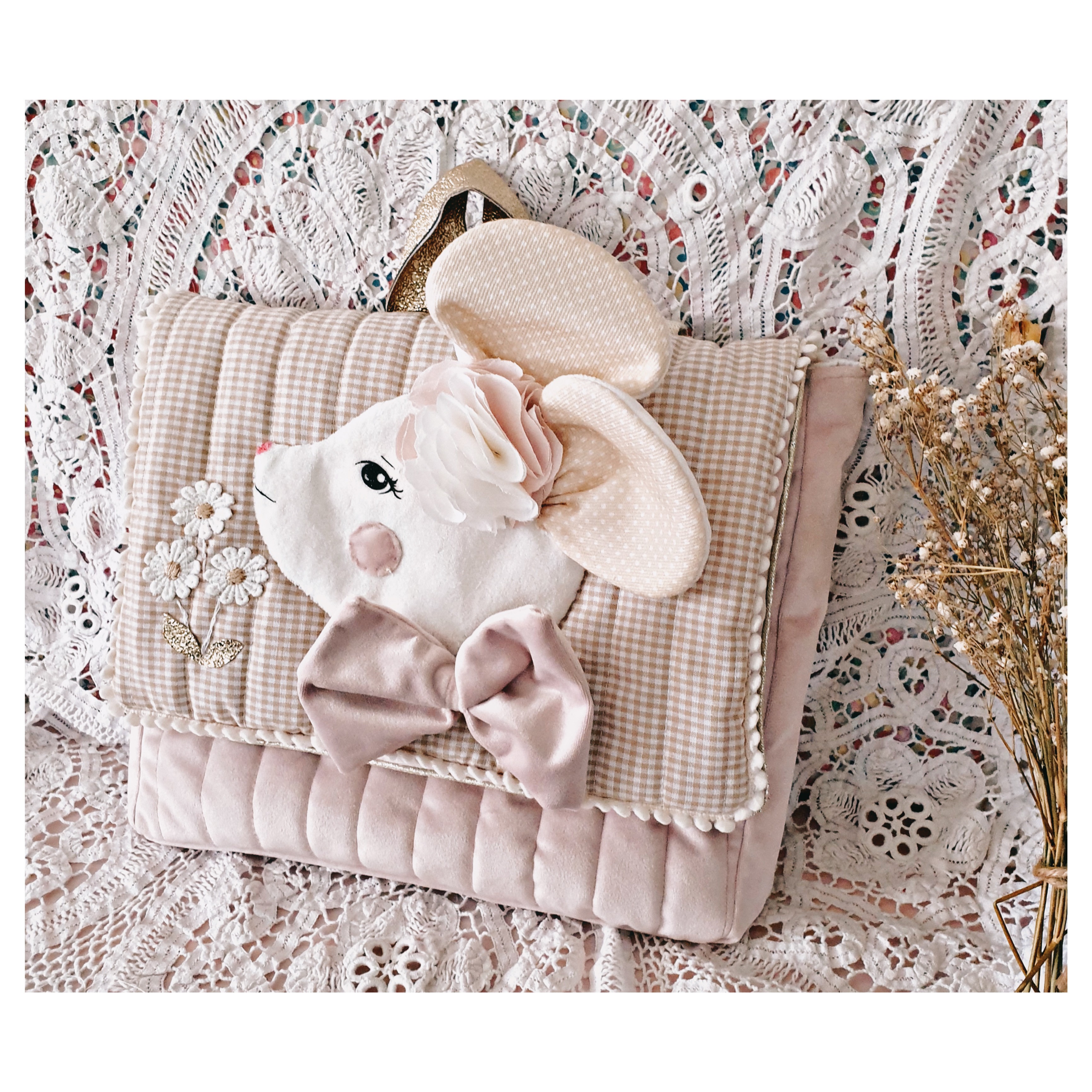 Petit cartable ou sac à dos en coton beige et blanc pour le rabat et velours rose , le tout matelassé, sur le rabat application d'une jolie tête de souris en velours ivoire avec un gros noeud en velours rose et une fleur en coton ivoire et rose , les oreilles sont doublées de d coton jaune à petits pois blancs , petit galon pompon tout autour du rabat.