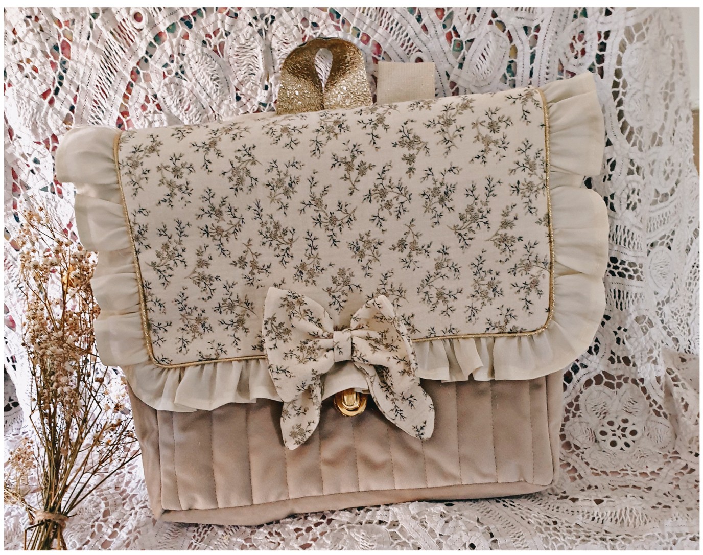 Il est en velours beige matelassé . Le rabat est en double gaze avec un volant en coton beige .