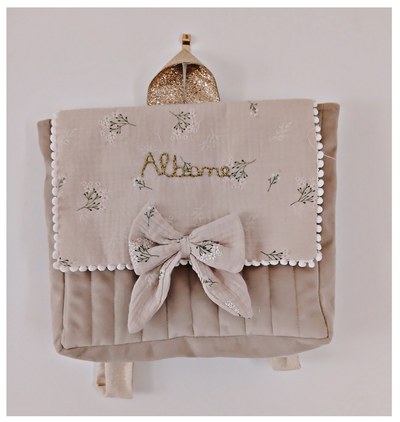 Il est en velours beige et matelassé . Le rabat est en coton imprmé de fleurs sur fond beige , avec un petit galon pompons autour du rabat .