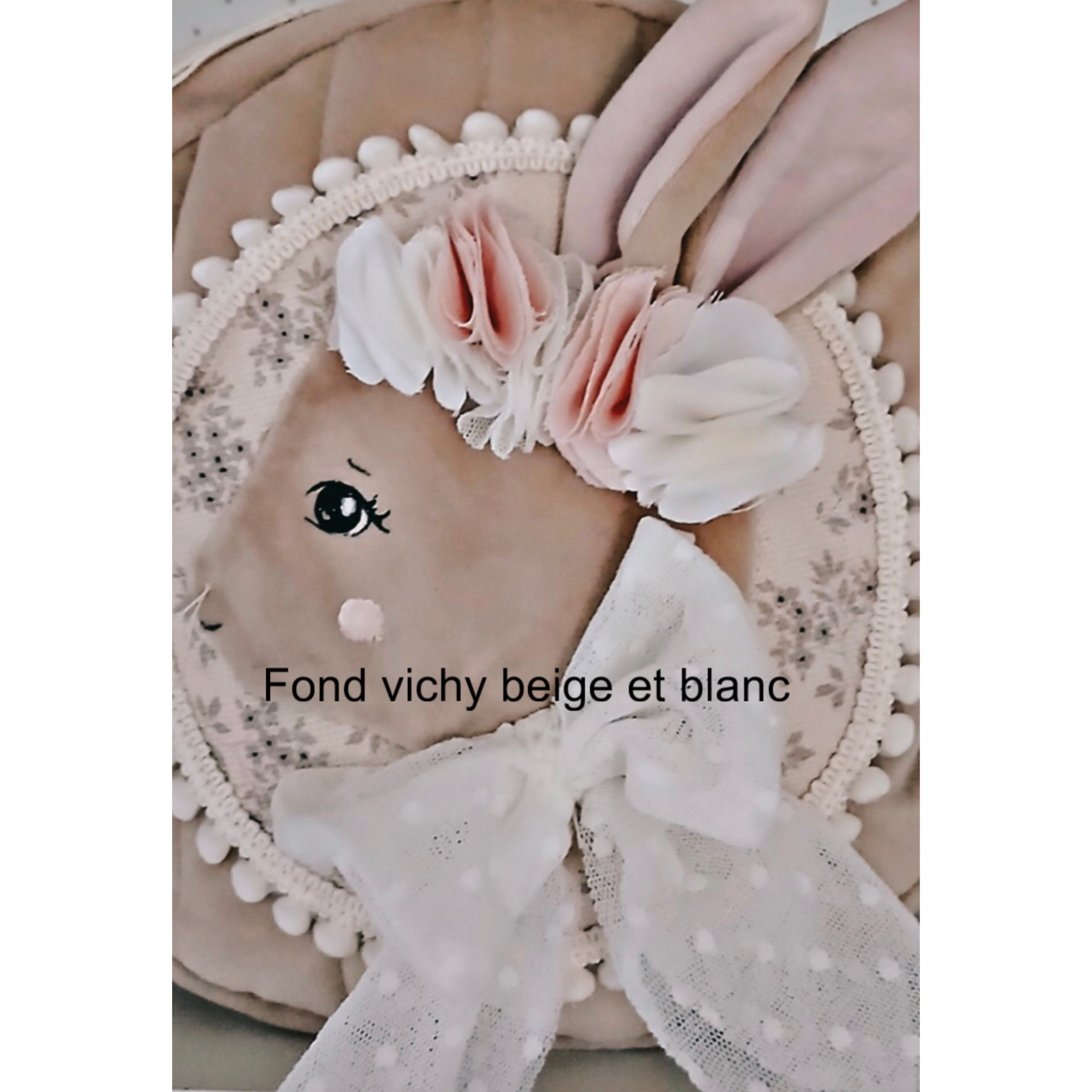 Sac bowling pour enfants en velours beige matelassé et doublé de coton ivoire uni , petite poche intérieure. Poche extérieure en vichy beige et blanc matelassée où est cousue une tête d'animal au choix en velours .