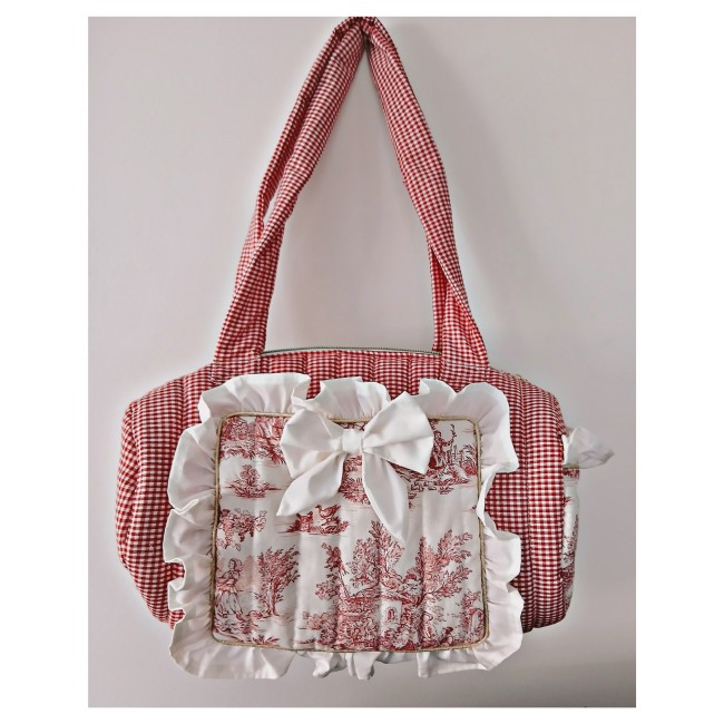 Sac bowling pour enfants en coton vichy beige et blanc matelassé et doublé de coton ivoire uni , petite poche intérieure. Poche extérieure matelassée où est cousu un petit médaillon en double gaze orné d'un galon marguerites.