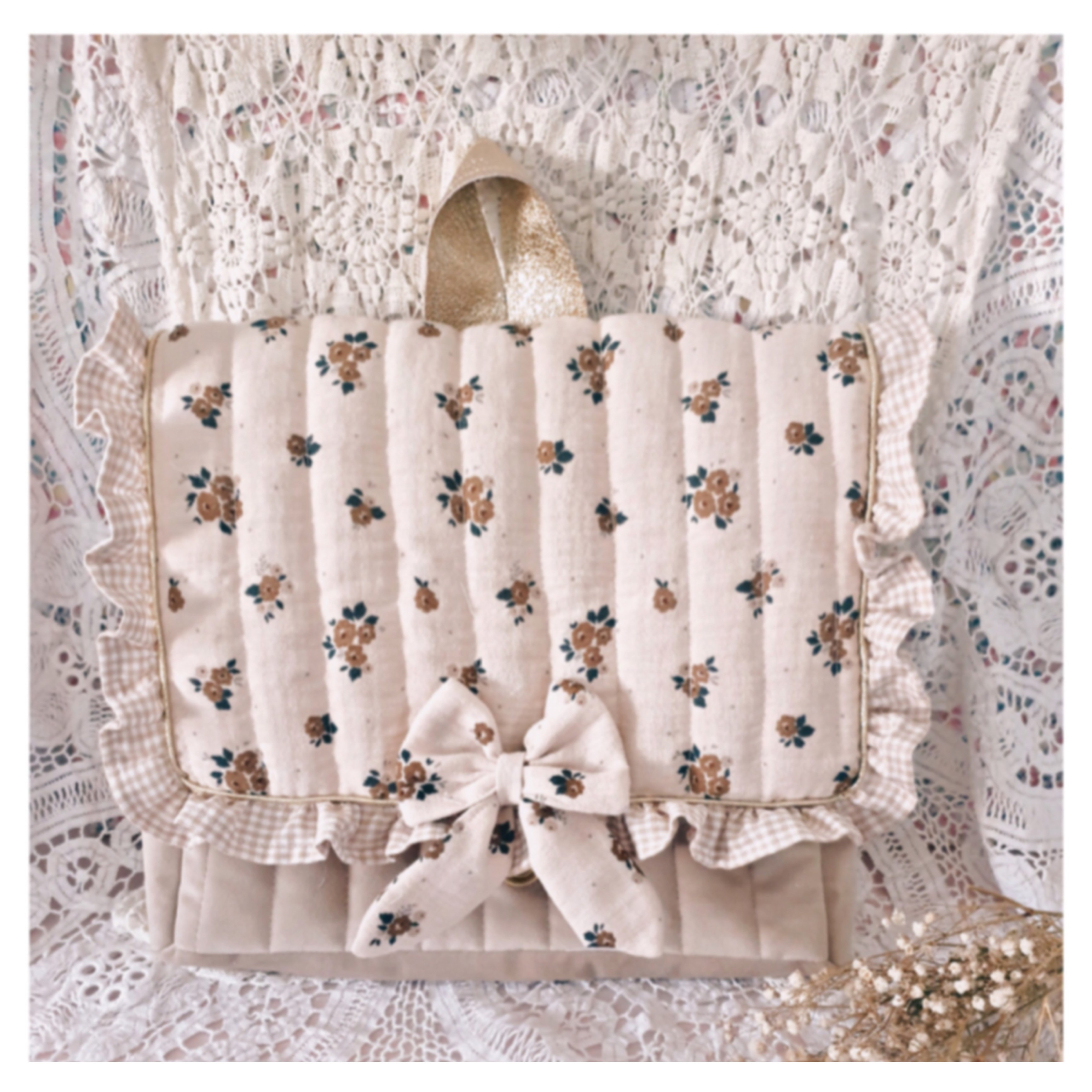 Il est en velours beige et matelassé . Le rabat est en coton imprmé de fleurs sur fond beige , avec un petit volant en vichy beige autour du rabat .