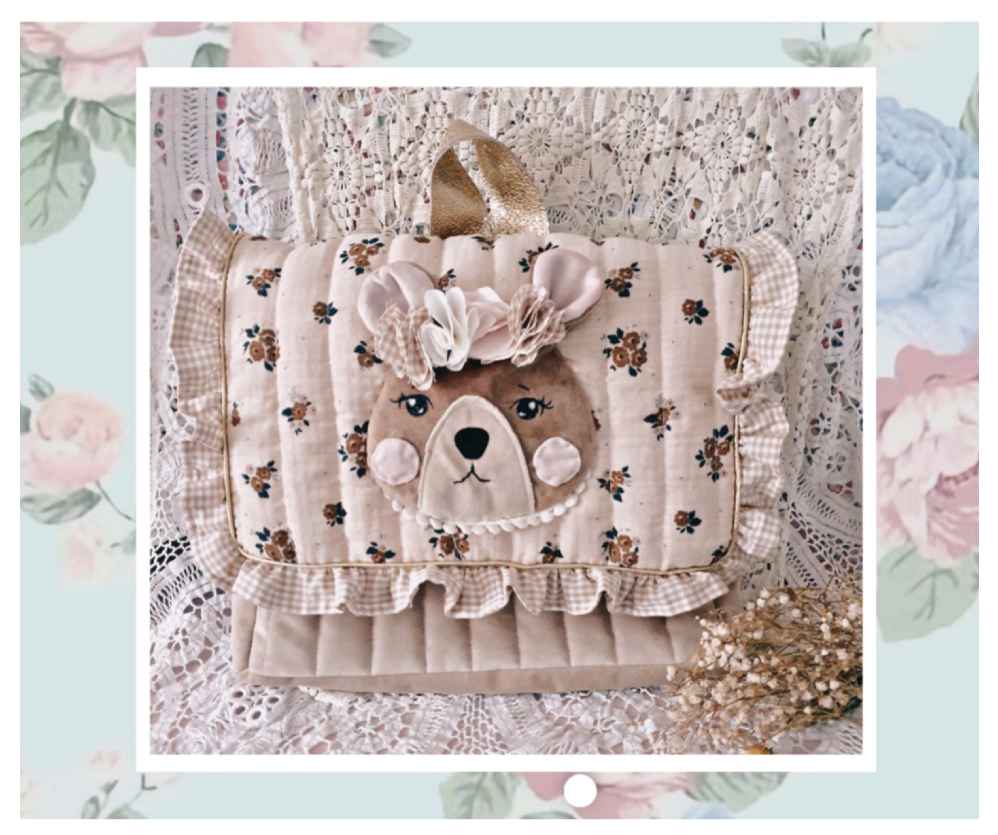 Petit cartable ou sac à dos en double gaze pour le rabat et velours beige , le tout matelassé, sur le rabat application d'une tête d'ours en velours marron avec une couronne de fleurs , petit volant en coton vichy tout autour du rabat.