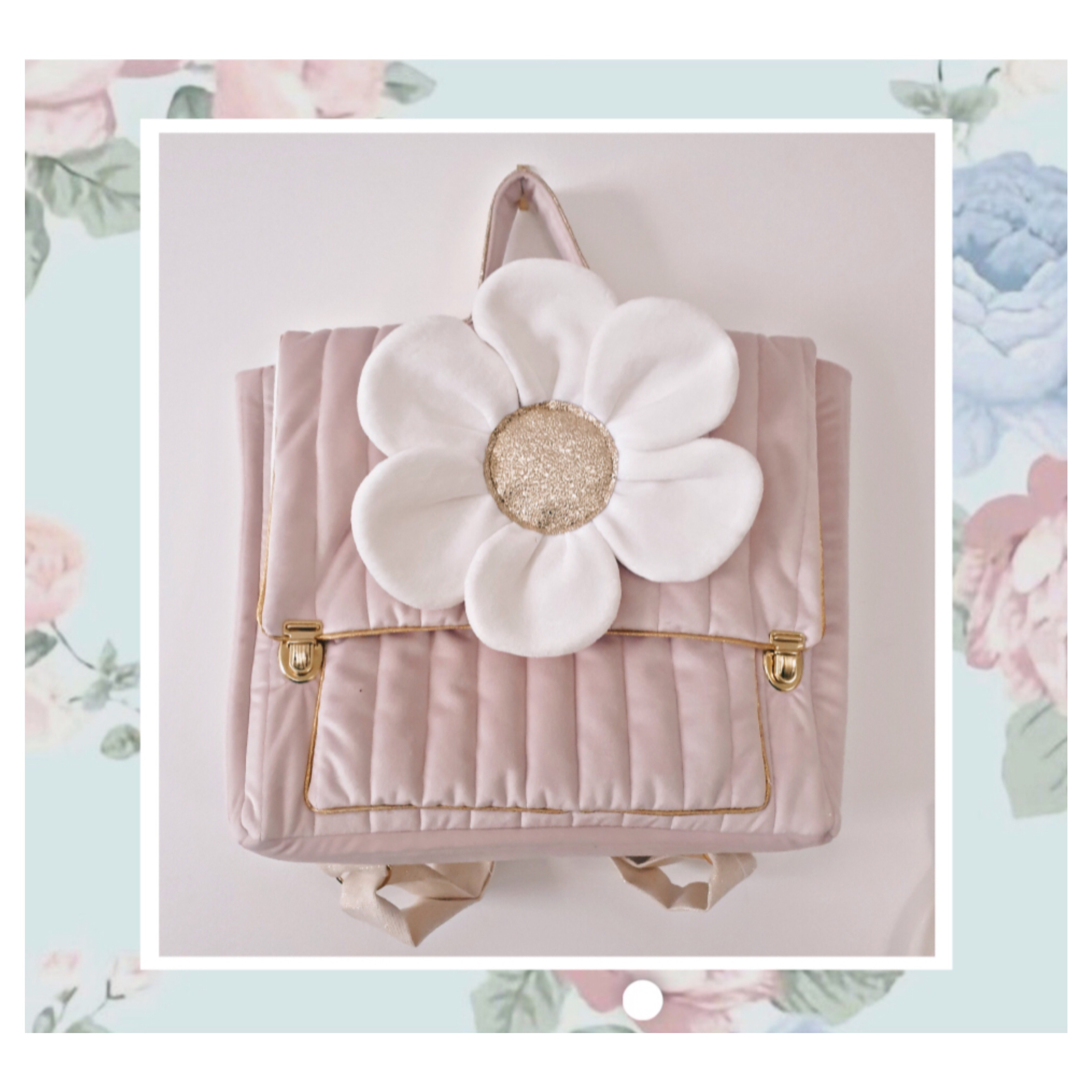 Il est en velours rose et matelassé . Le rabat est en velours matelassé avec une belle marguerite en velours ivoire .il se ferme avec deux fermetures'cartable dorées sauf pour le mini avec deux boutons aimantés .