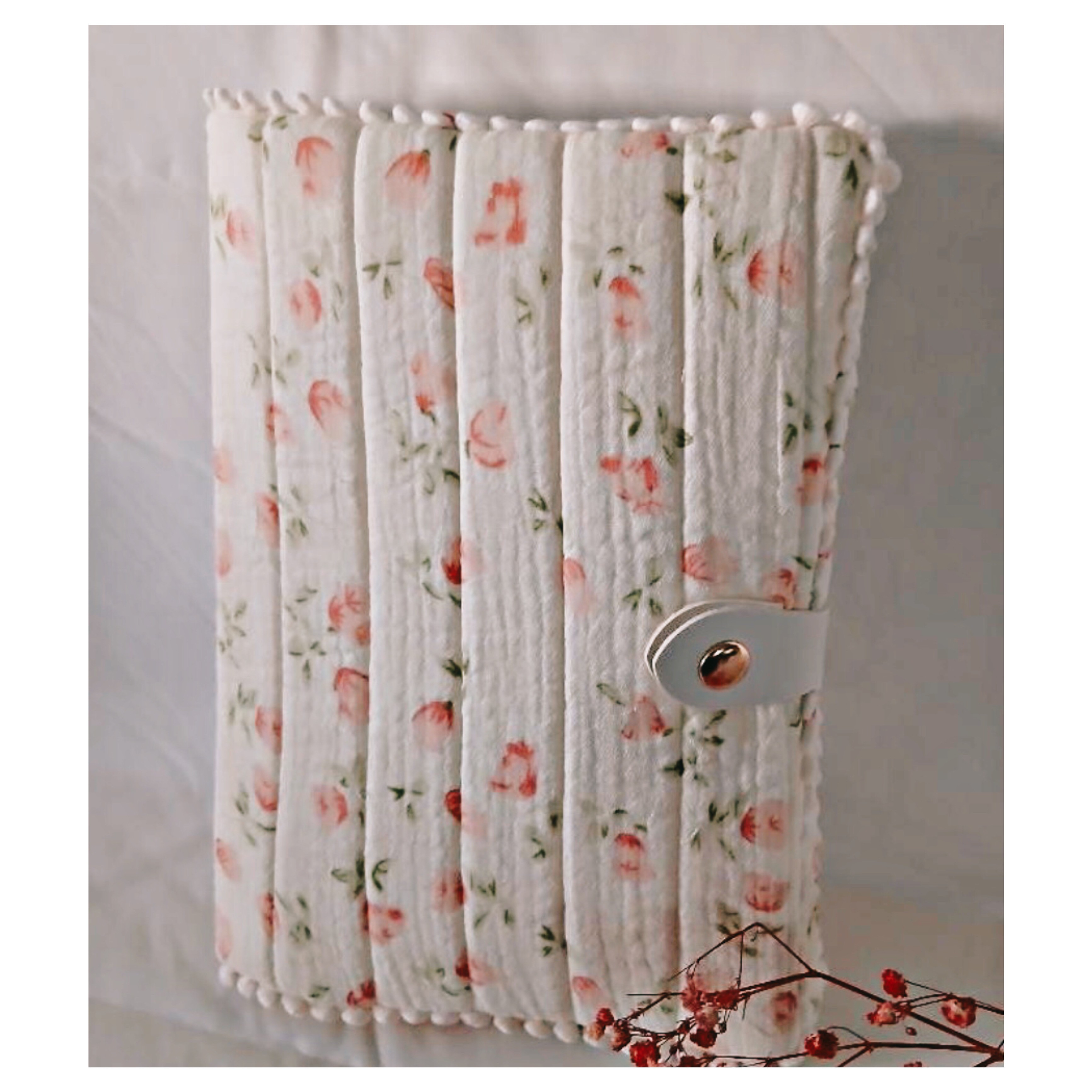 Il est en double gaze ivoire motifs fleurs et matelassé. Il se ferme avec un bouton pression , il est doublé de coton uni ivoire.