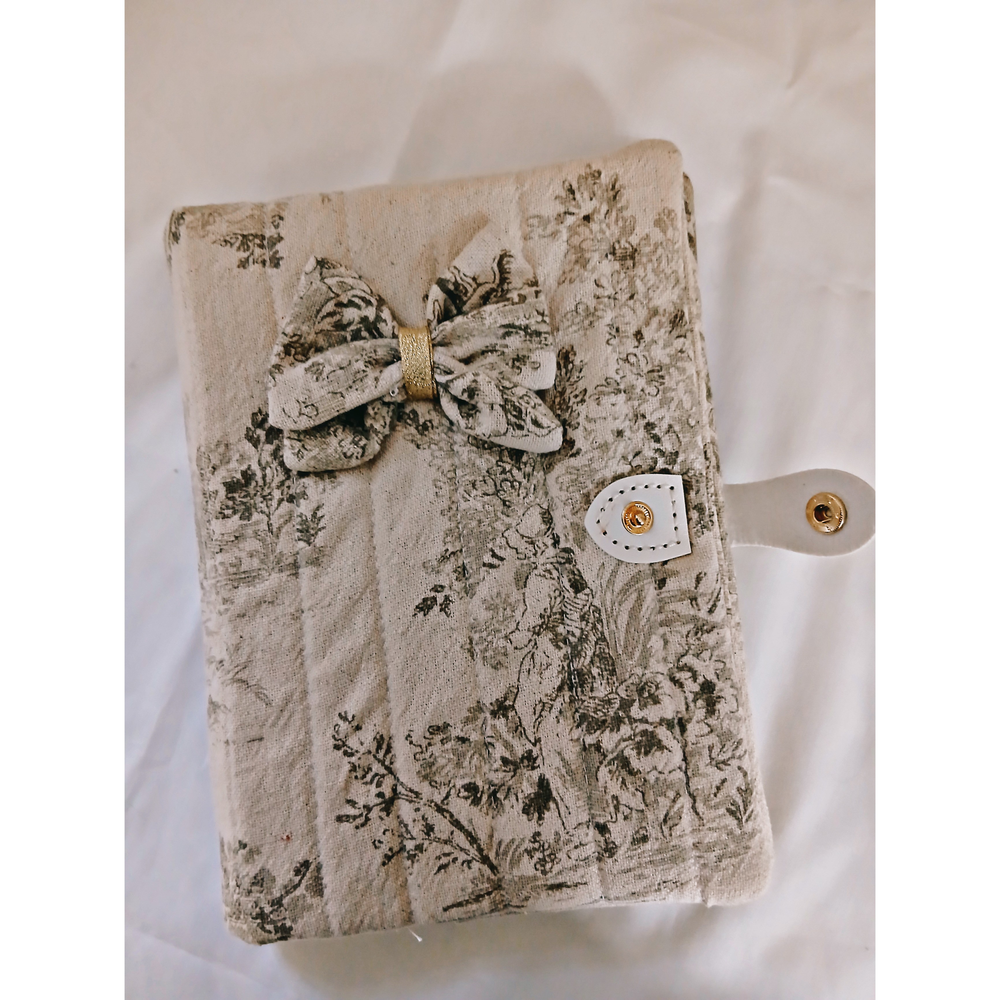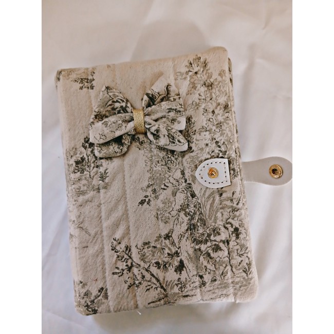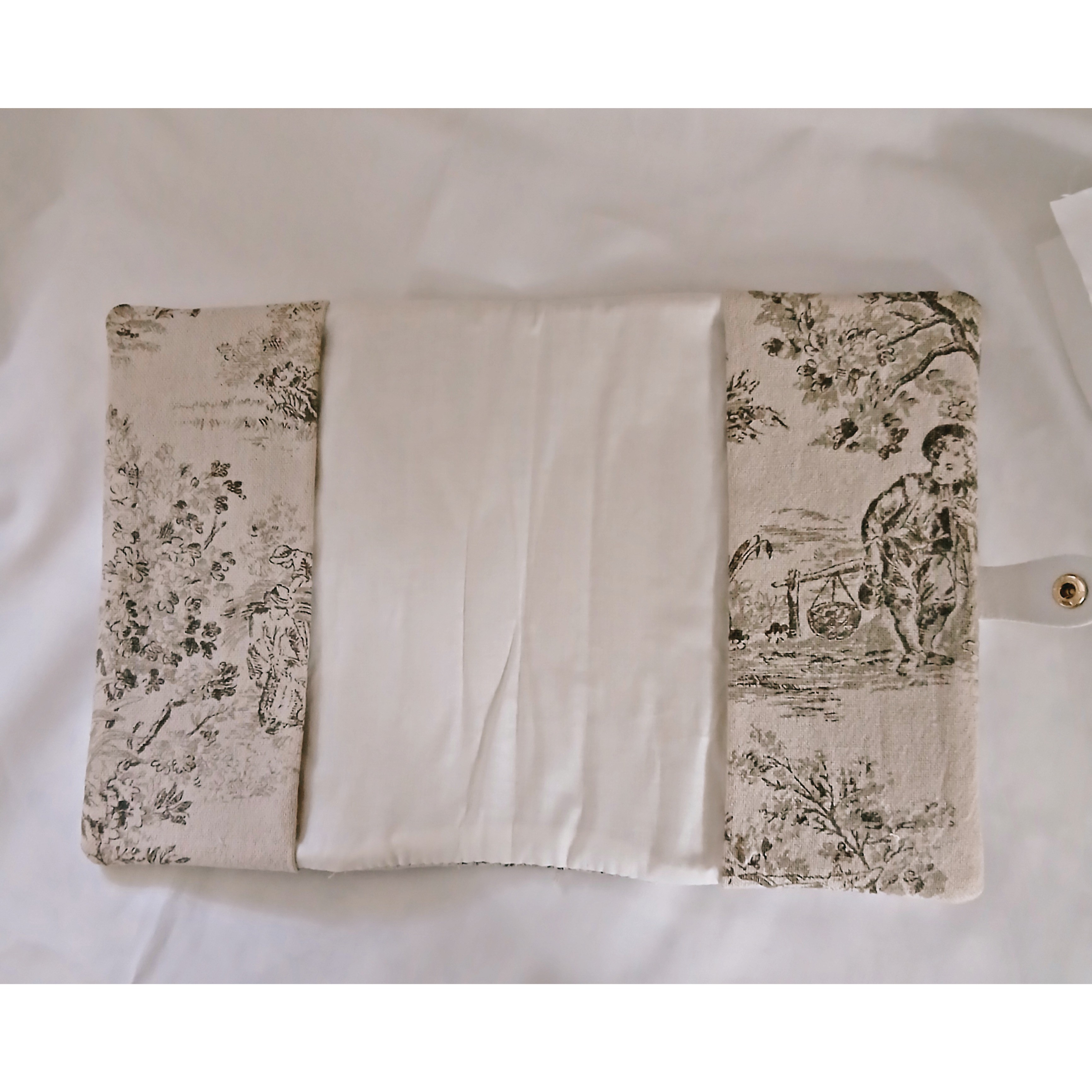 Il est en coton imprimé toile de Jouy tons beiges et matelassé. Il se ferme par un bouton pression , doublé de coton uni.