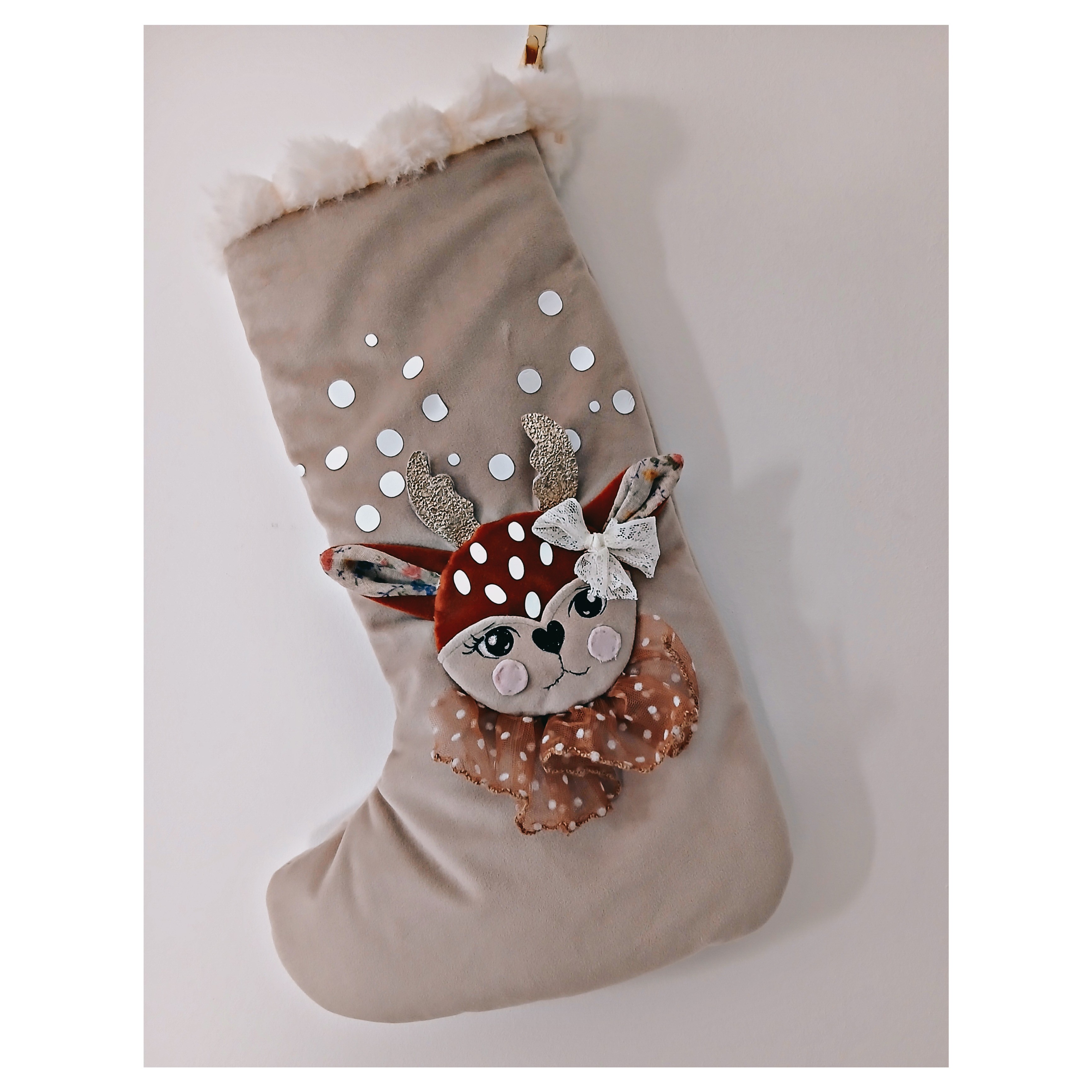 Botte de Noël en velours beige à suspendre avec un petit lien doré .