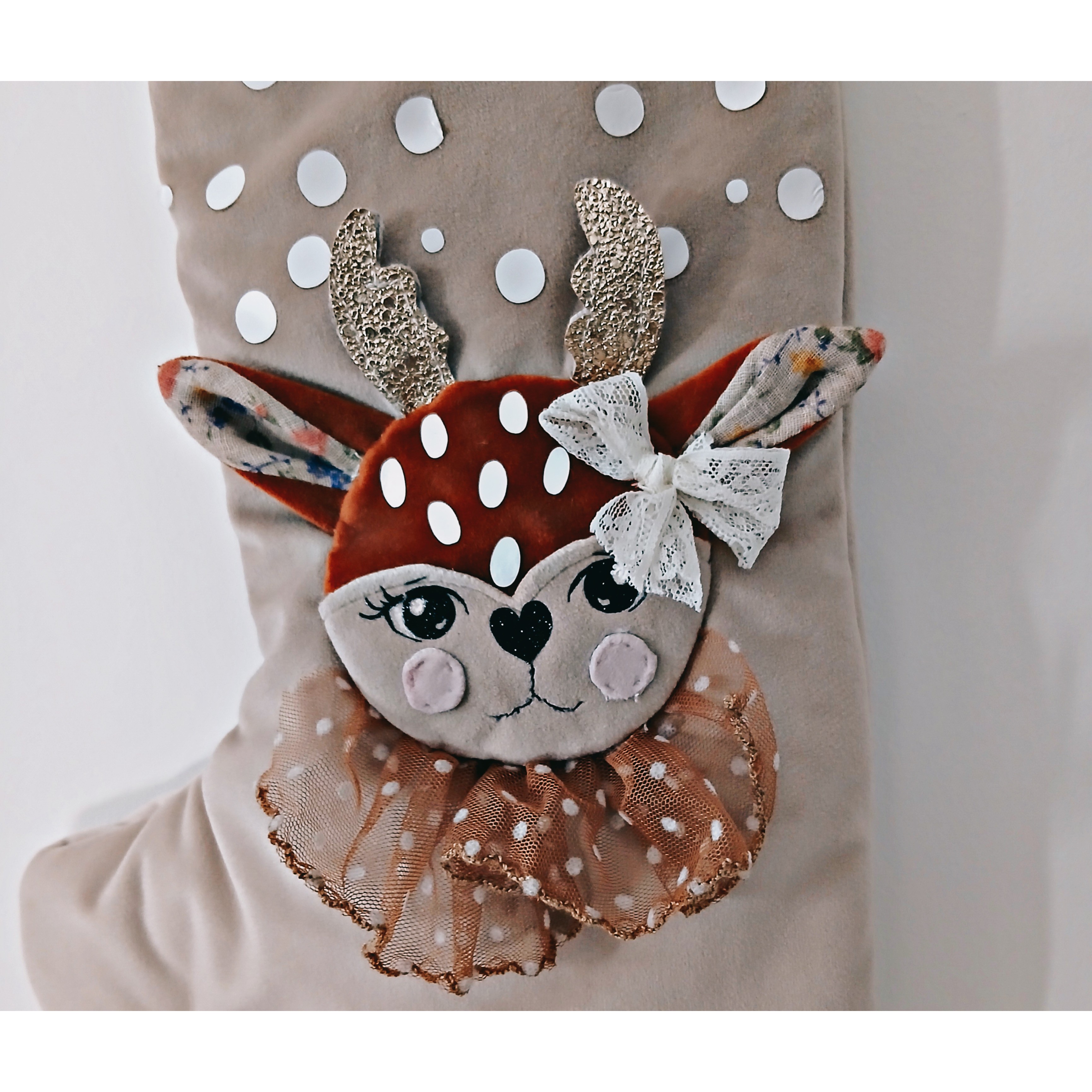 Application d'une tête de biche en velours , petite collerette en tulle à pois blancs , les yeux et le nez sont en flex tehermocollant ainsi que les petits flocons de neige , elle est doublée de coton uni ivoire et est ornée d'un joli galon pompons en fausse fourrure .