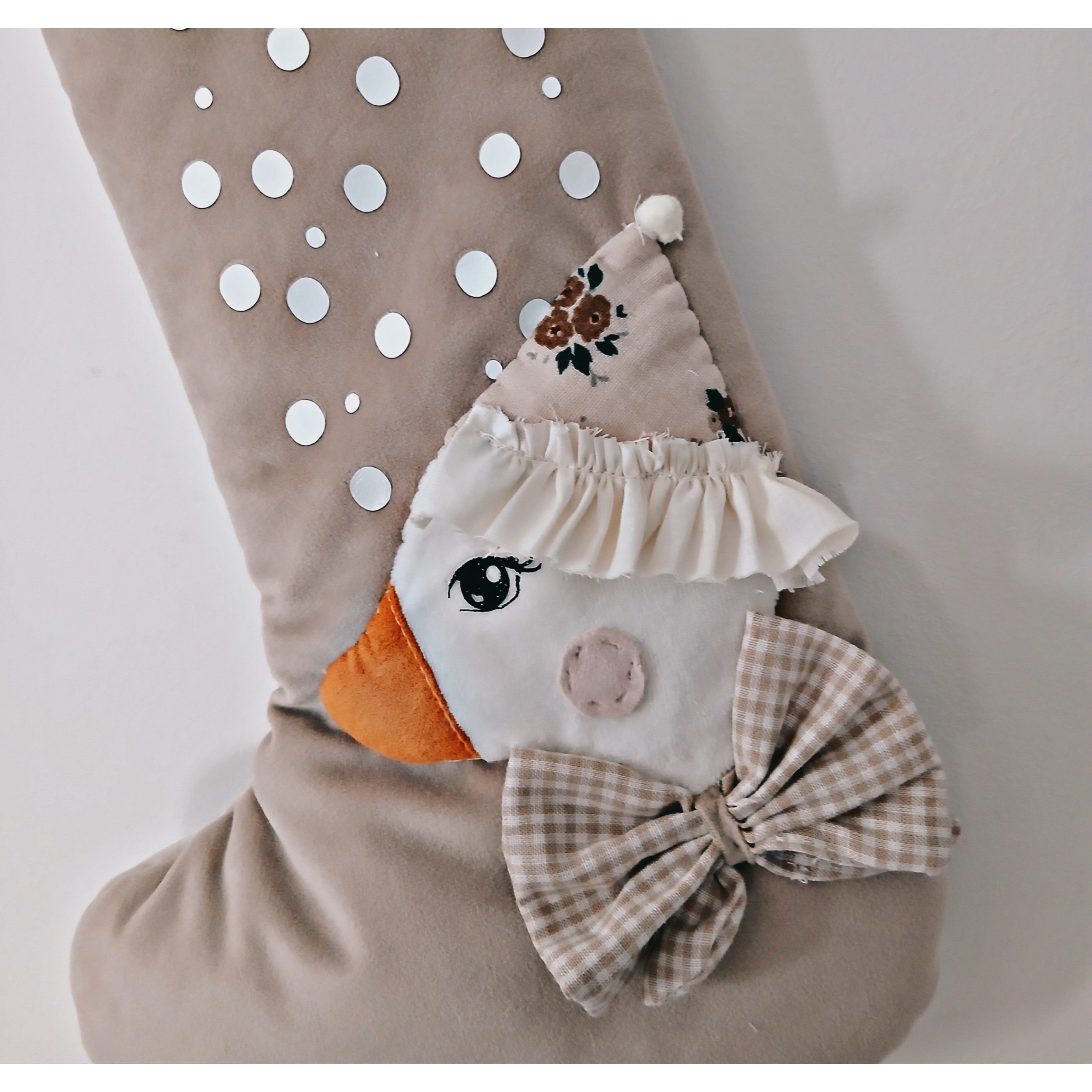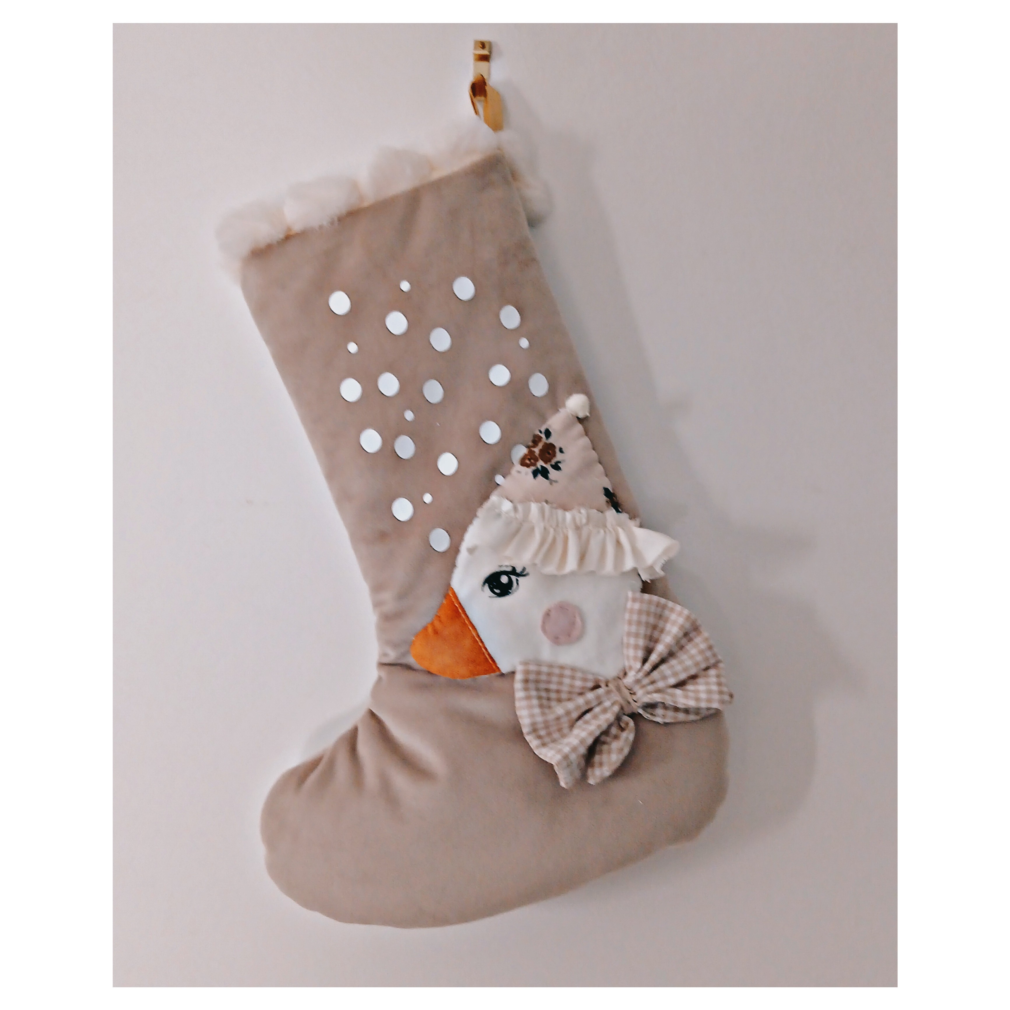 Botte de Noël en velours beige à suspendre avec un petit lien doré .