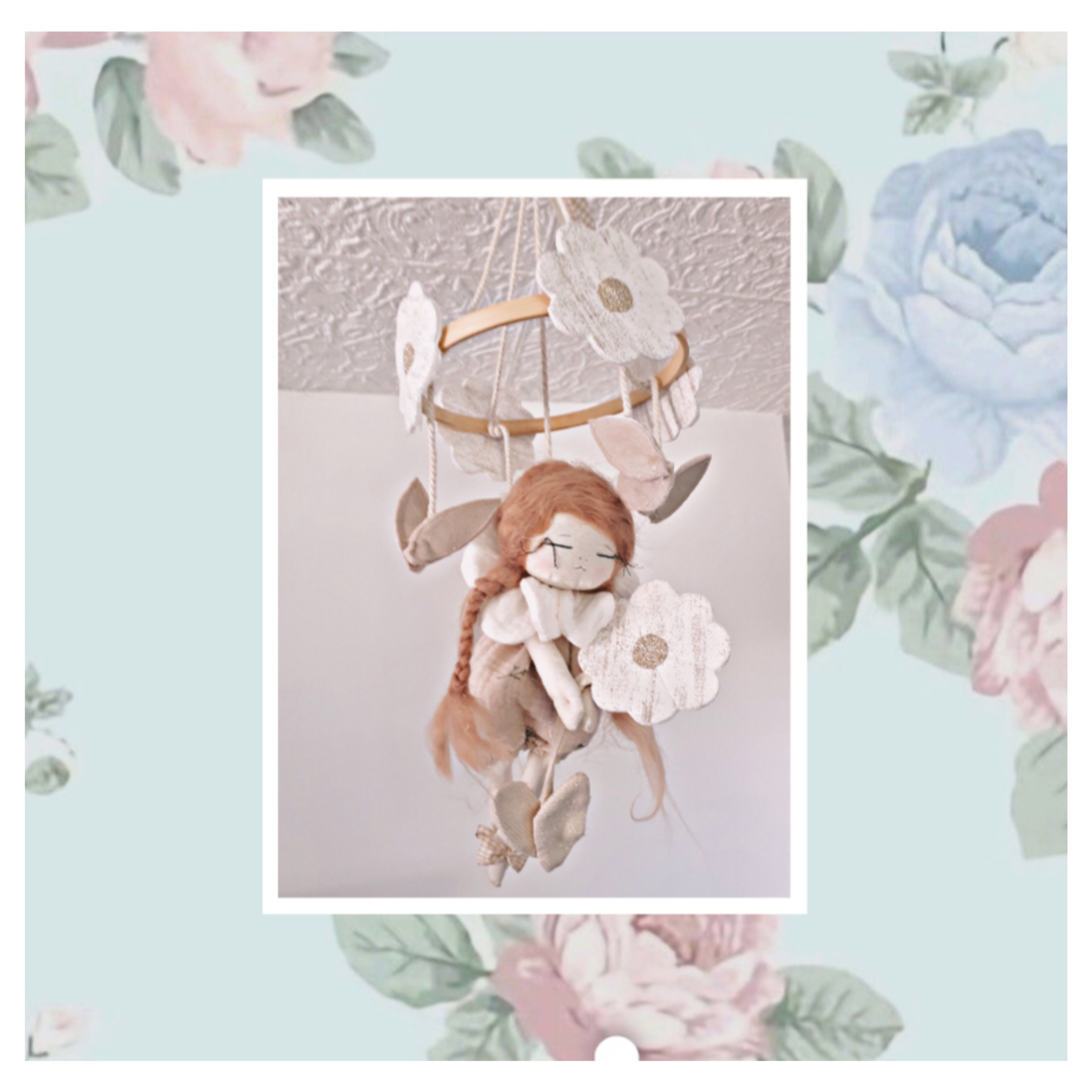 Un joli mobile plein de douceur à accrocher sur une potence ( non fourni) , une petite poupée Joséphine (20 cm ) y est suspendue , elle est vêtue d'une petite combinaison en double gaze fleurie et entre ses bras une grosse fleur représentant une marguerite. Elle a autour de son cou une collerette de pétales en double gaze ivoire . Ses cheveux sont en laine mohair cardée.