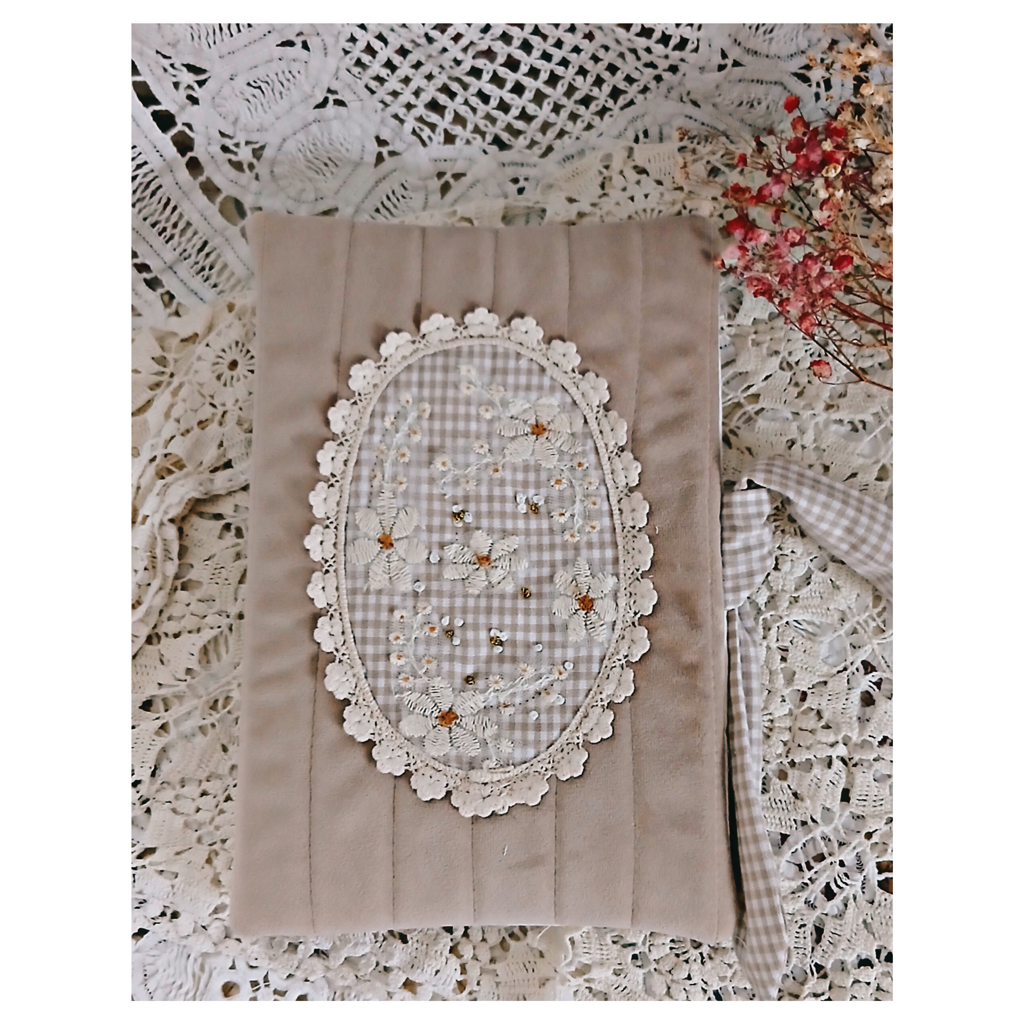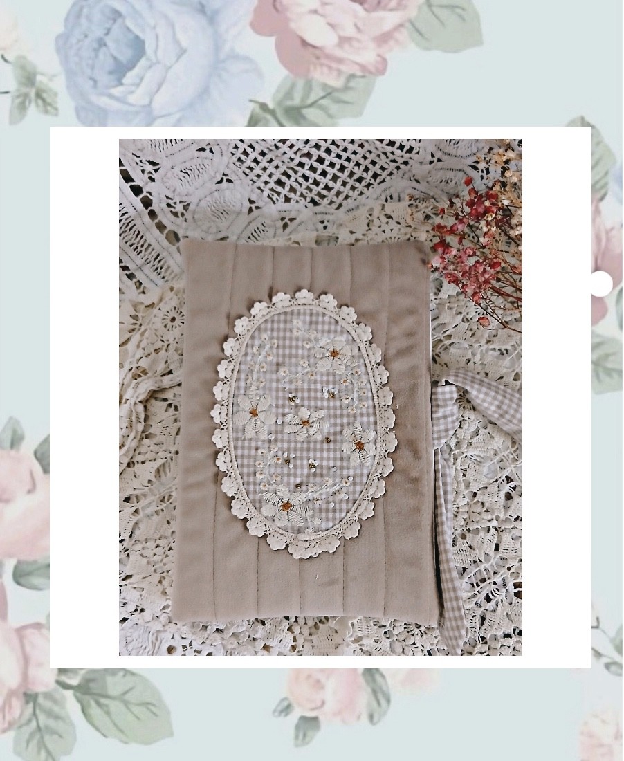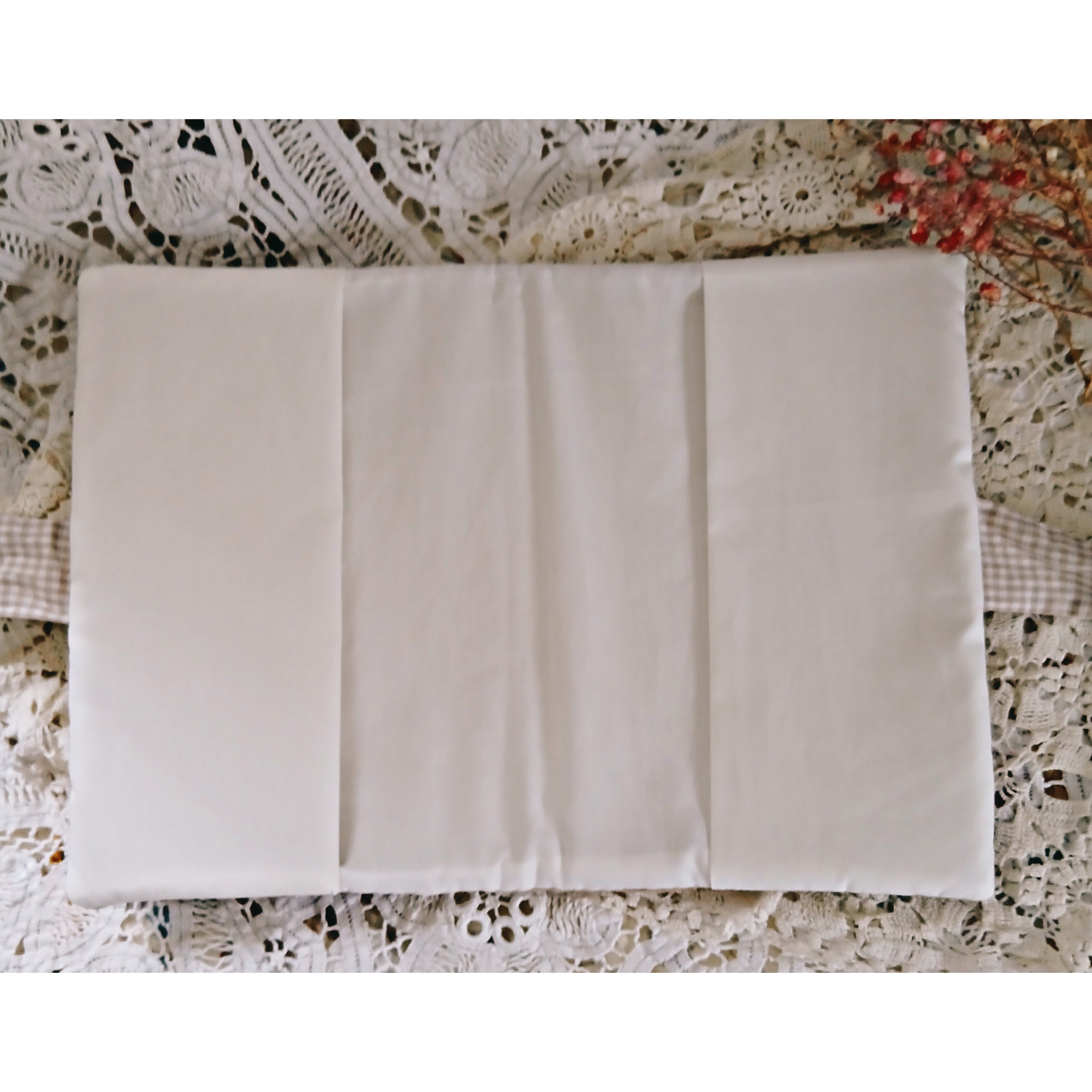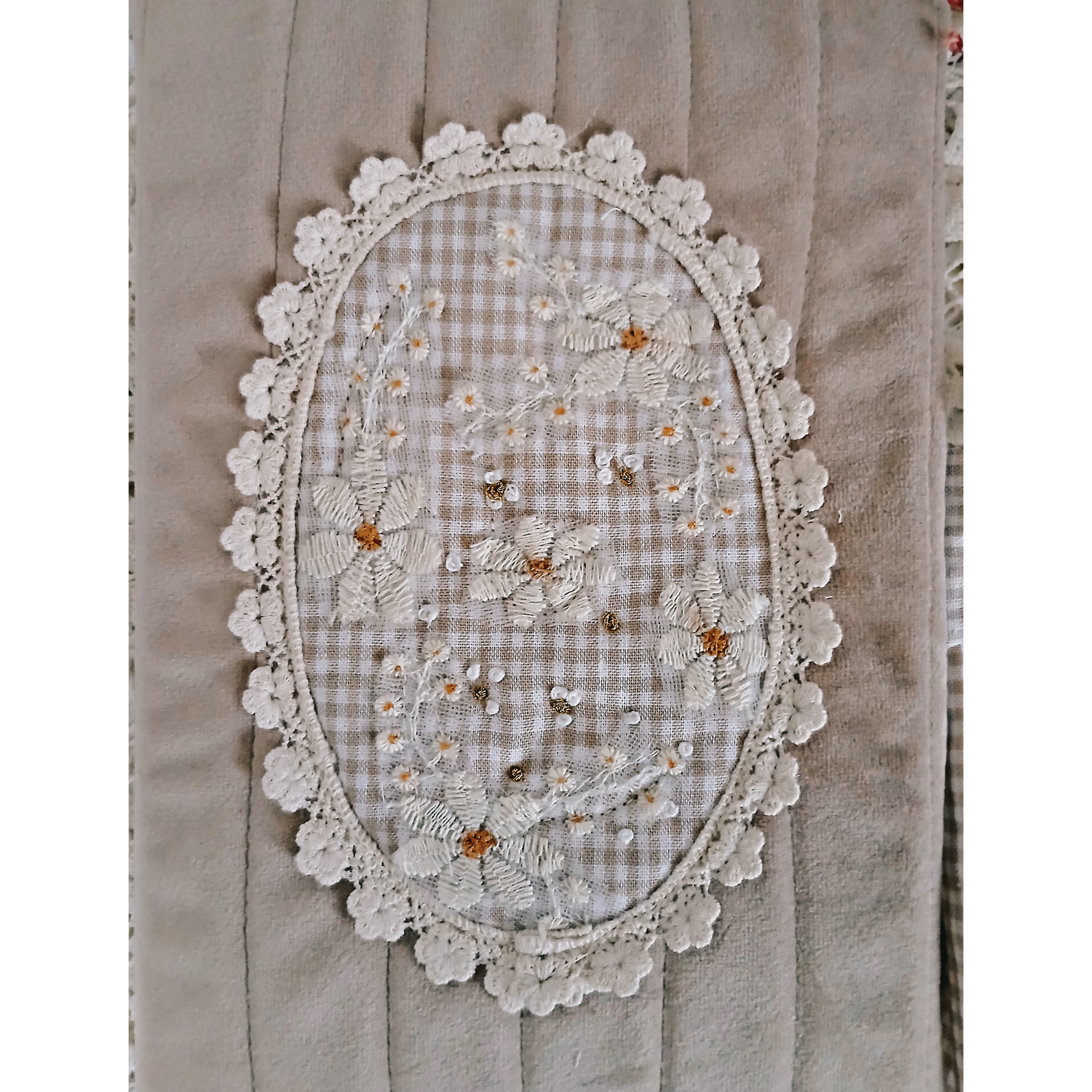 Il est en velours beige et matelassé. Il se ferme avec desliens , il est doublé de coton uni ivoire.