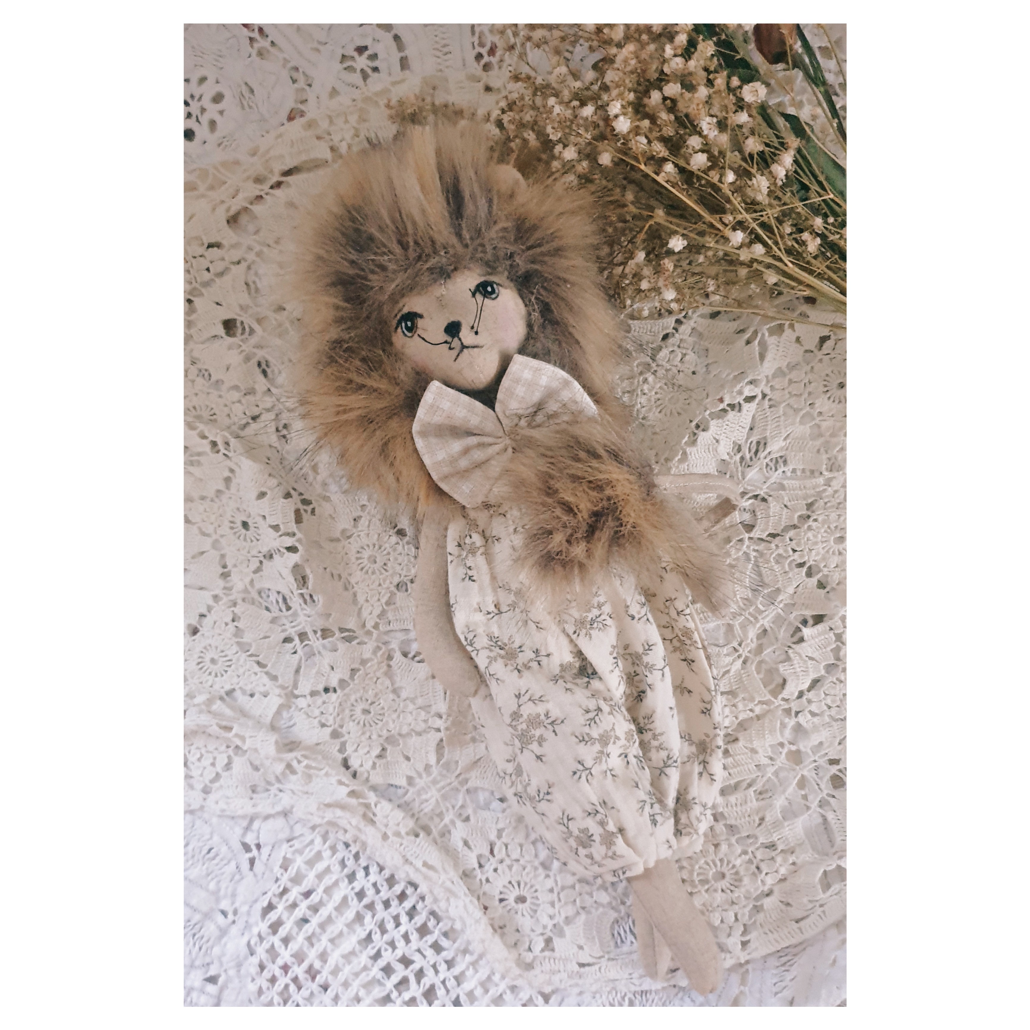 Mini poupée lion de 25 cm , en lin oeko tex , il porte une combinaison en double gaze fleurie , sa crinière est faite avec de la fausse fourrure .
