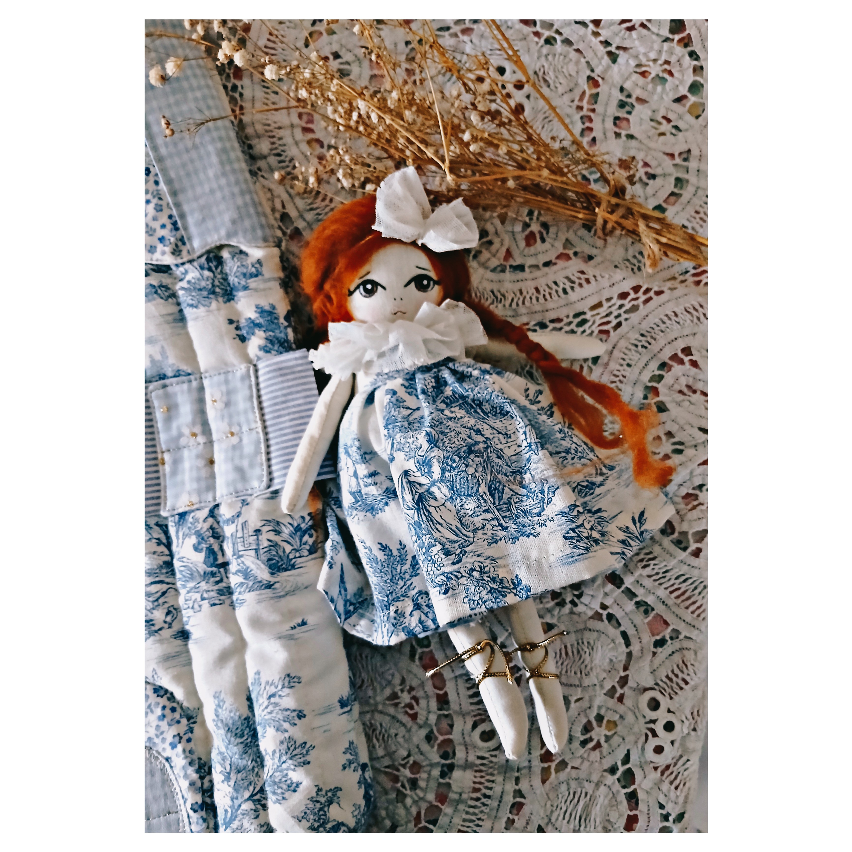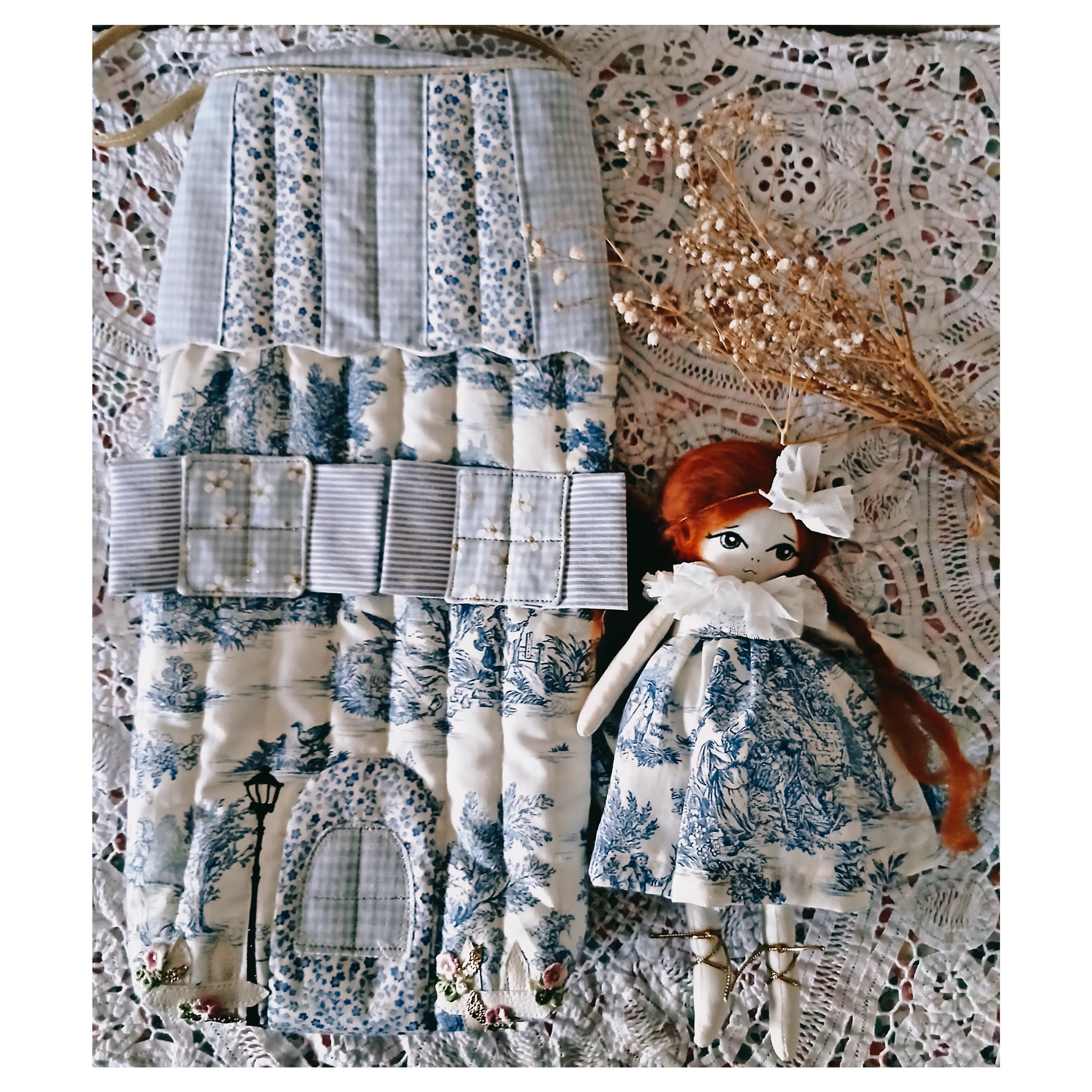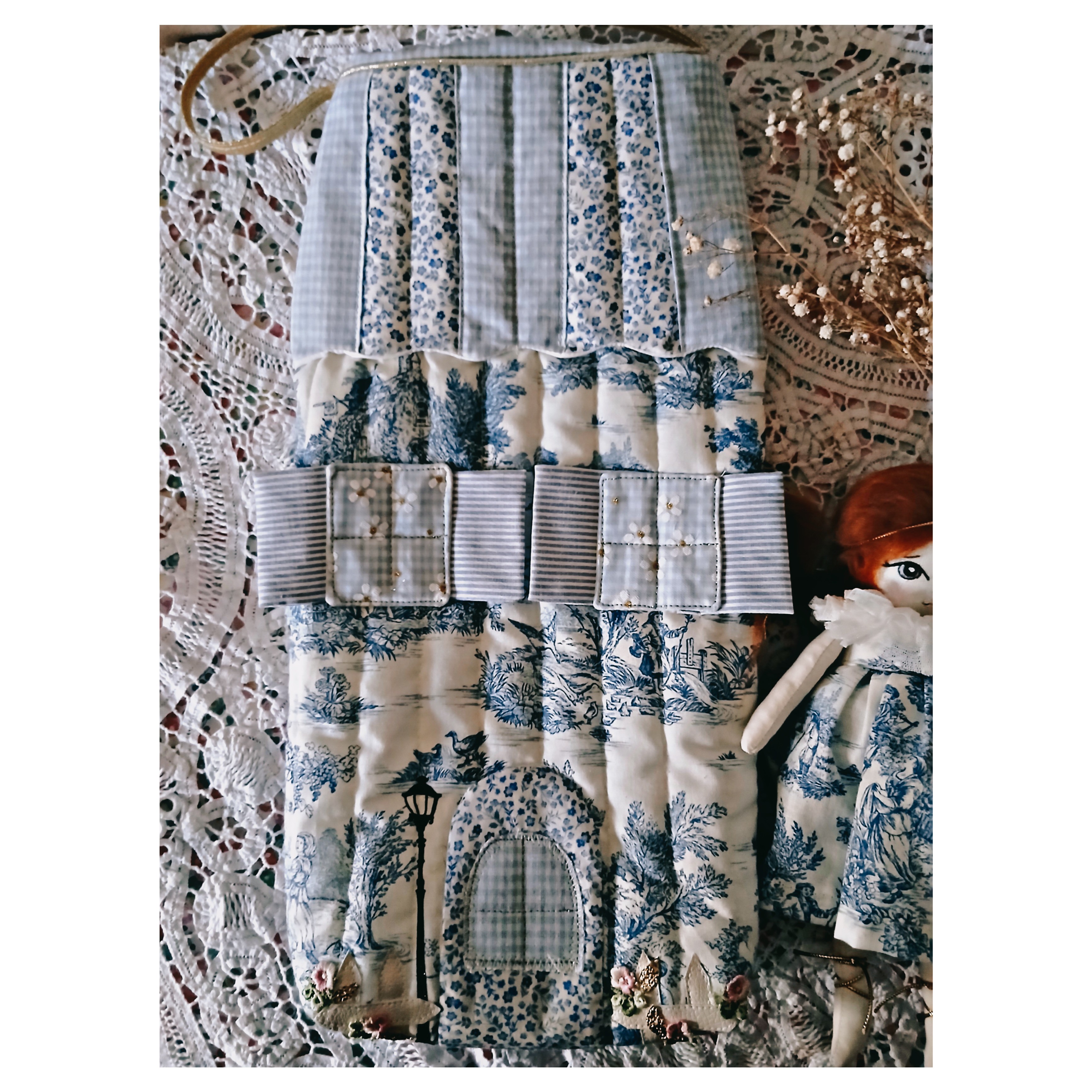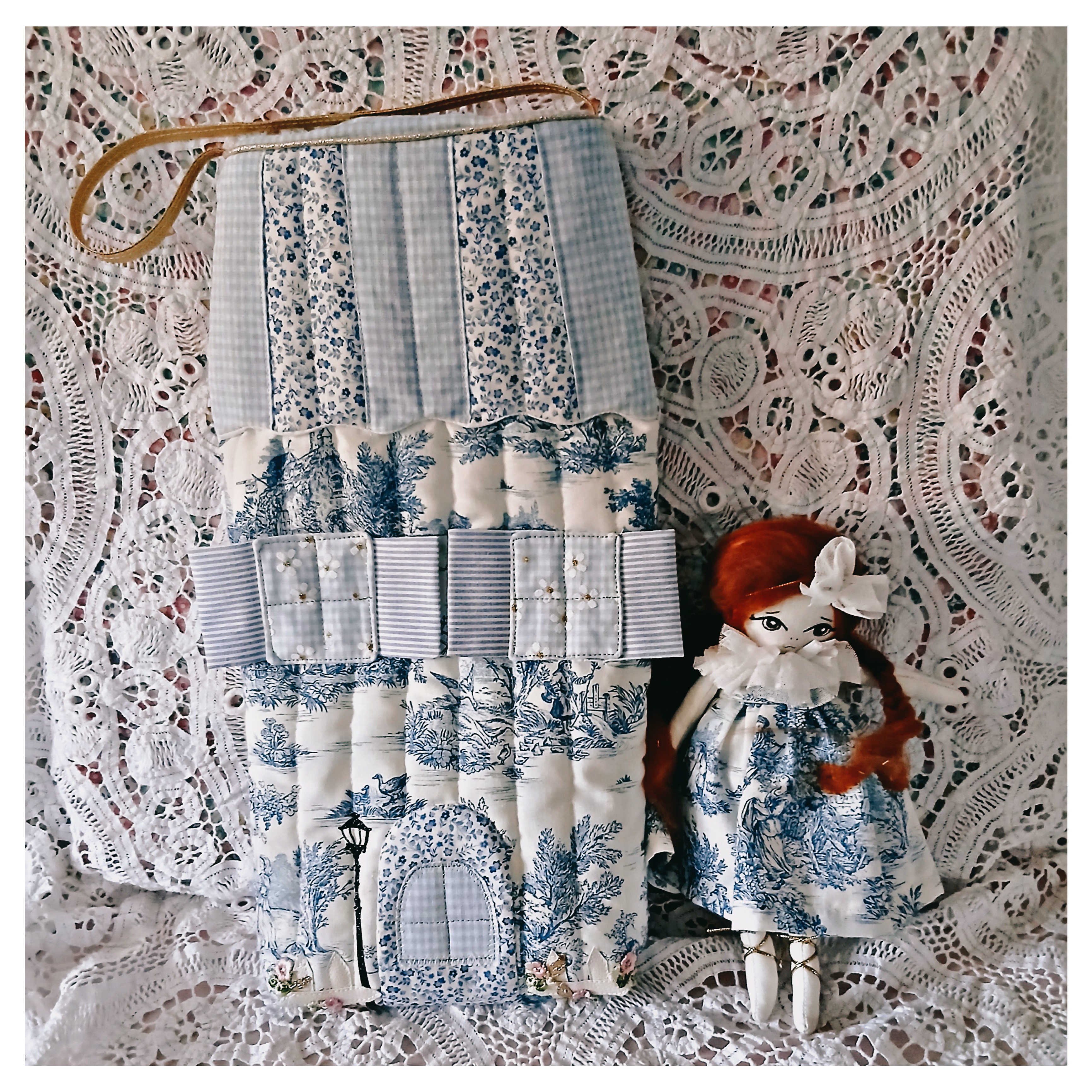 Un très joli sac en forme de maison principalement en toile de Jouy bleue, application de fenêtres, porte dans différents tissus , application de petites fleurs brodées. Il'mesure 40 cm de hauteur ( peut donc accueillir de grandes poupées comme les Barbies , et 20 cm de largeur .