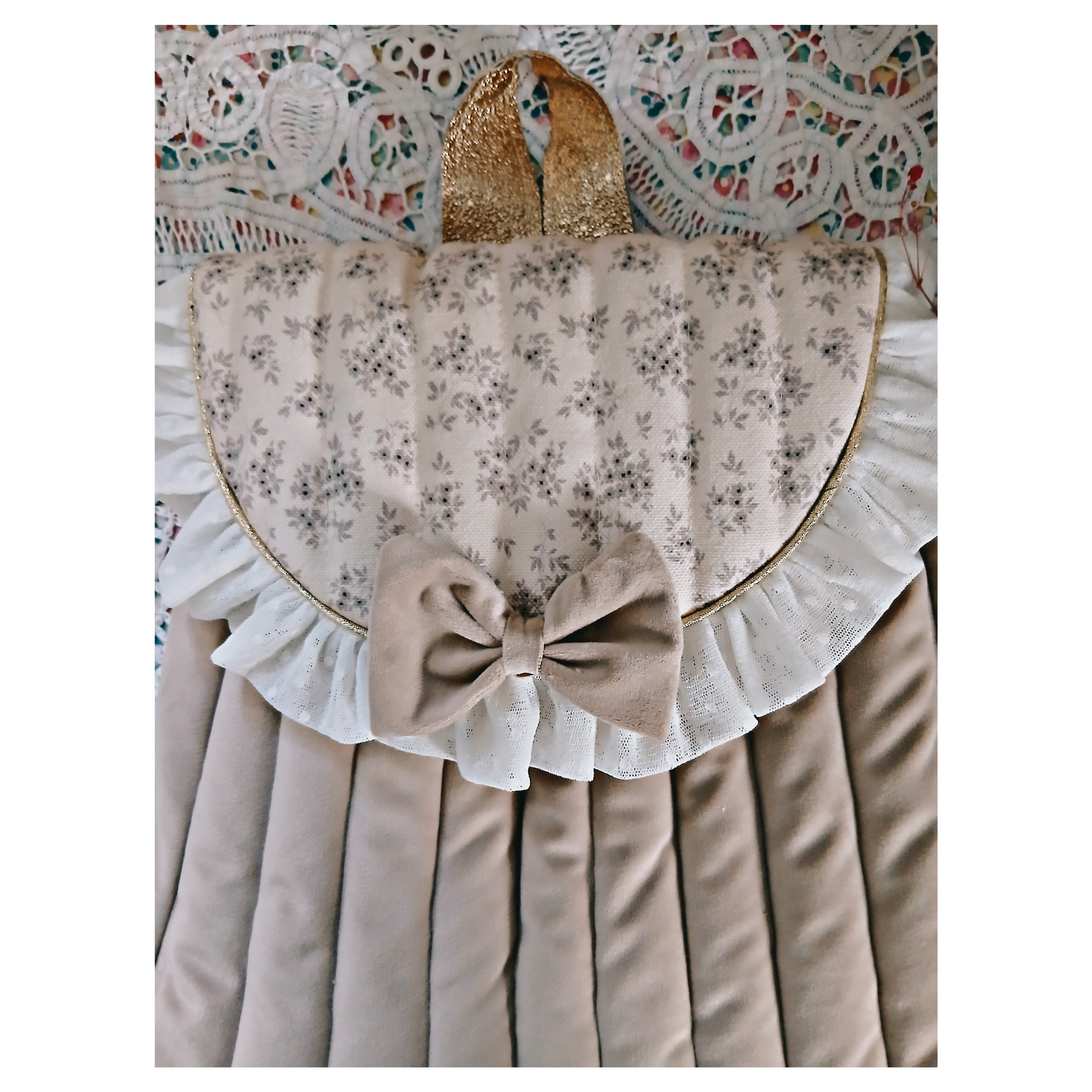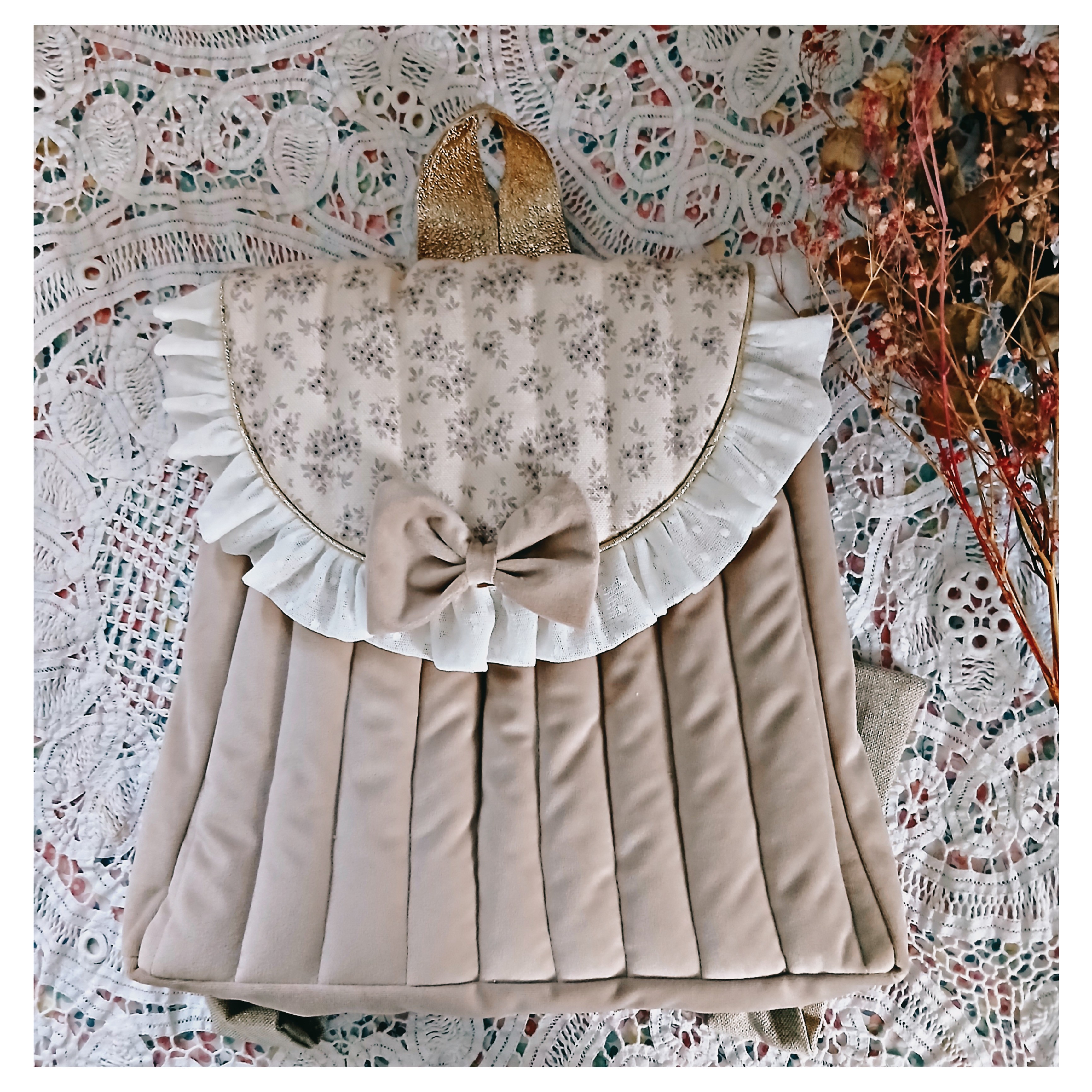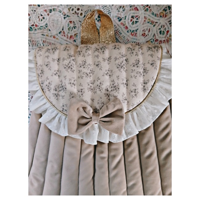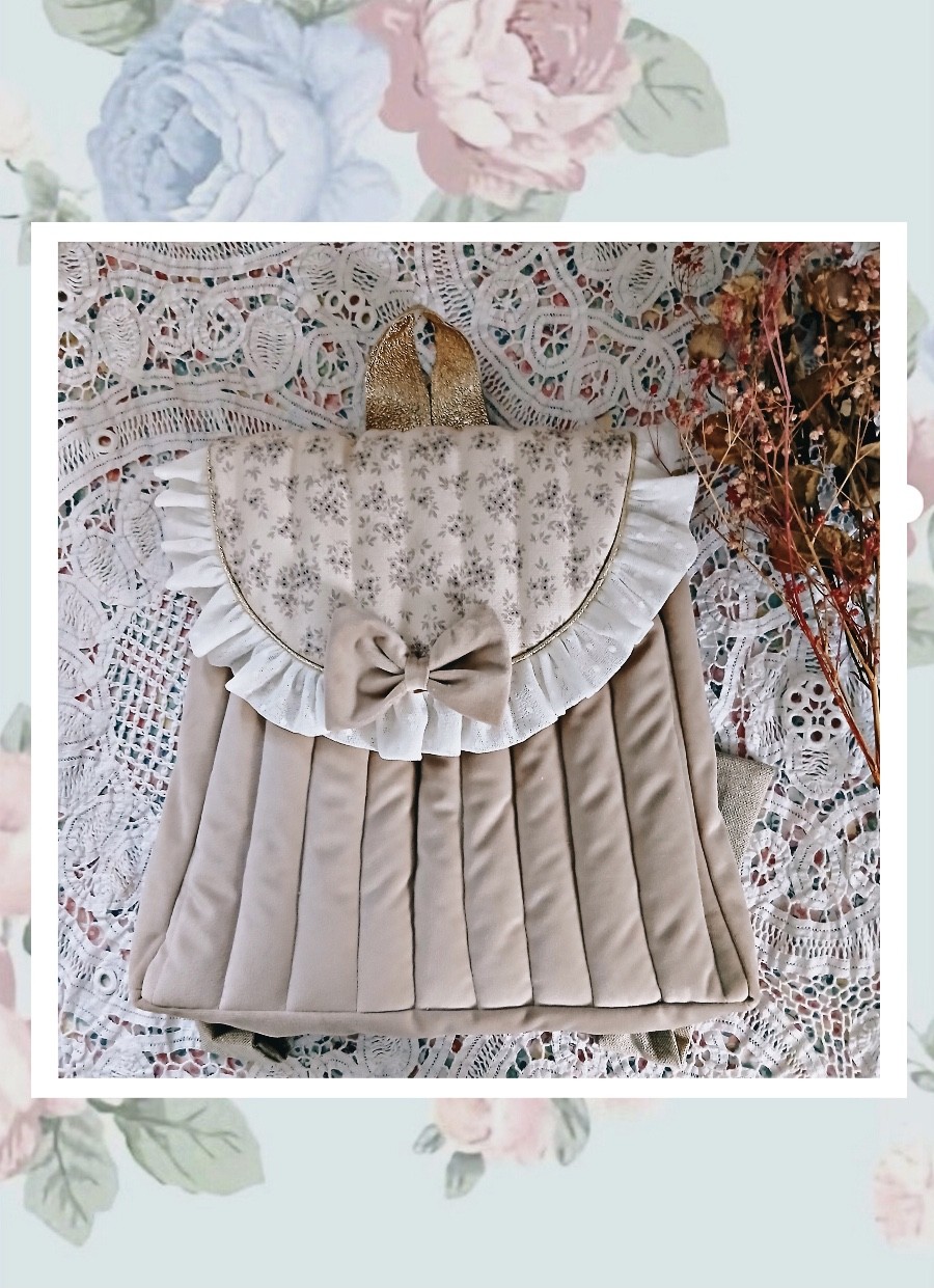 Il est en velours beige et matelassé . Le rabat est en toile coton imprmé de fleurs sur fond beige , avec un petit volant en tulle plumetis .La version cartable ( petit et grand ) se ferment avec une fermeture cartable dorée , les versions mini et sac à dos se ferment avec un bouton aimanté.