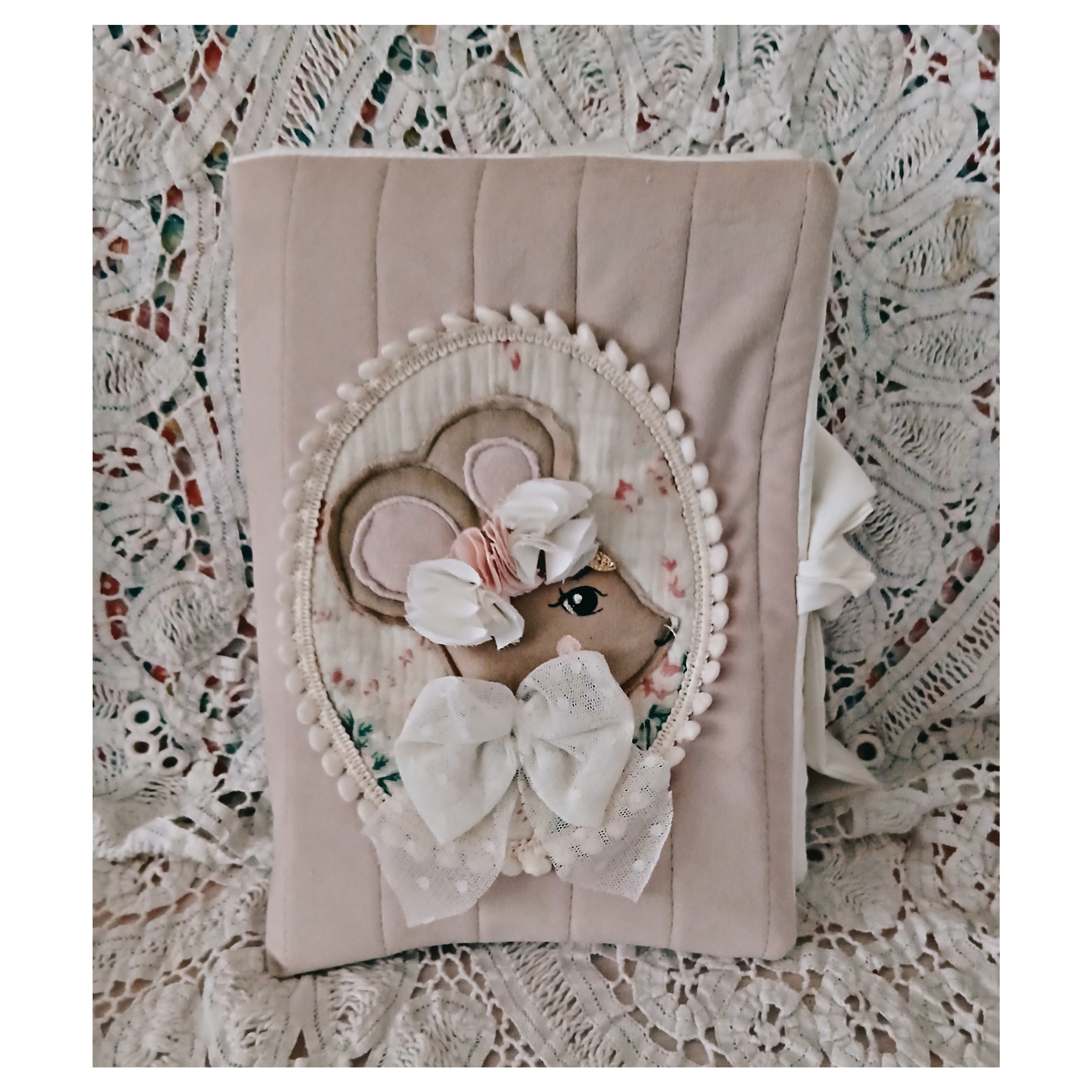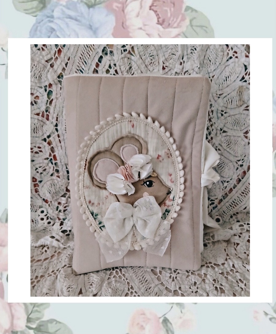 Il est en velours rose et matelassé. Il se ferme avec des liens , il est doublé de coton ivoire .