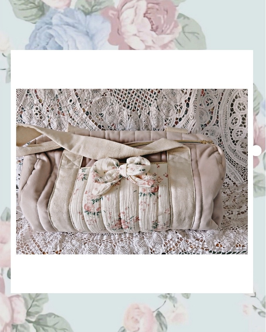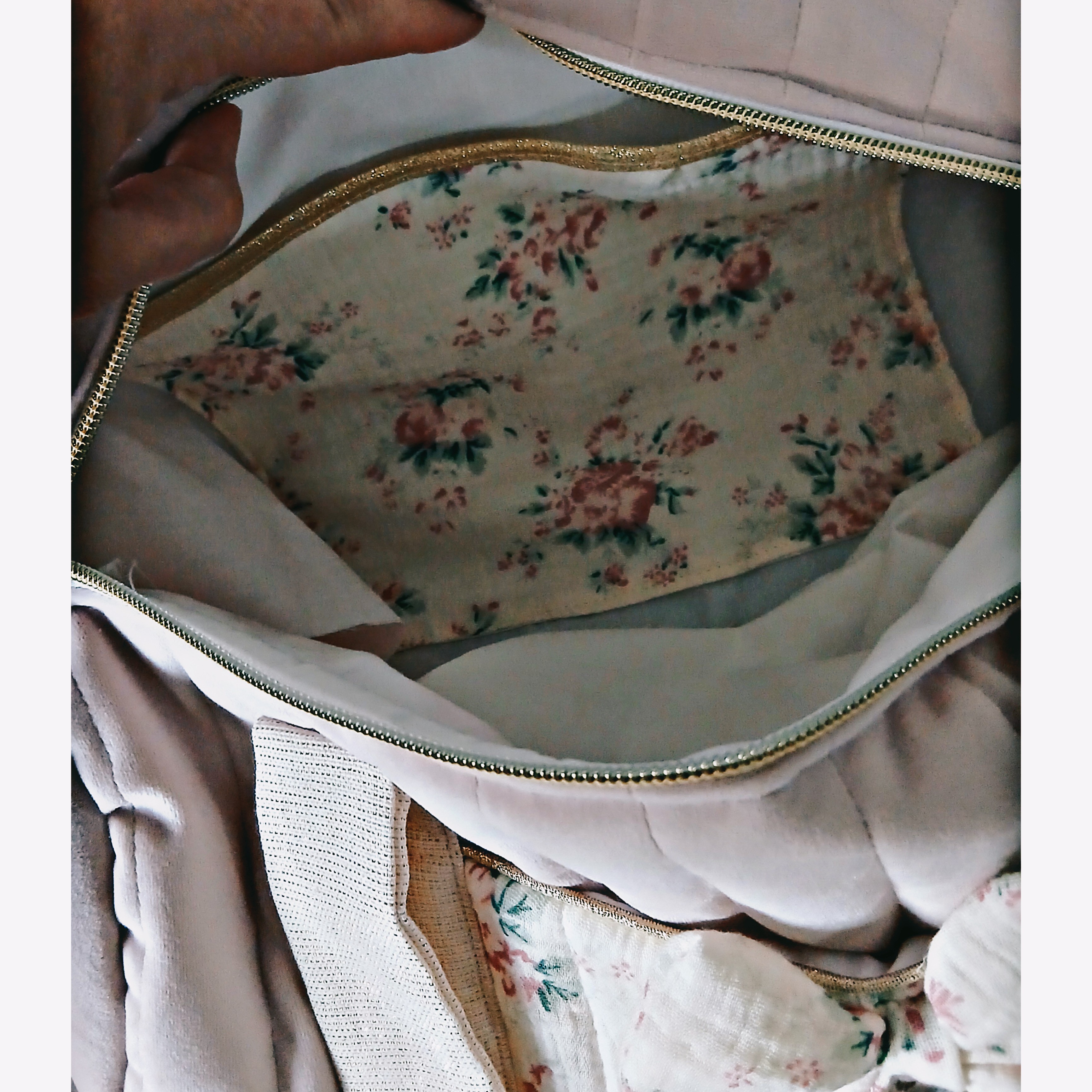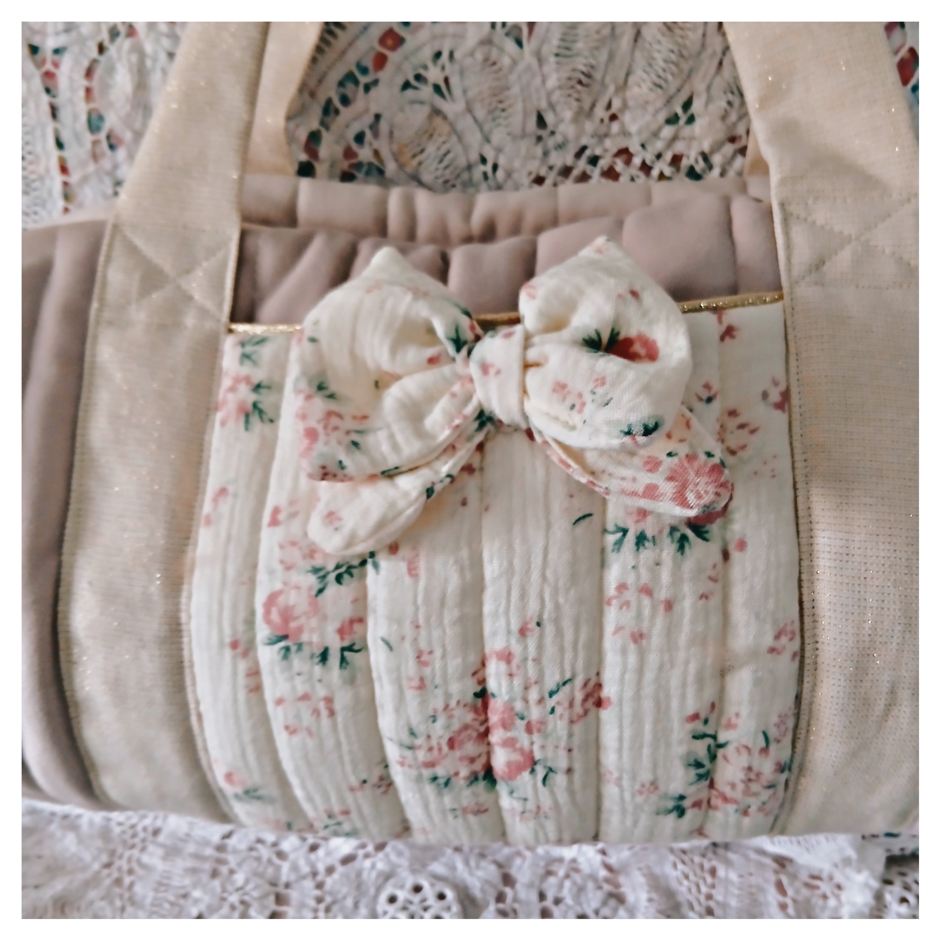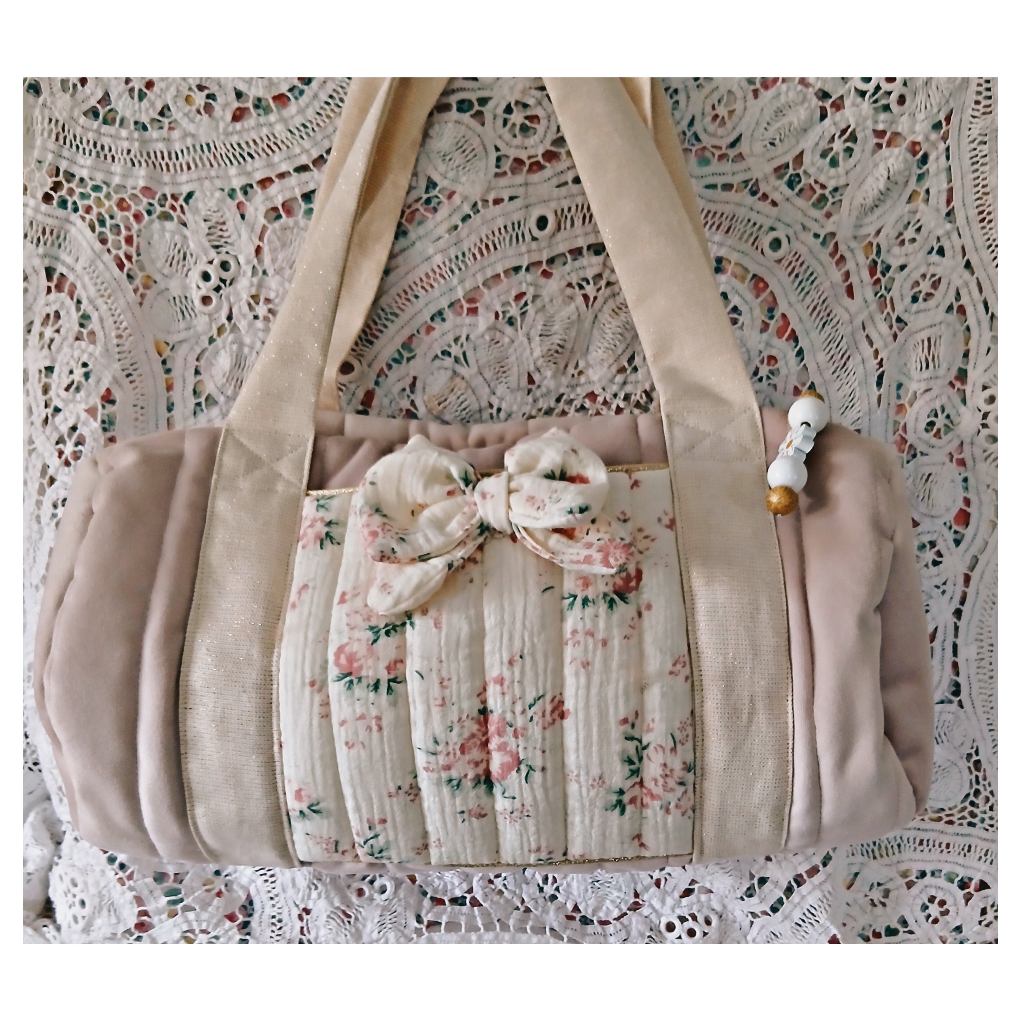 Sac bowling pour enfants en velours rose matelassé et doublé de coton ivoire uni , petite poche intérieure. Poche extérieure en double gaze fleuri matelassée avec un noeud .