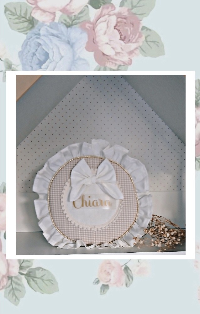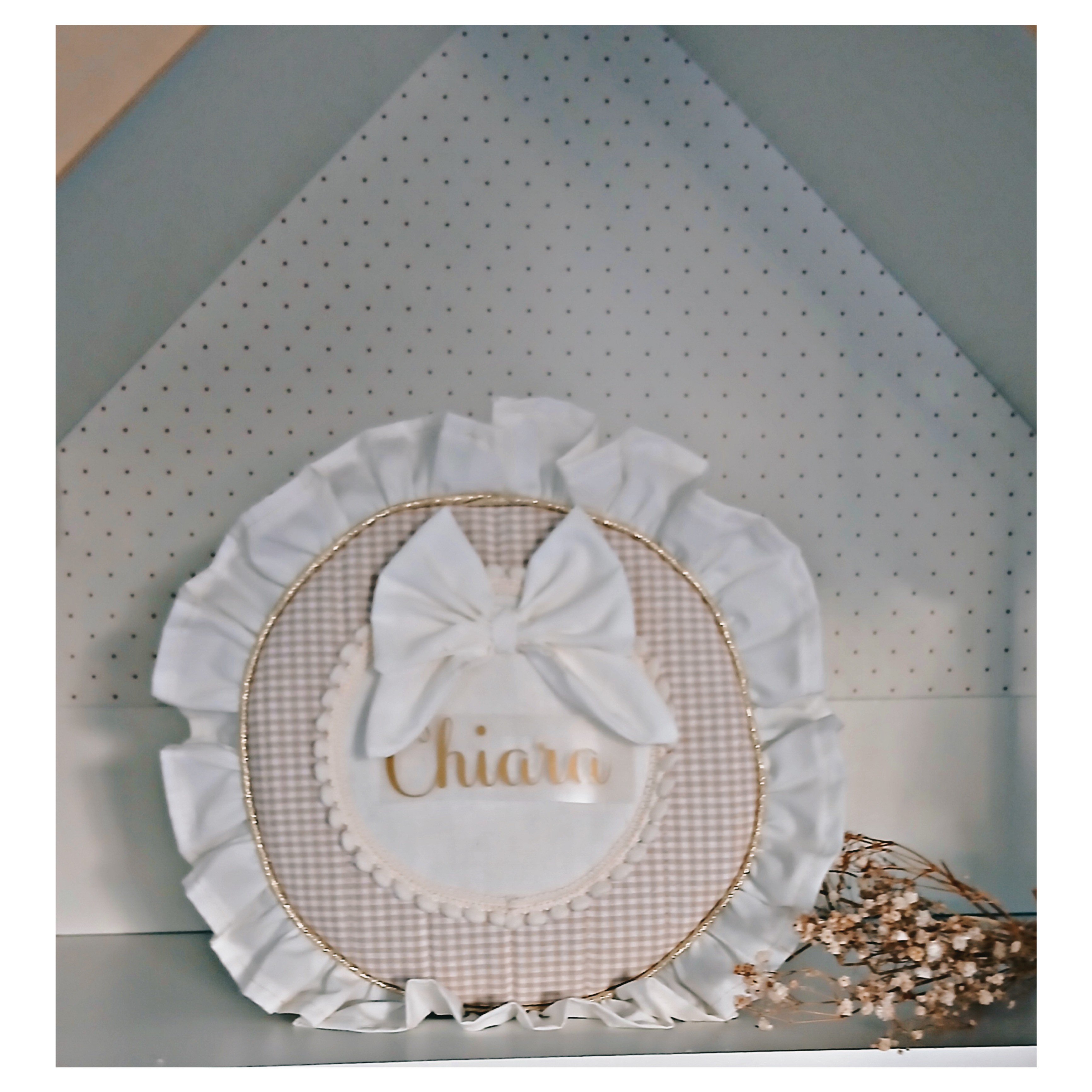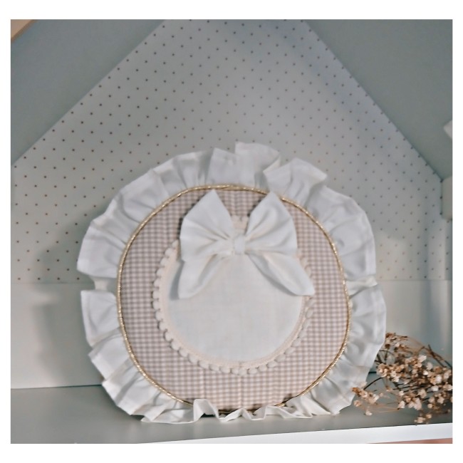 Médaillon en double gaze orné d'un joli galon pompons et d'un petit noeud , petit volant blanc cassé tout autour du sac .
