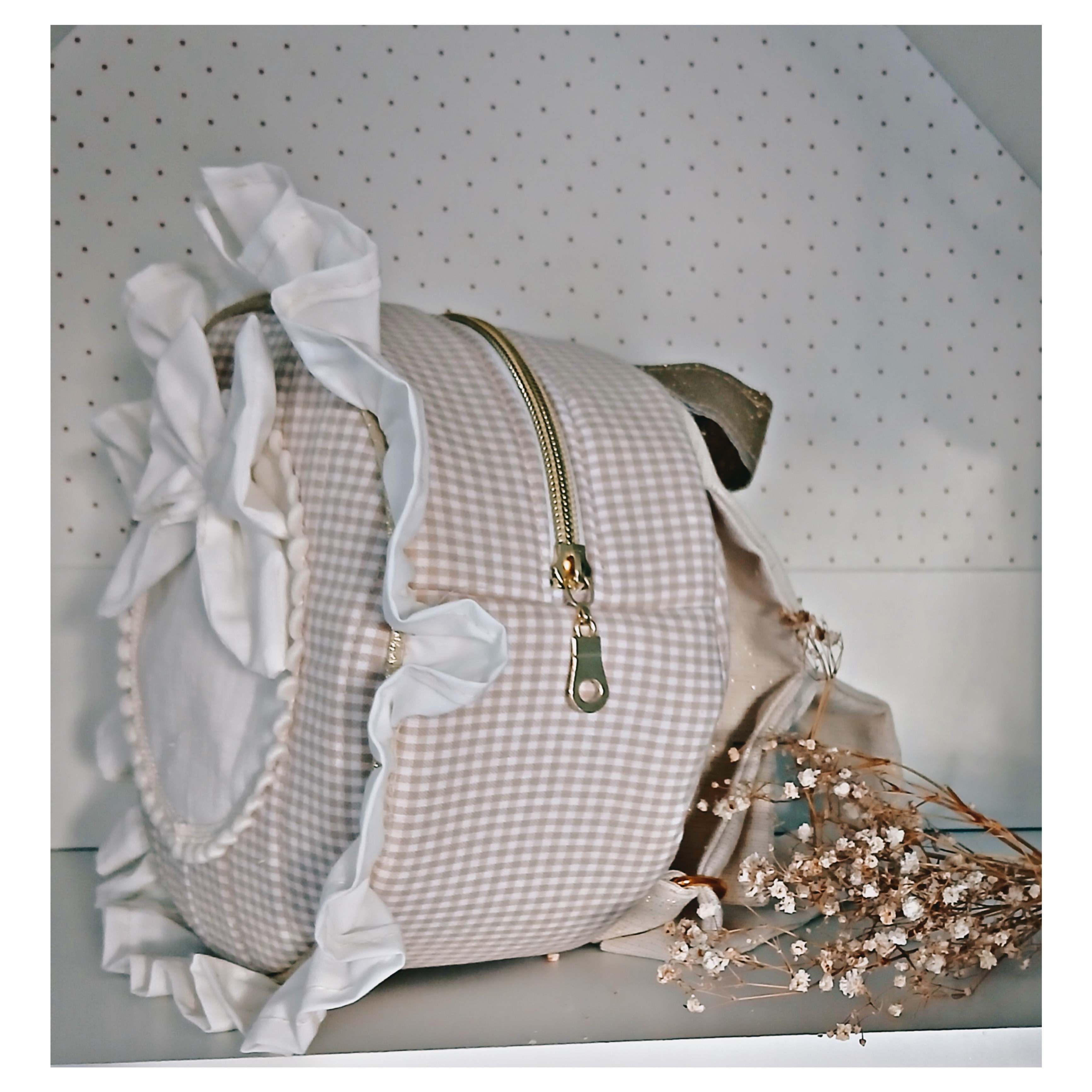 Le sac mesure 20 cm de diamètre, profondeur 10 cm environ . Il se ferme avec une fermeture éclair dorée . Il est doublé avec un coton imprimé petits coeurs beige sur fond blanc .