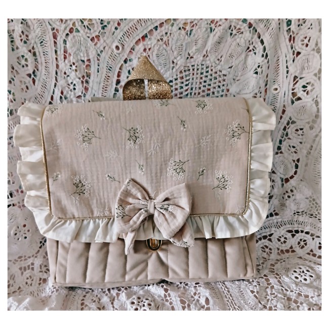Il est en velours beige et matelassé . Le rabat est en double gaze avec un petit volant . .