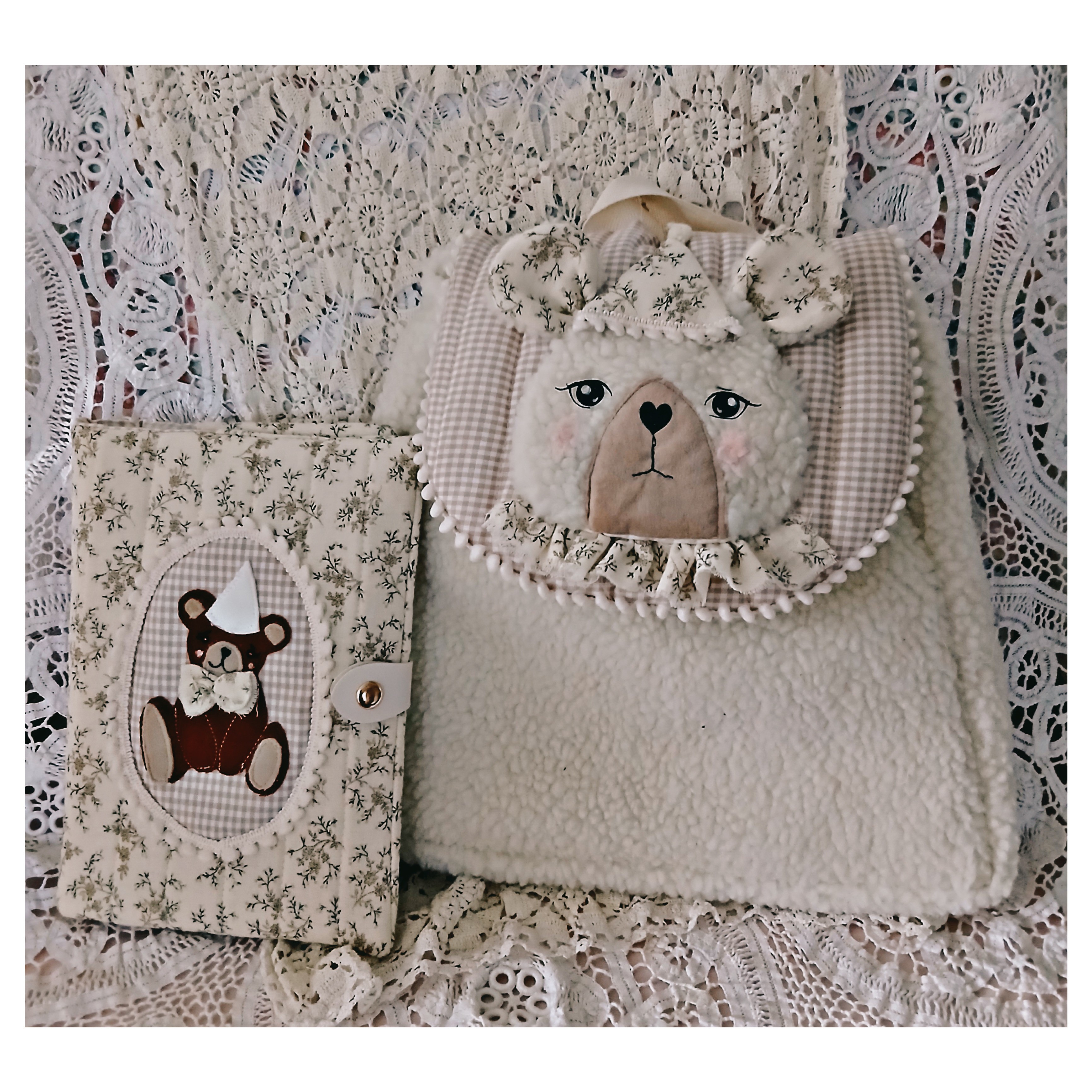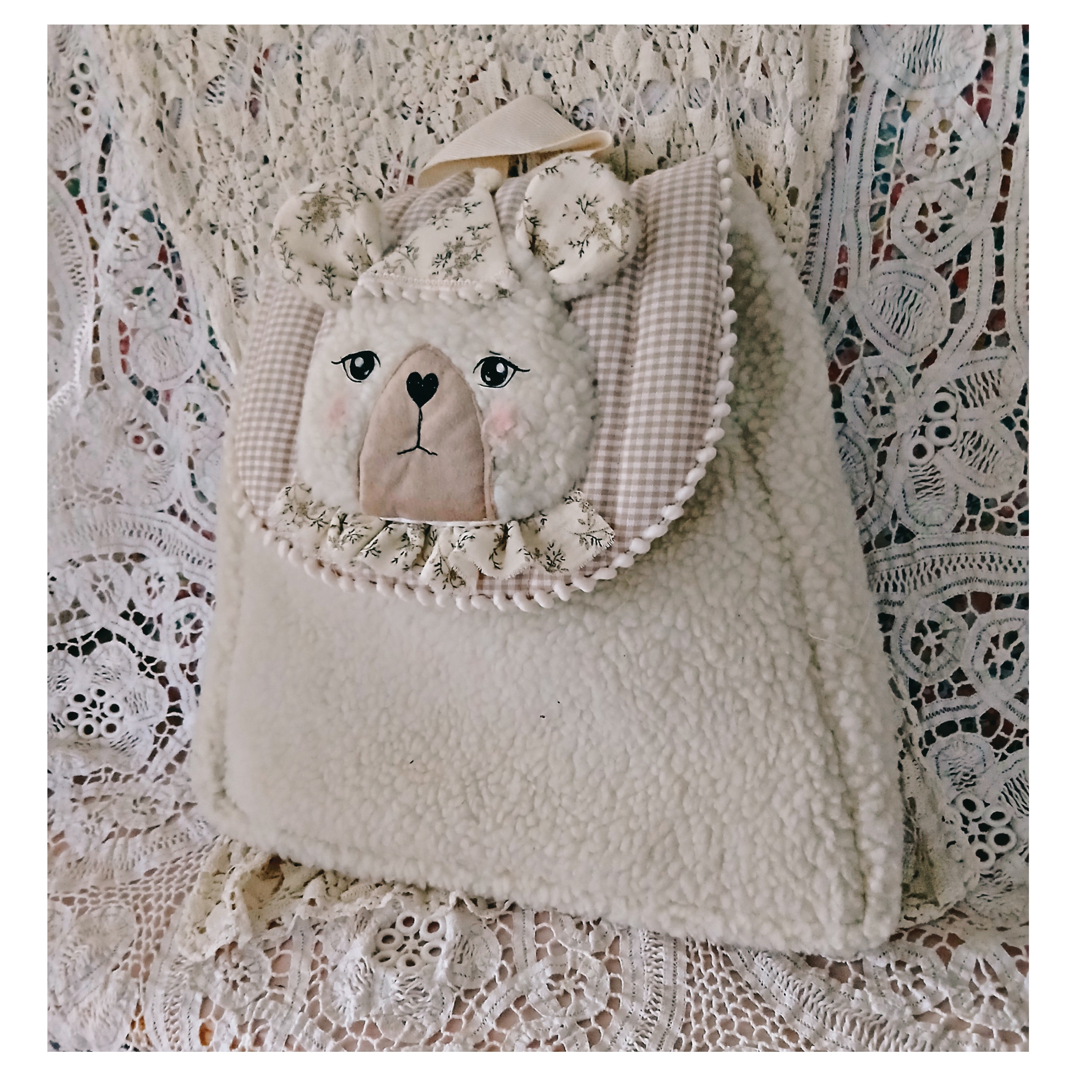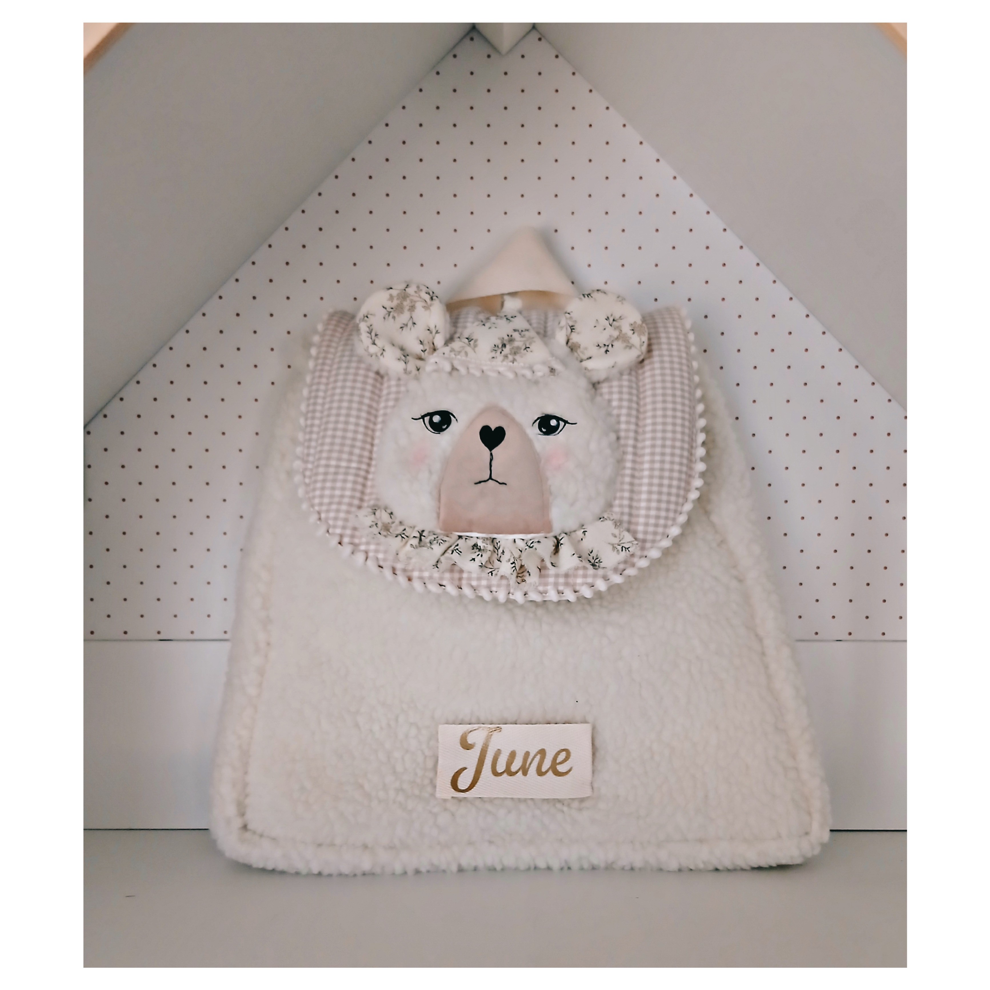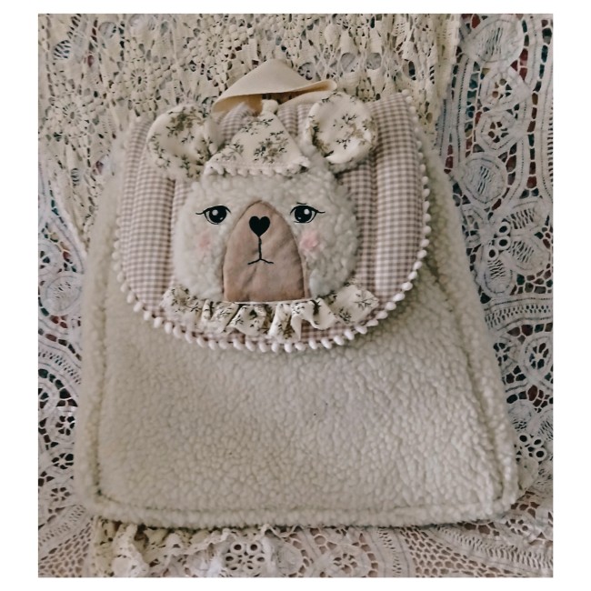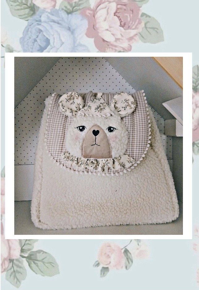 Ce cartable ou sac à dos est en fausse fourrure bouclette ivoire . Le rabat est en coton vichy matelassé, l l'application d'une tête d'ours est en fausse fourrure, les jeux et le nez sont en flex thermocollant noir . Is se ferme avec un bouton aimanté. Il est doublé de coton ivoire .