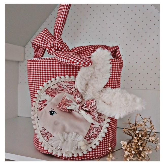 Petit panier de Pâques pour aller récolter les œufs en vichy rouge et blanc , application d'une tête de lapin en velours rose.
