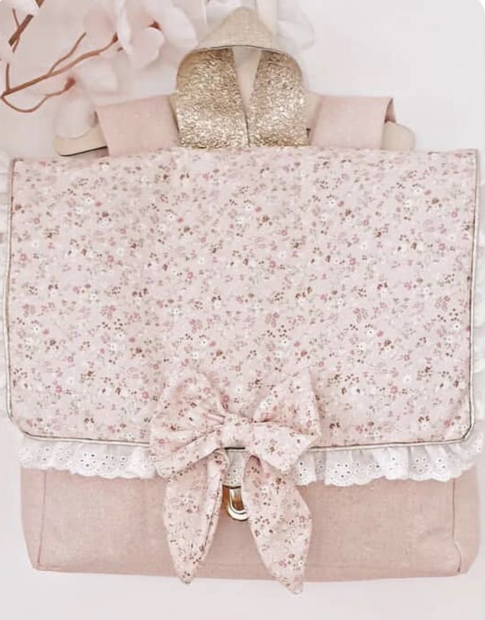 Mini cartable en coton rose pailleté matelassé , rabat en coton fleuri rose avec petit volant en broderie anglaise de couleur blanc .