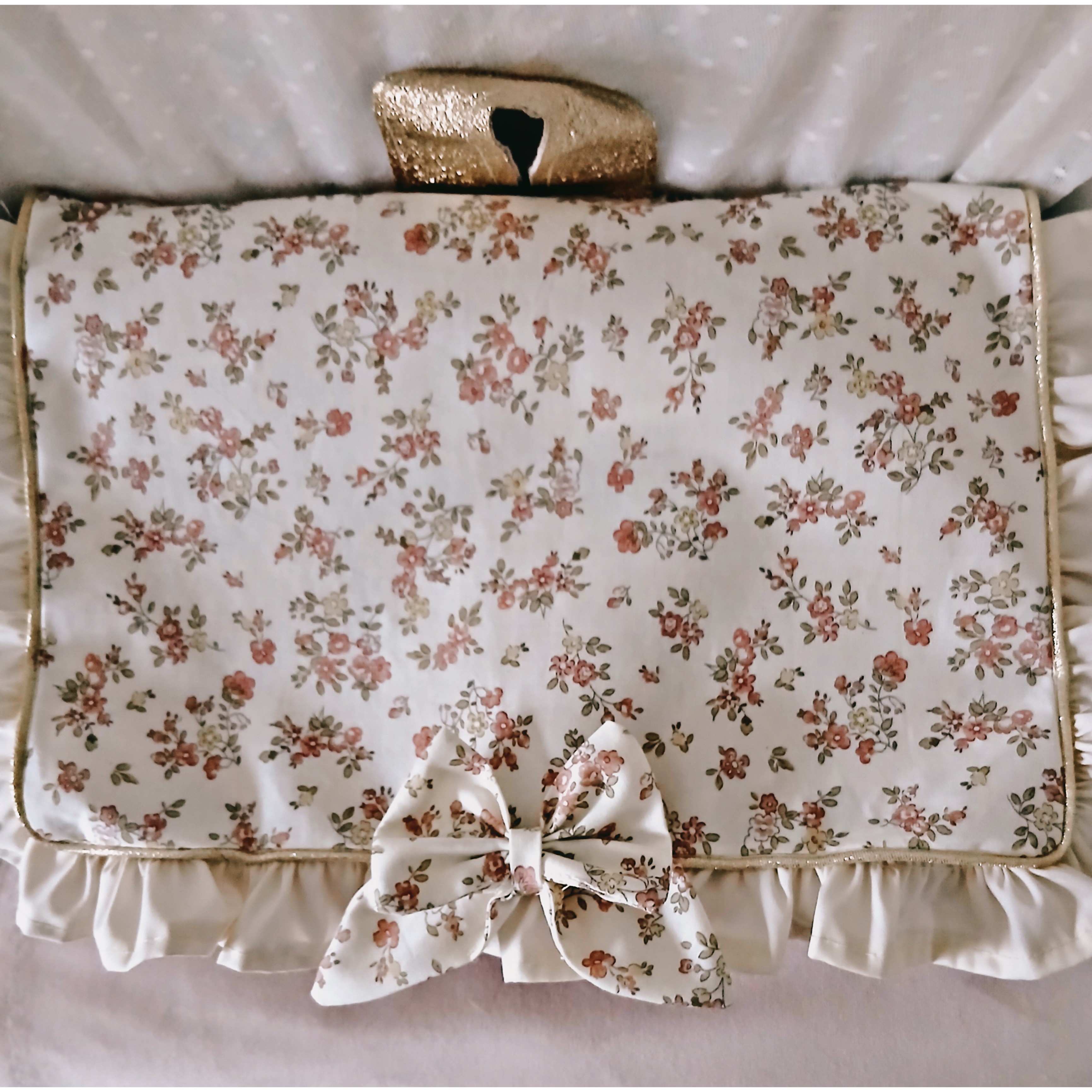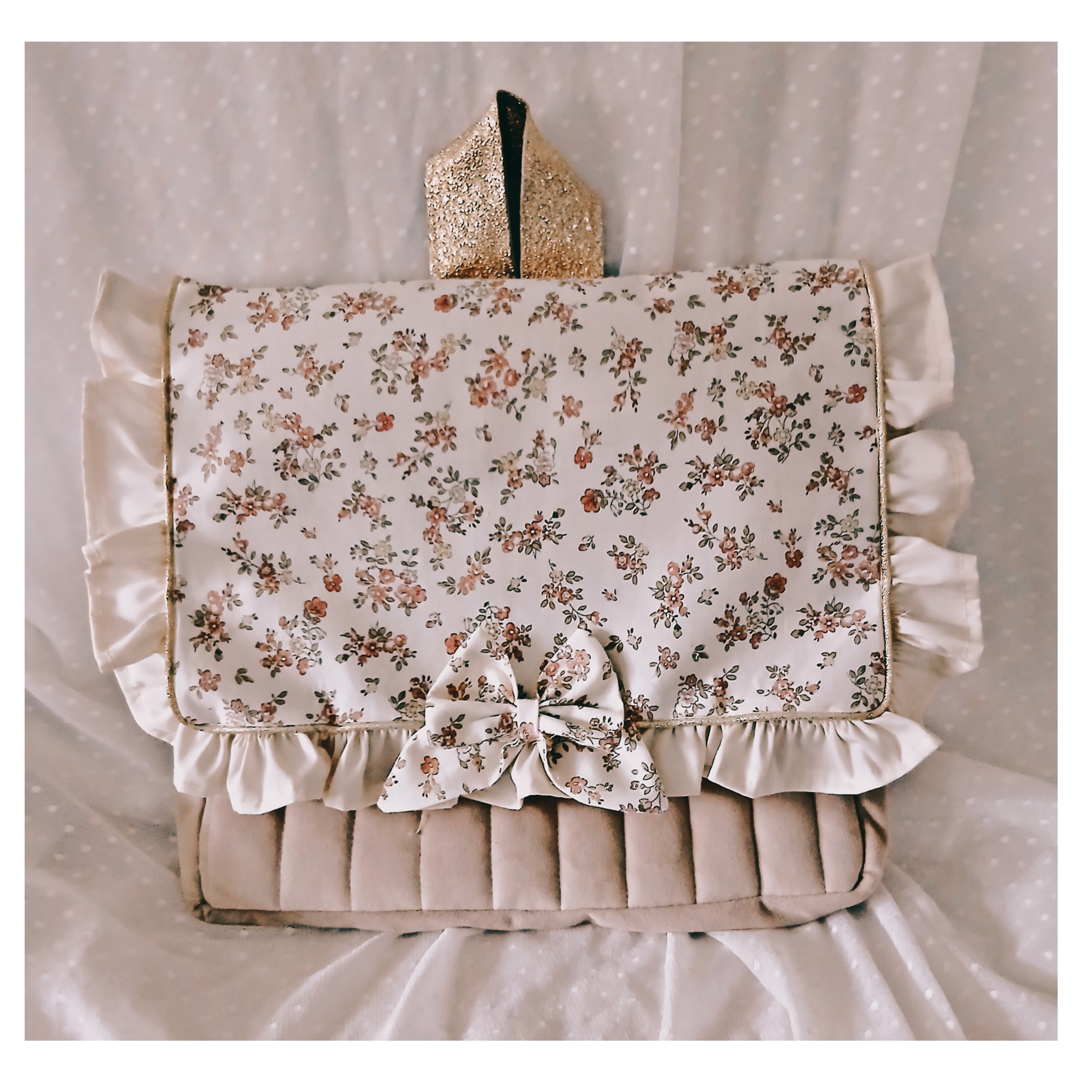est en velours beige ou en velours rose et matelassé . Le rabat est en coton fleuri avec un petit volant couleur ivoire .