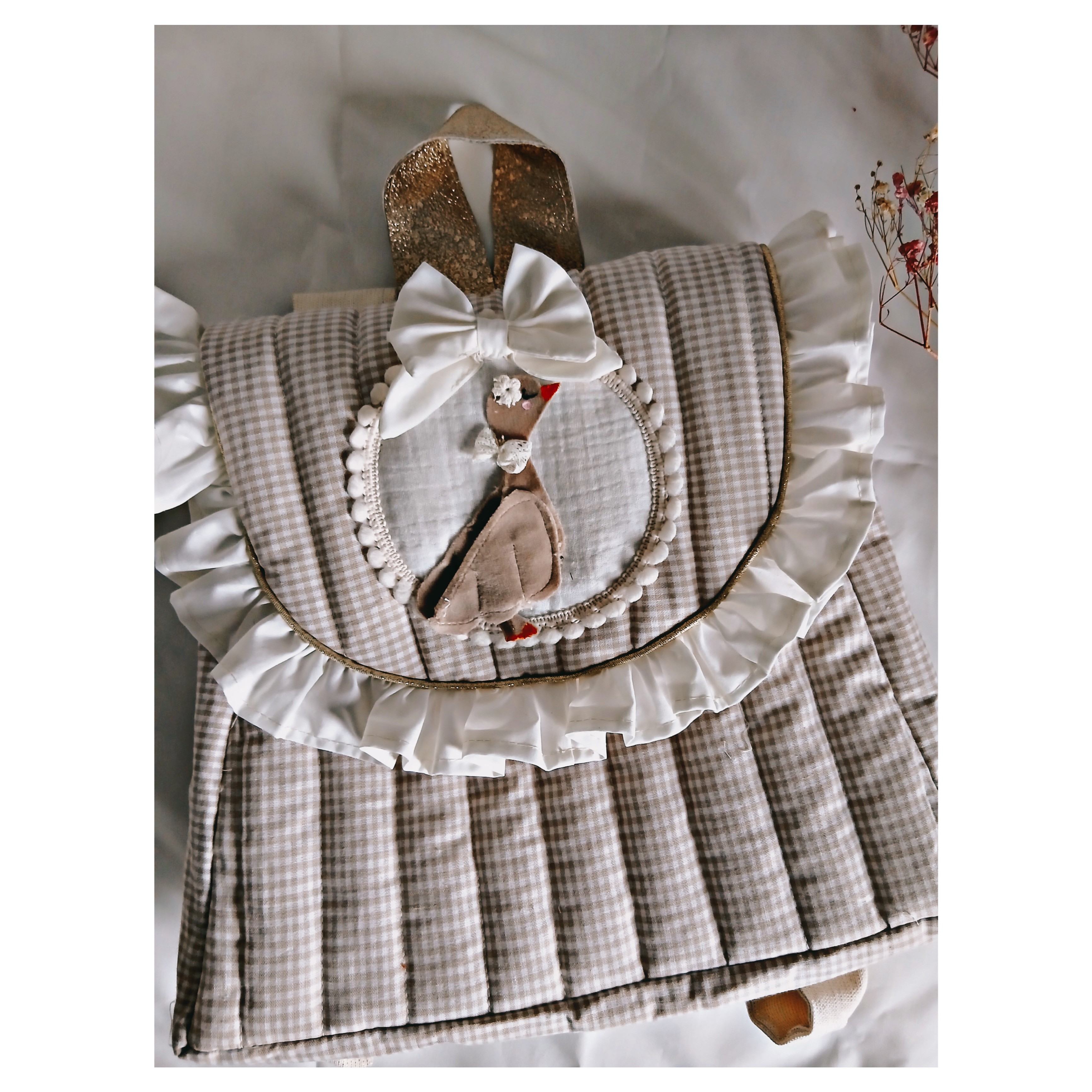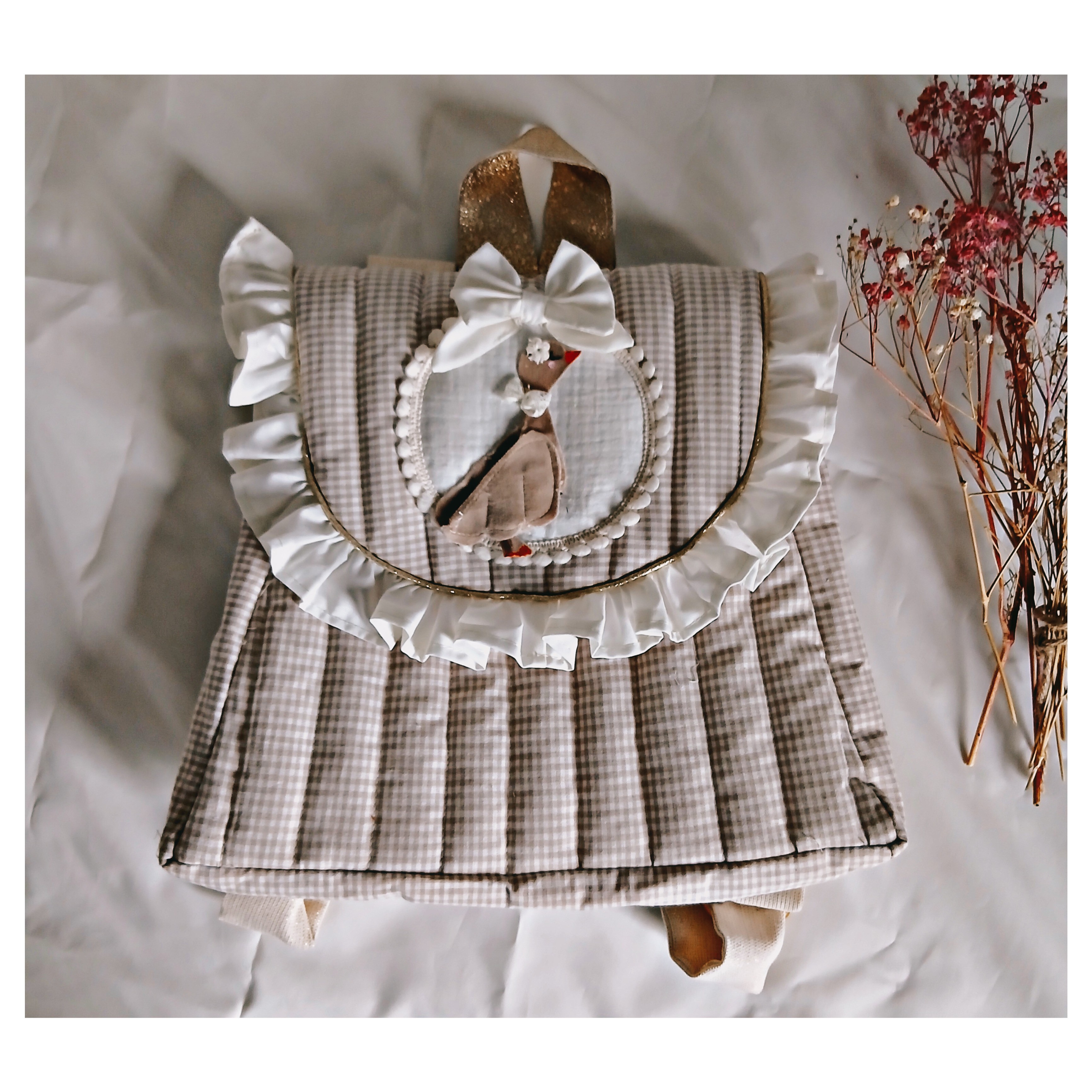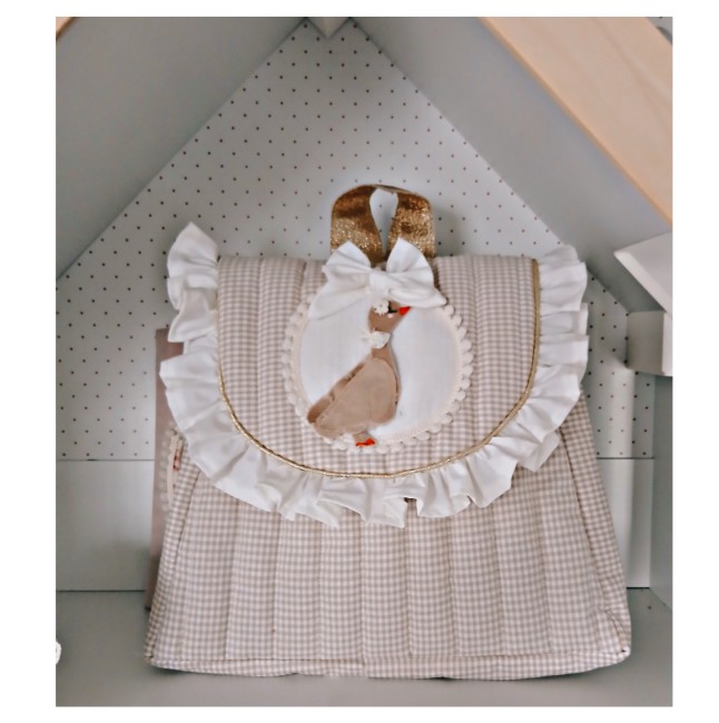 Sac à dos en coton vichy beige tout matelassé doublé de coton uni avec un petit volant en coton ivoire .