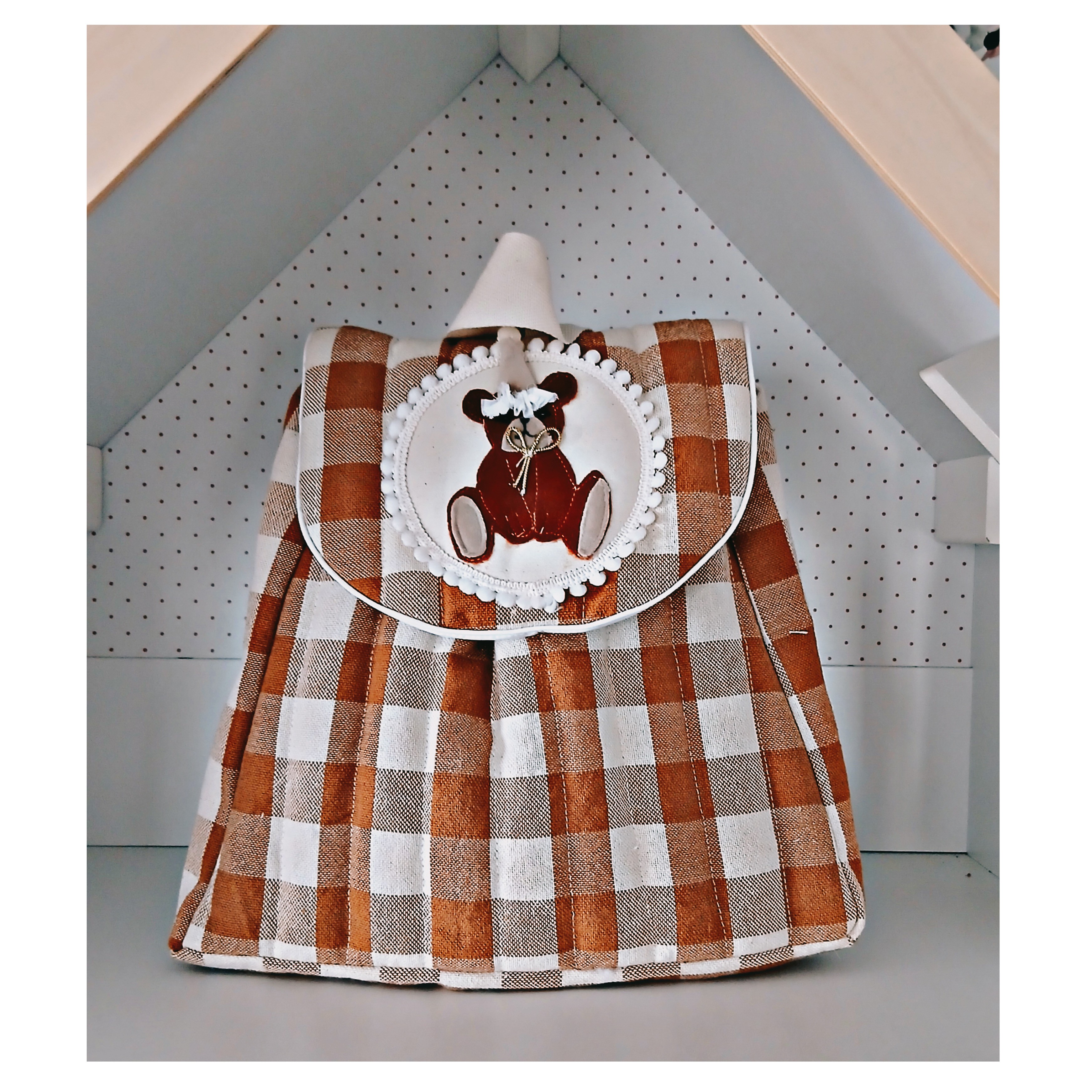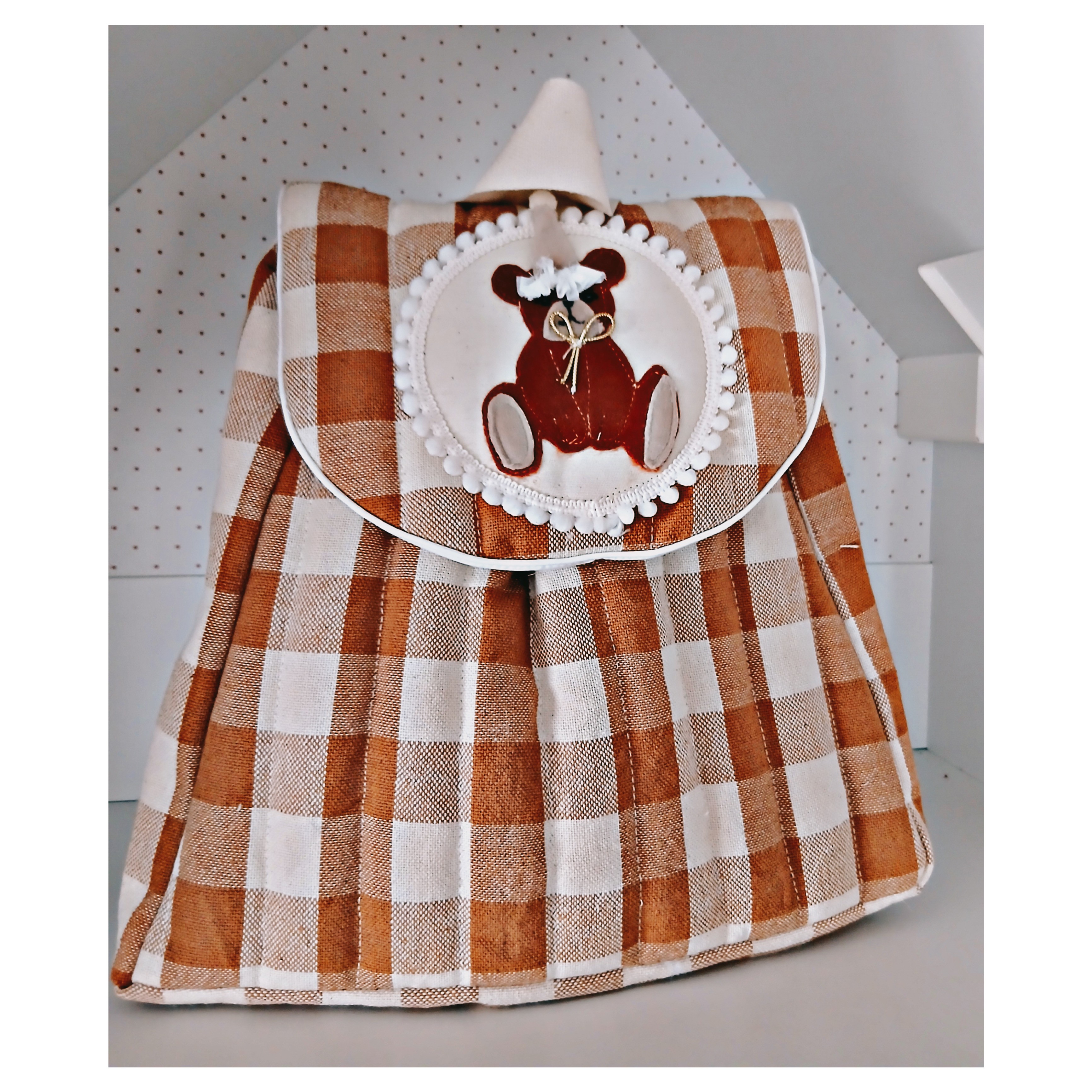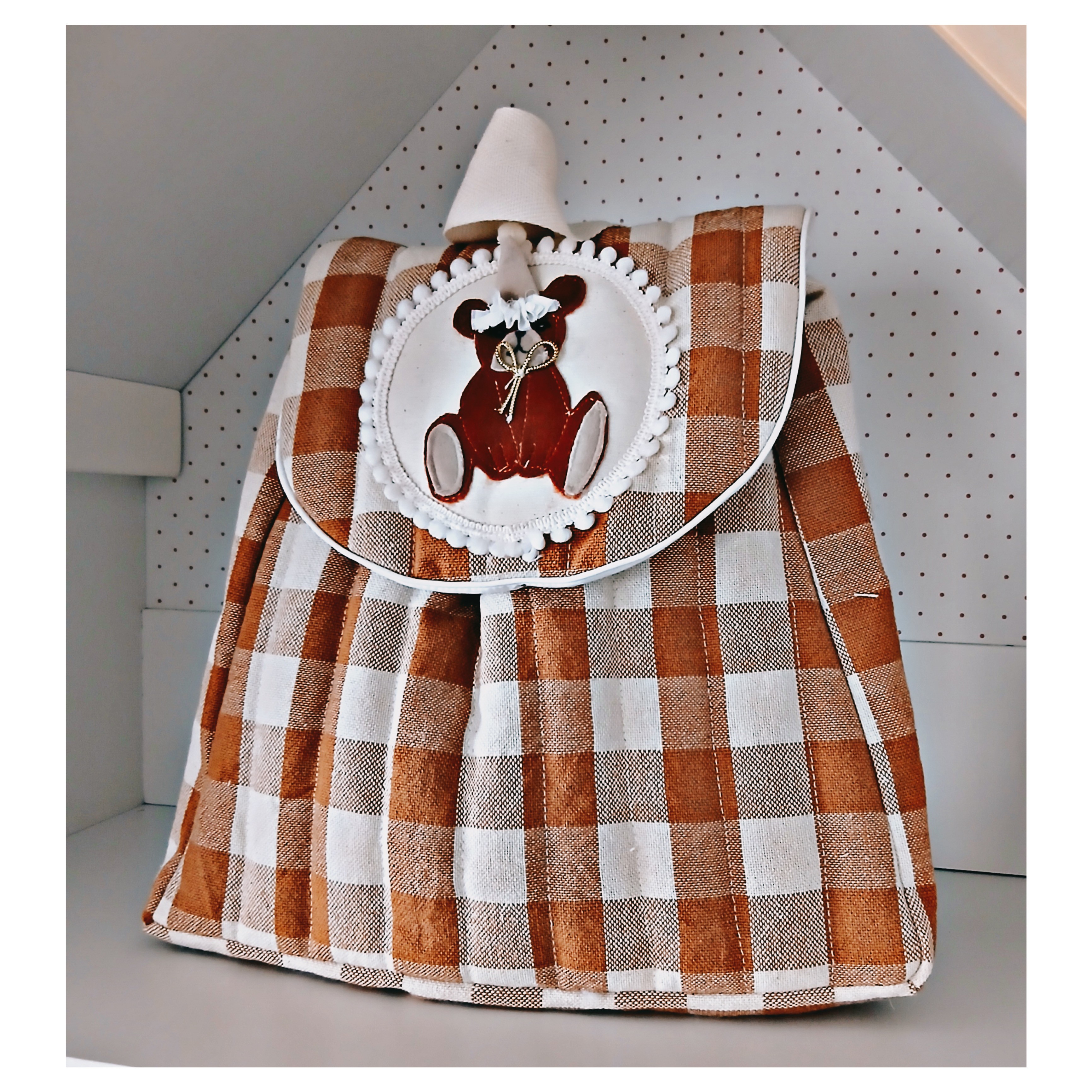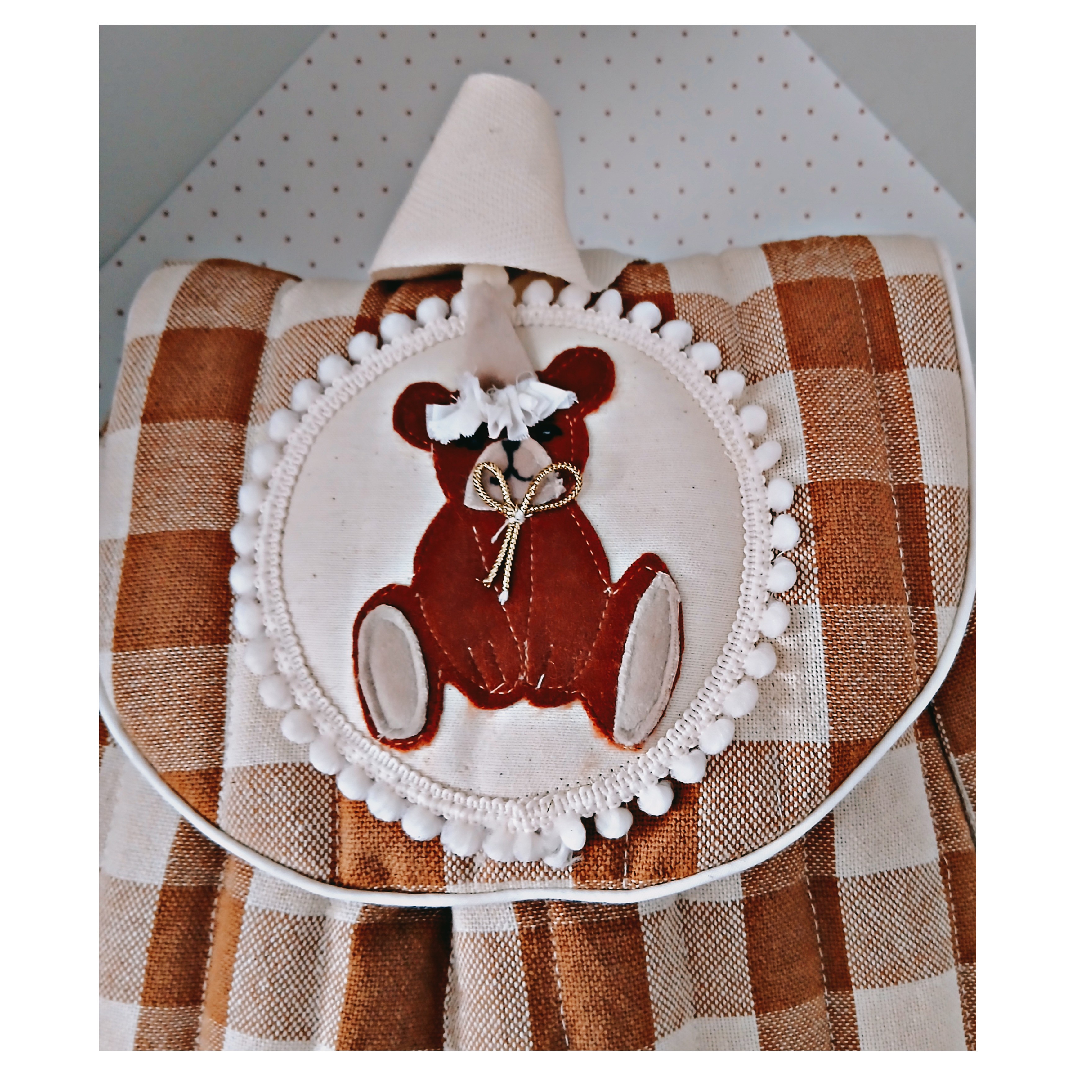 Sac à dos en toile de coton à carreaux marron et beige , le sac est matelassé , sur le rabat un joli médaillon avec une application en velours reeprésentant un ourson entouré d'un galon pompons .