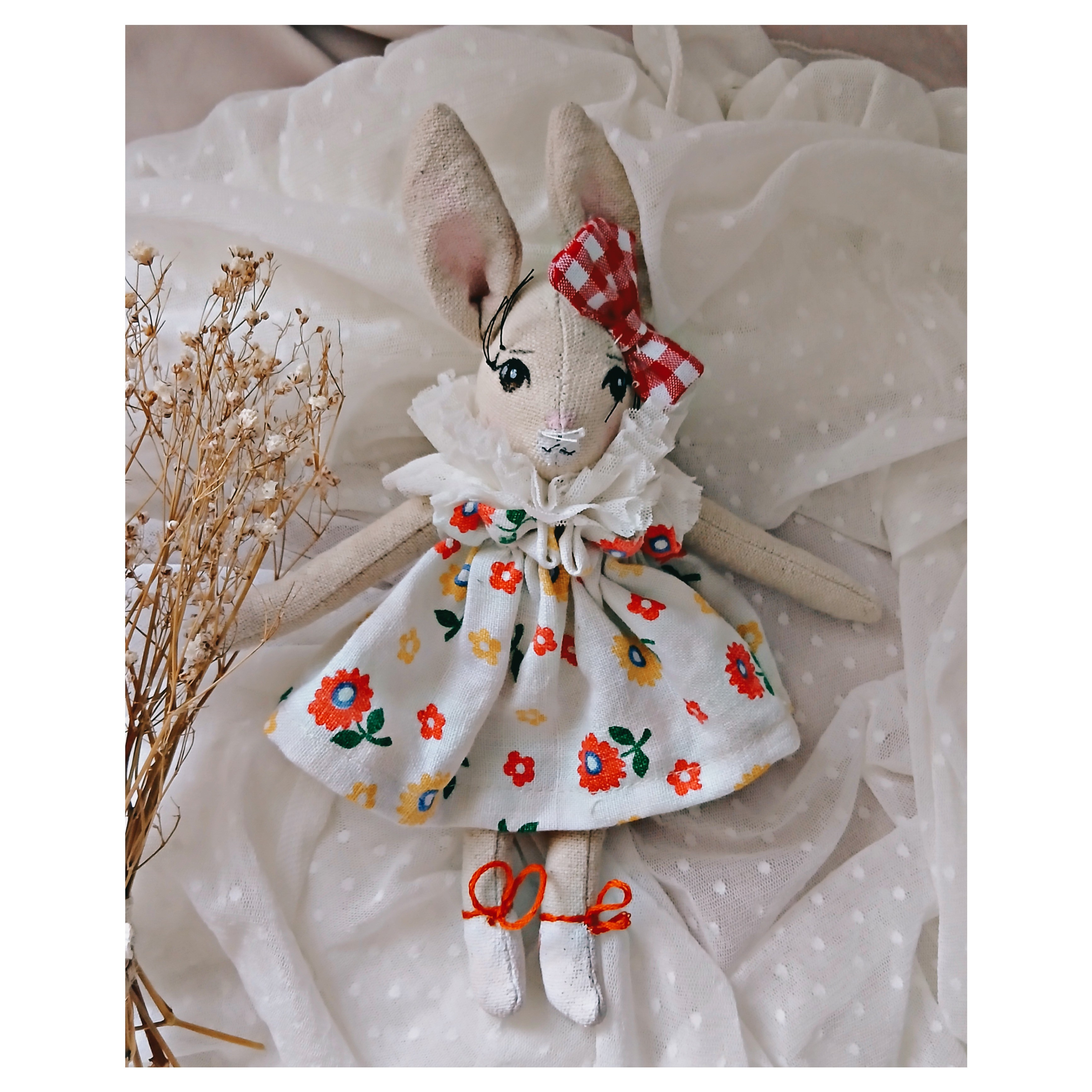 Une belle alternative aux traditionnels chocolats de Pâques, cette petite poupée ravira le cœur de vos enfants. Elle est en lin et coton , rembourrée de ouate synthétique. Elle est vêtue d'une robe en coton fleurie ( non amovible) et d'une collerette en tulle , ses pieds et son visage sont peints . Elle mesure environ 22 cm . Elle peut être vendue avec son pochon en velours rose doublé de coton uni . Dimensions du pochon 27 cm sur 21 cm environ.