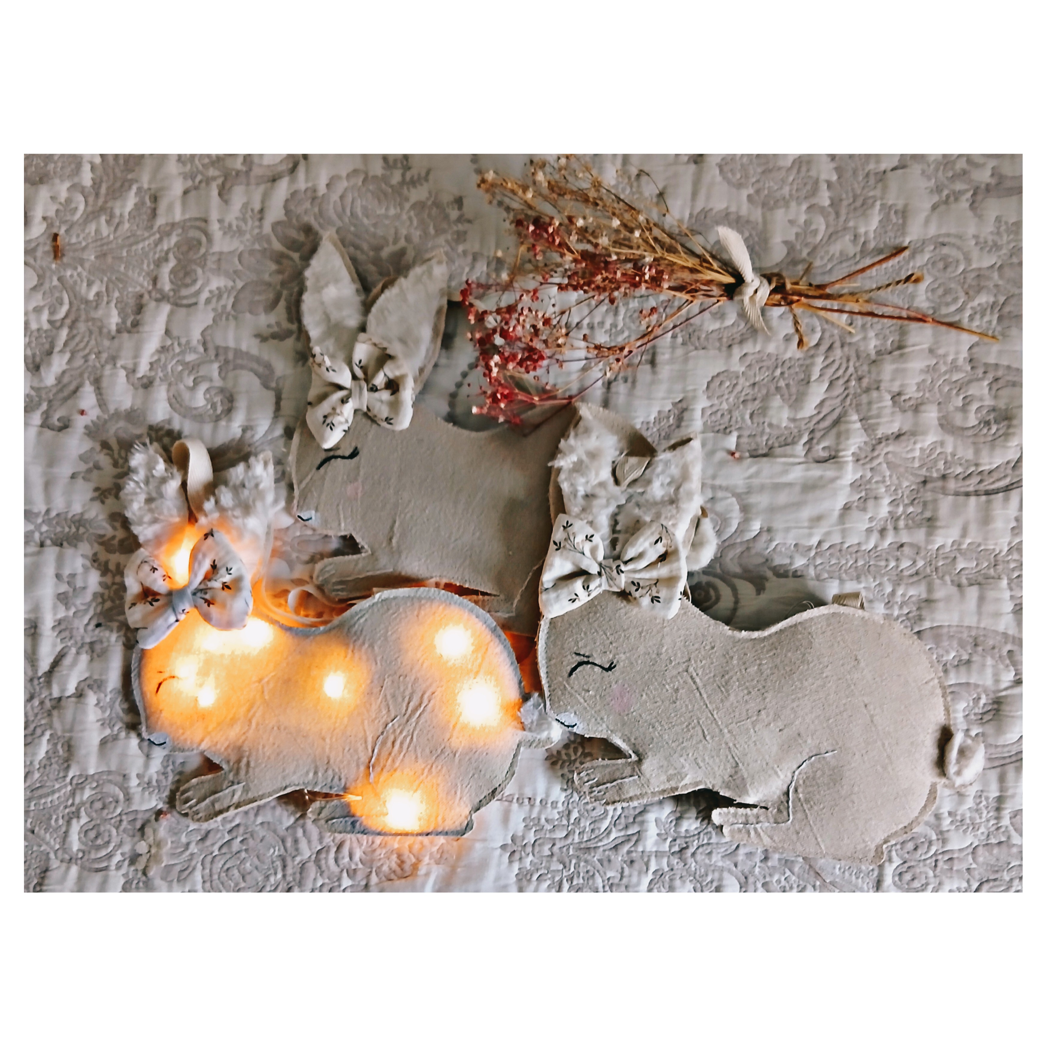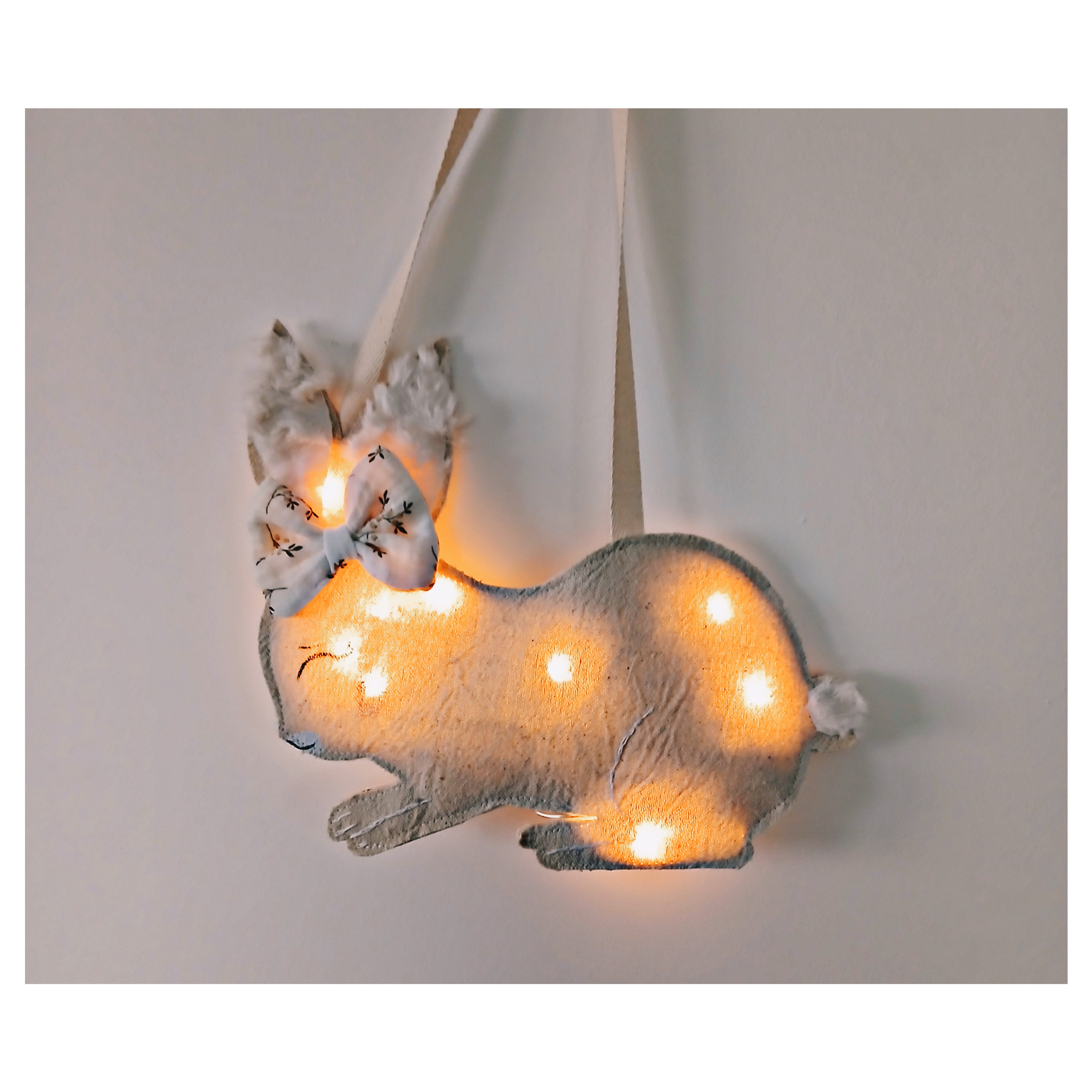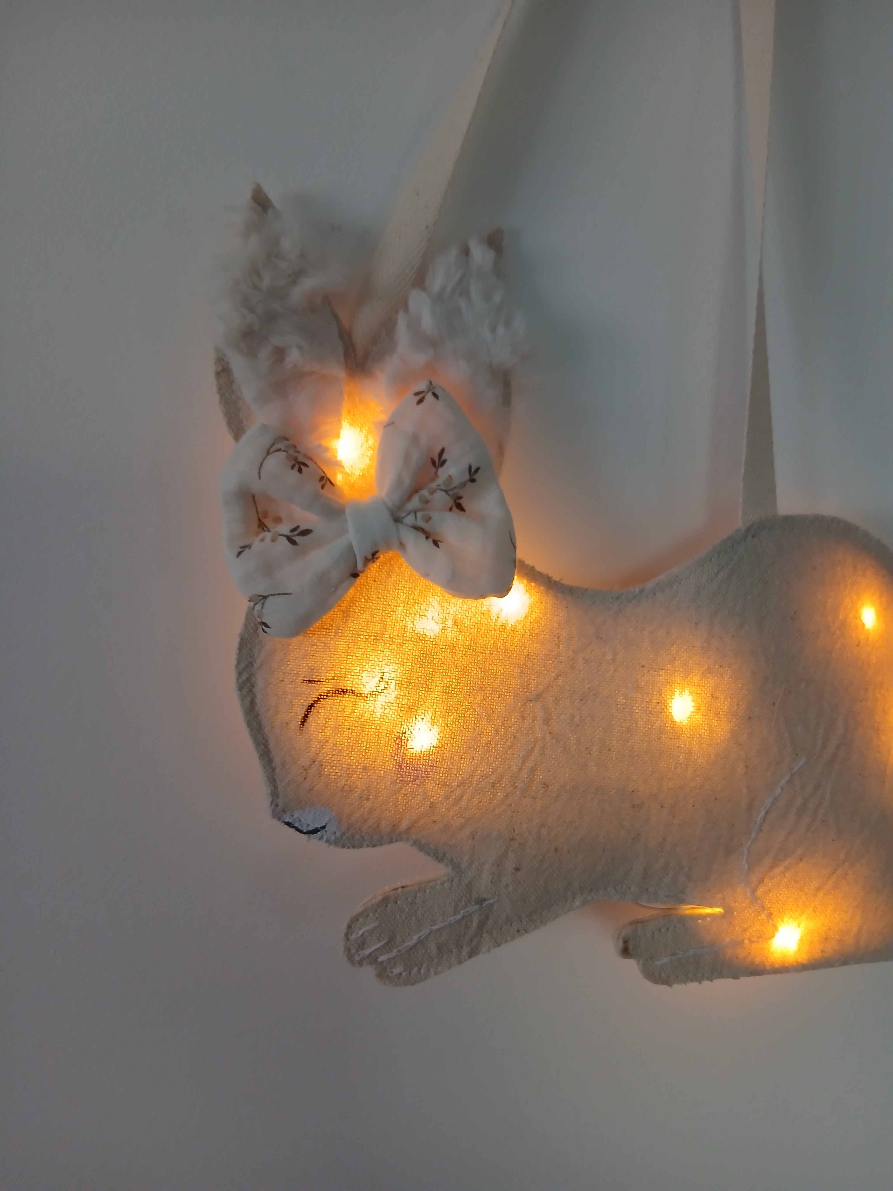 Une jolie veilleuse qui rassurera votre enfant la nuit tout en décorant joliment sa chambre . Elle est en lin et coton , application de fausse fourrure ivoire , les yeux sont peints .