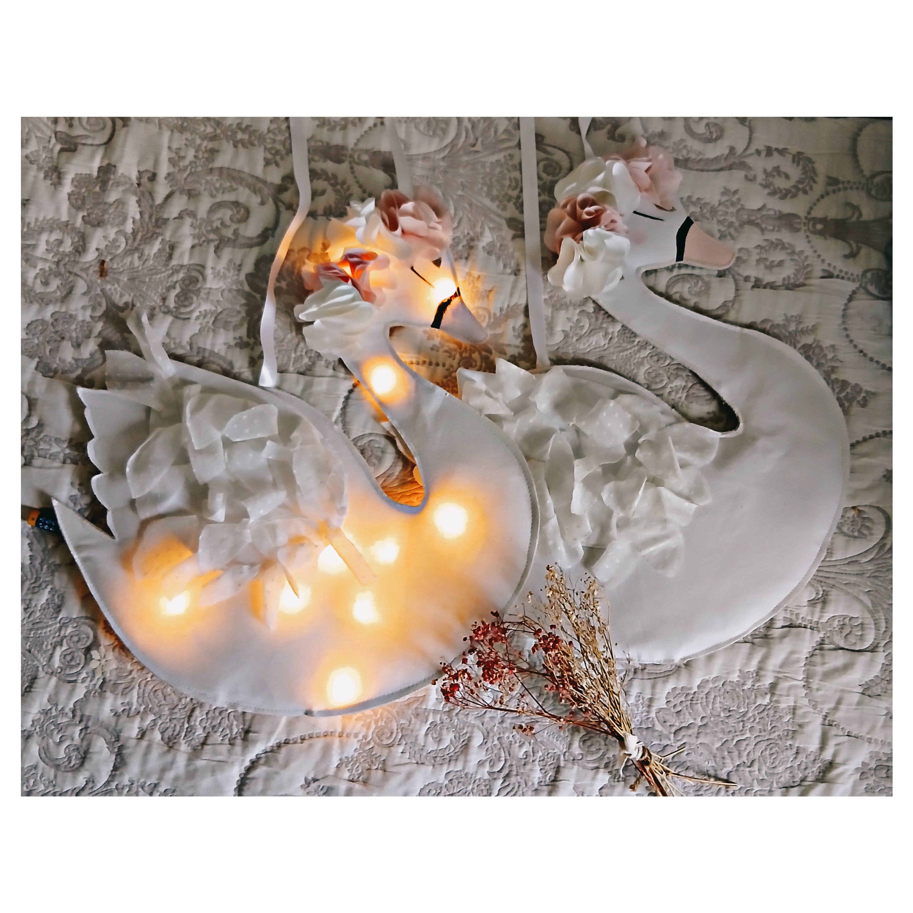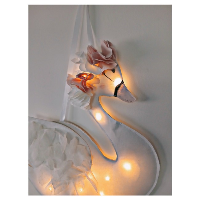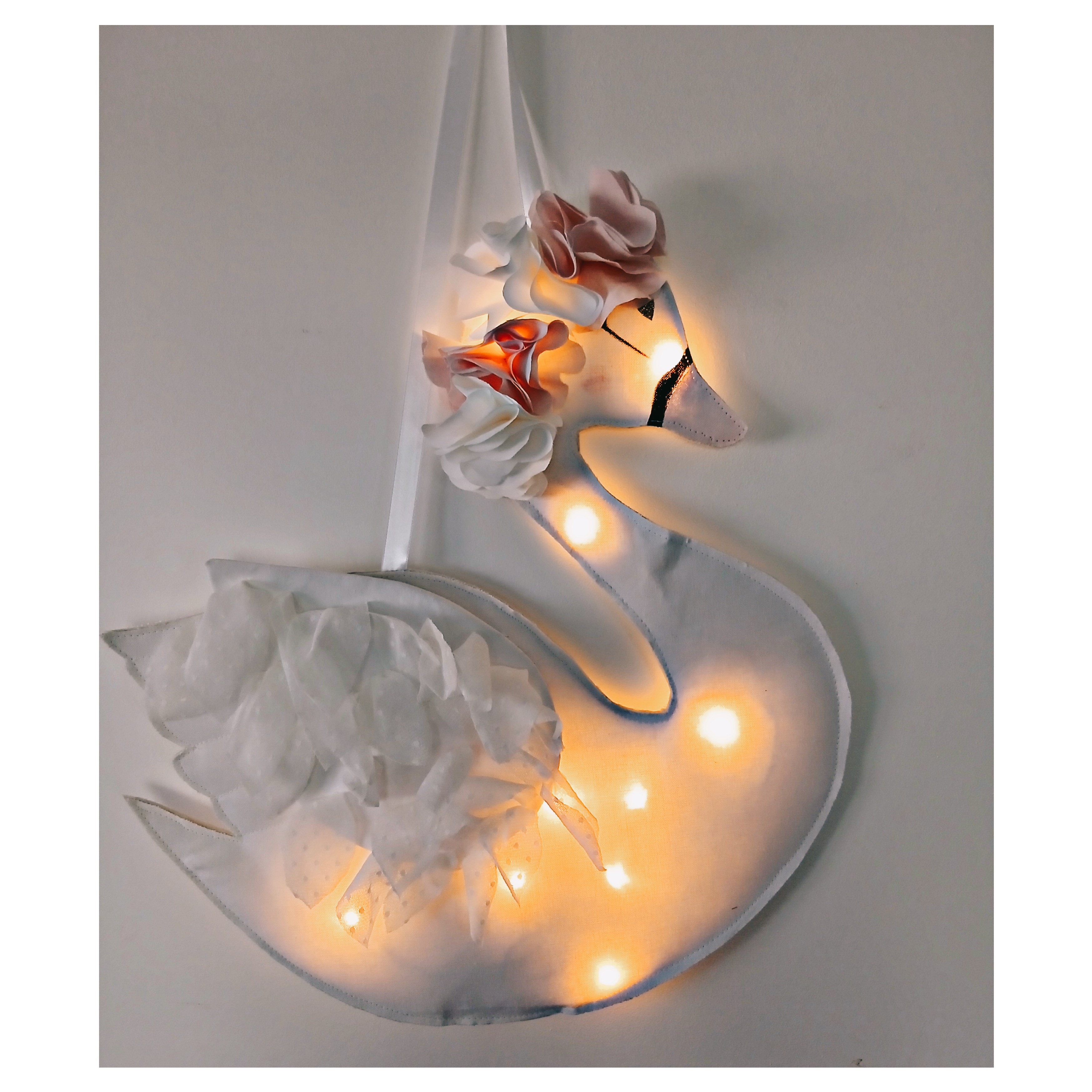 Une jolie veilleuse qui rassurera votre enfant la nuit tout en décorant joliment sa chambre . Elle est en coton blanc ,Couronne de fleurs en coton rose et blanc , les yeux sont peints . L'aile est recouverte de tulle .