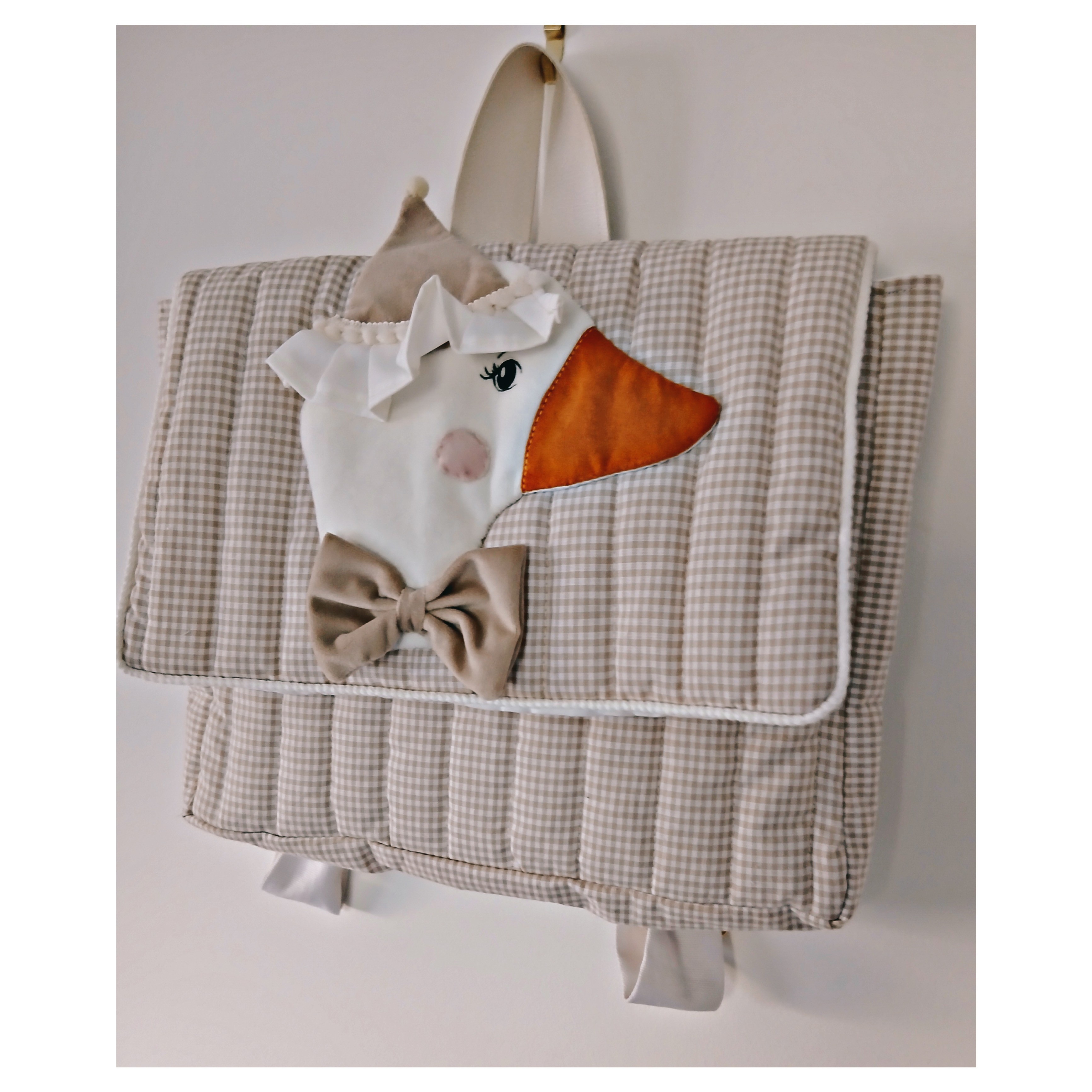 Petit cartable ou sac à dos en coton vichy beige et blanc matelassé, sur le rabat application d'une jolie tête d'oie en velours ivoire avec un chapeau .
