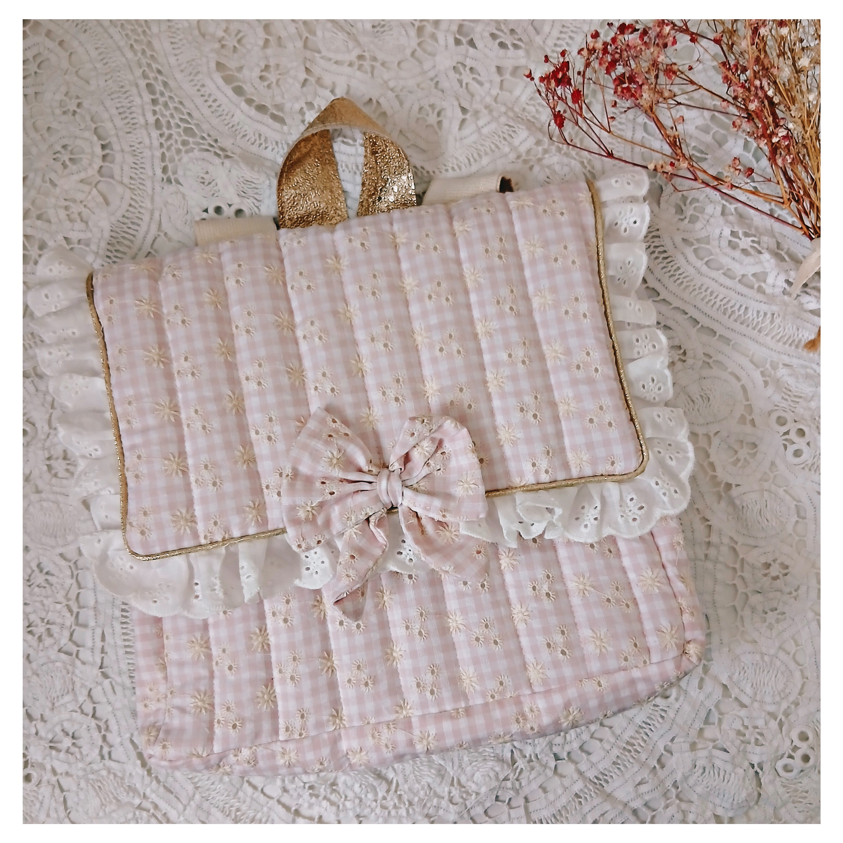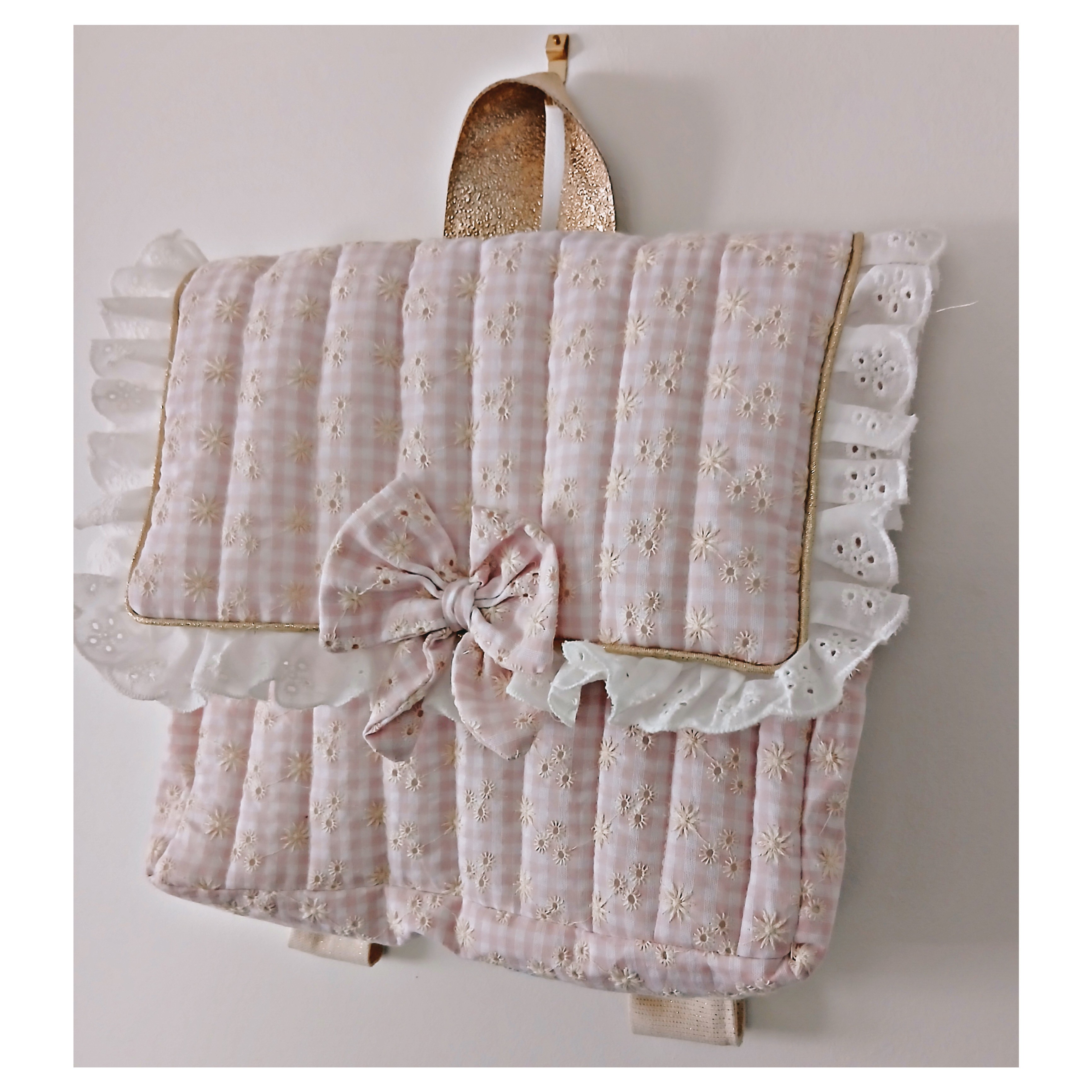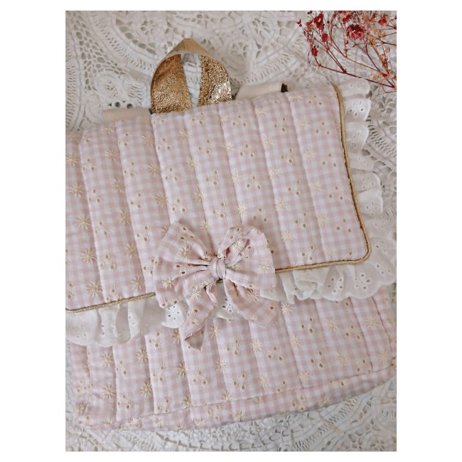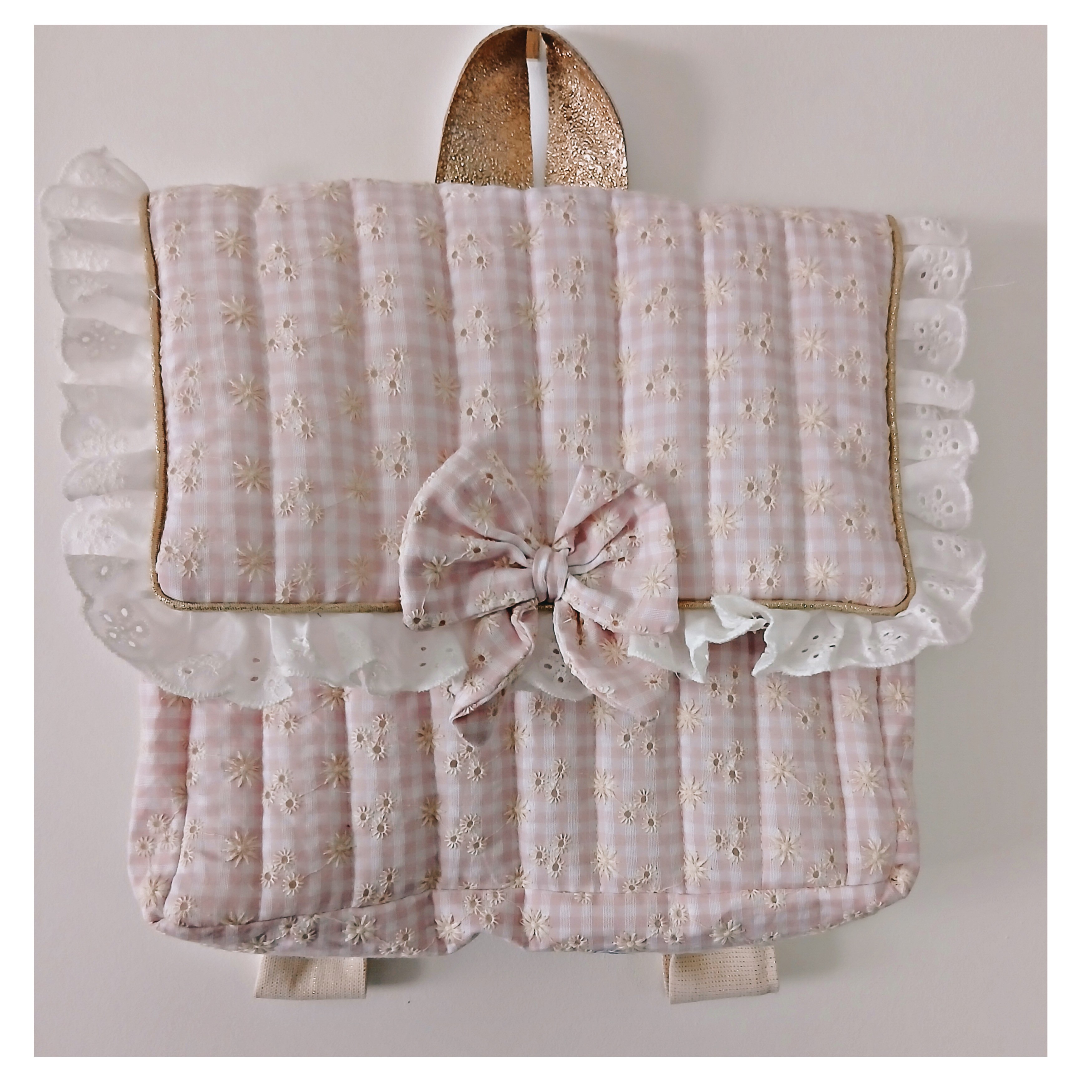 Il est en coton vichy rose avec des fleurs brodées et matelassé . Petit volant en broderie anglaise autour du rabat .