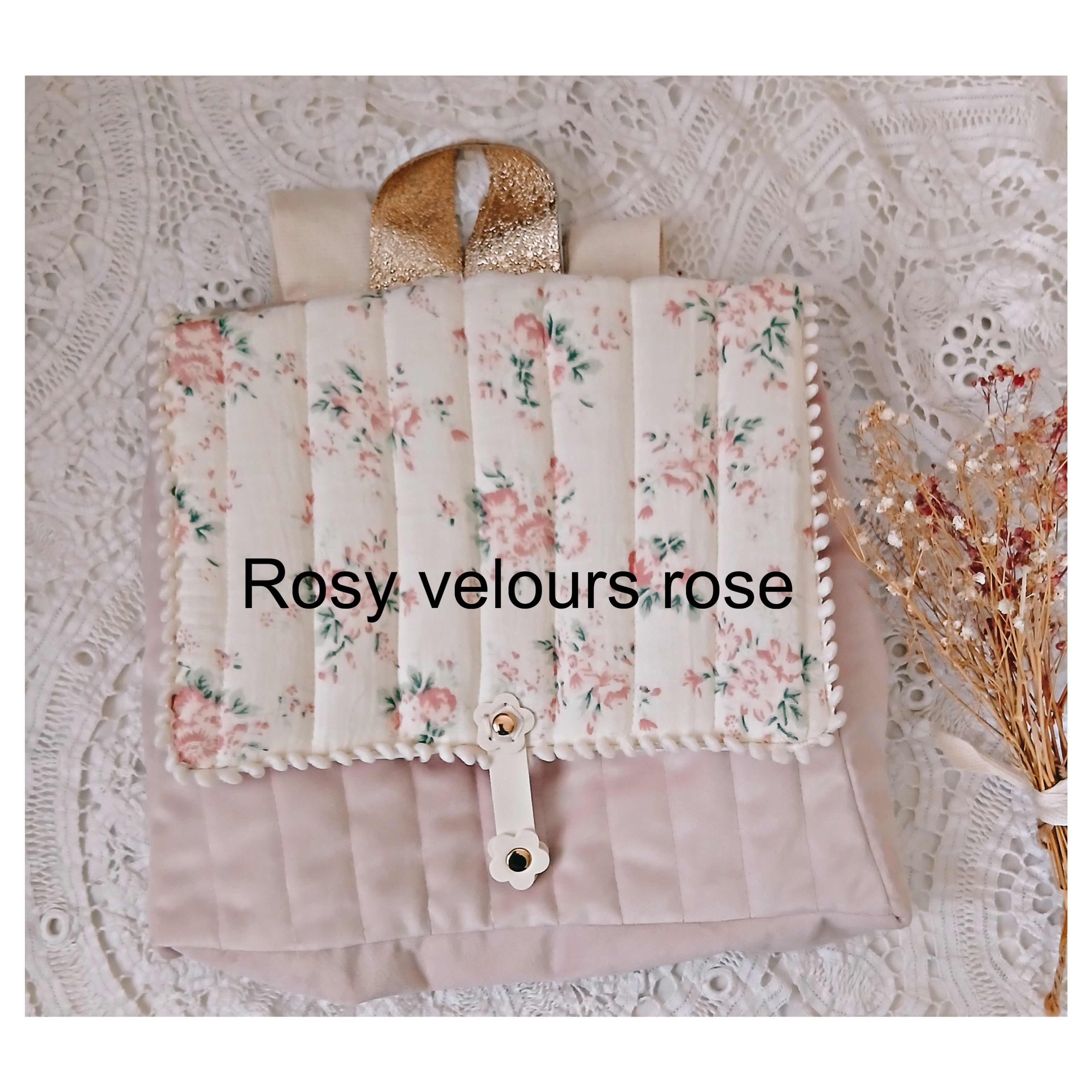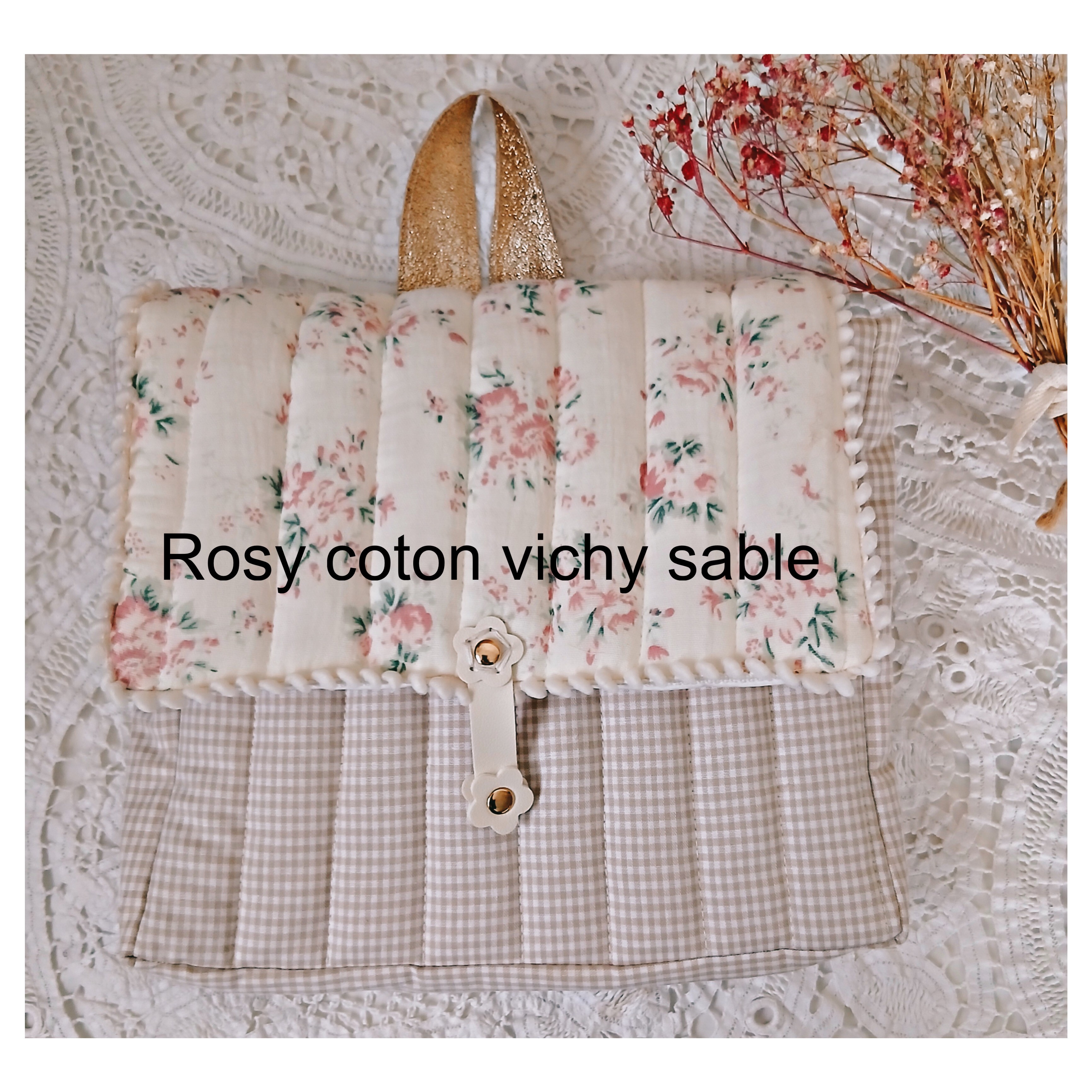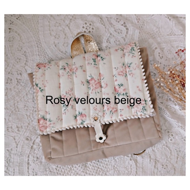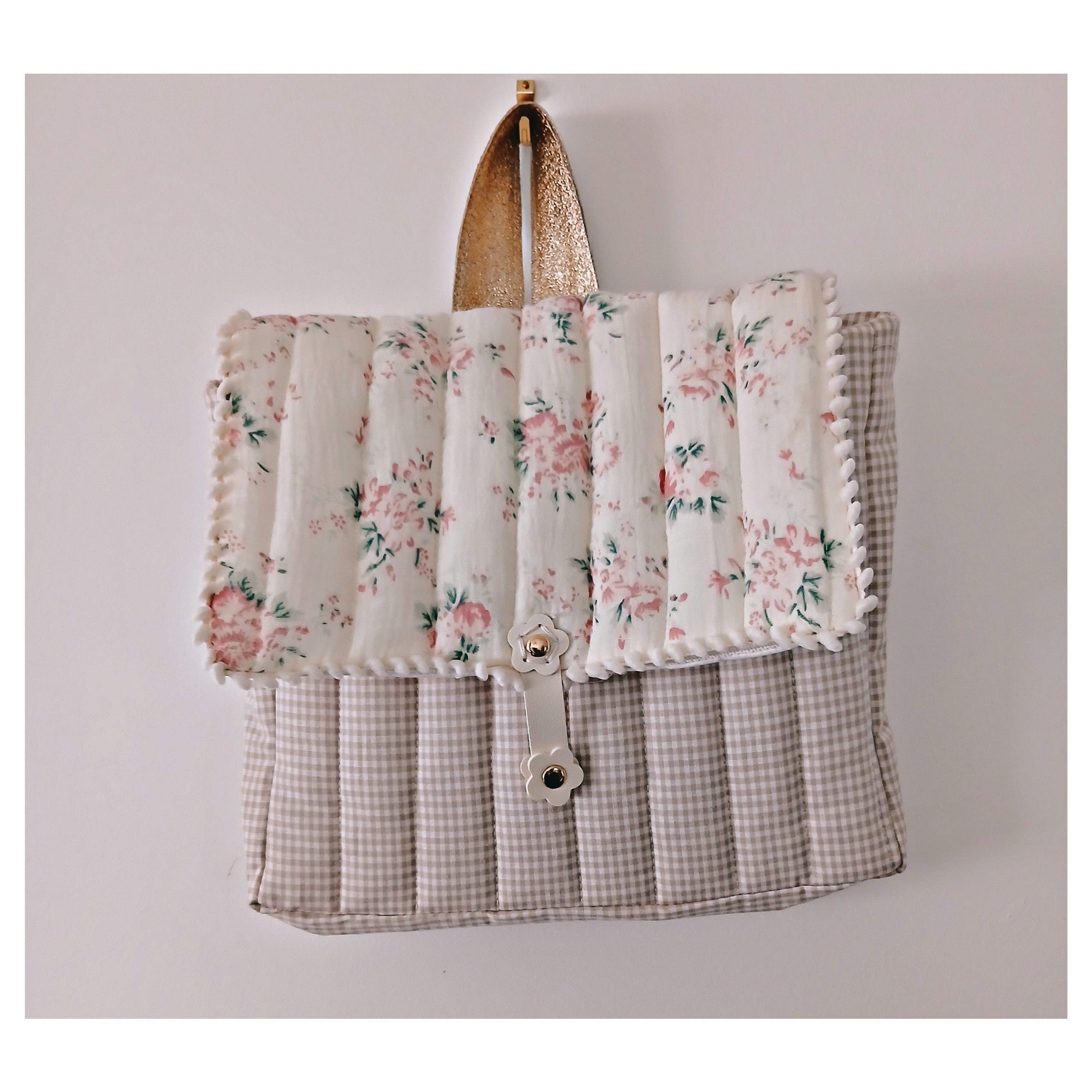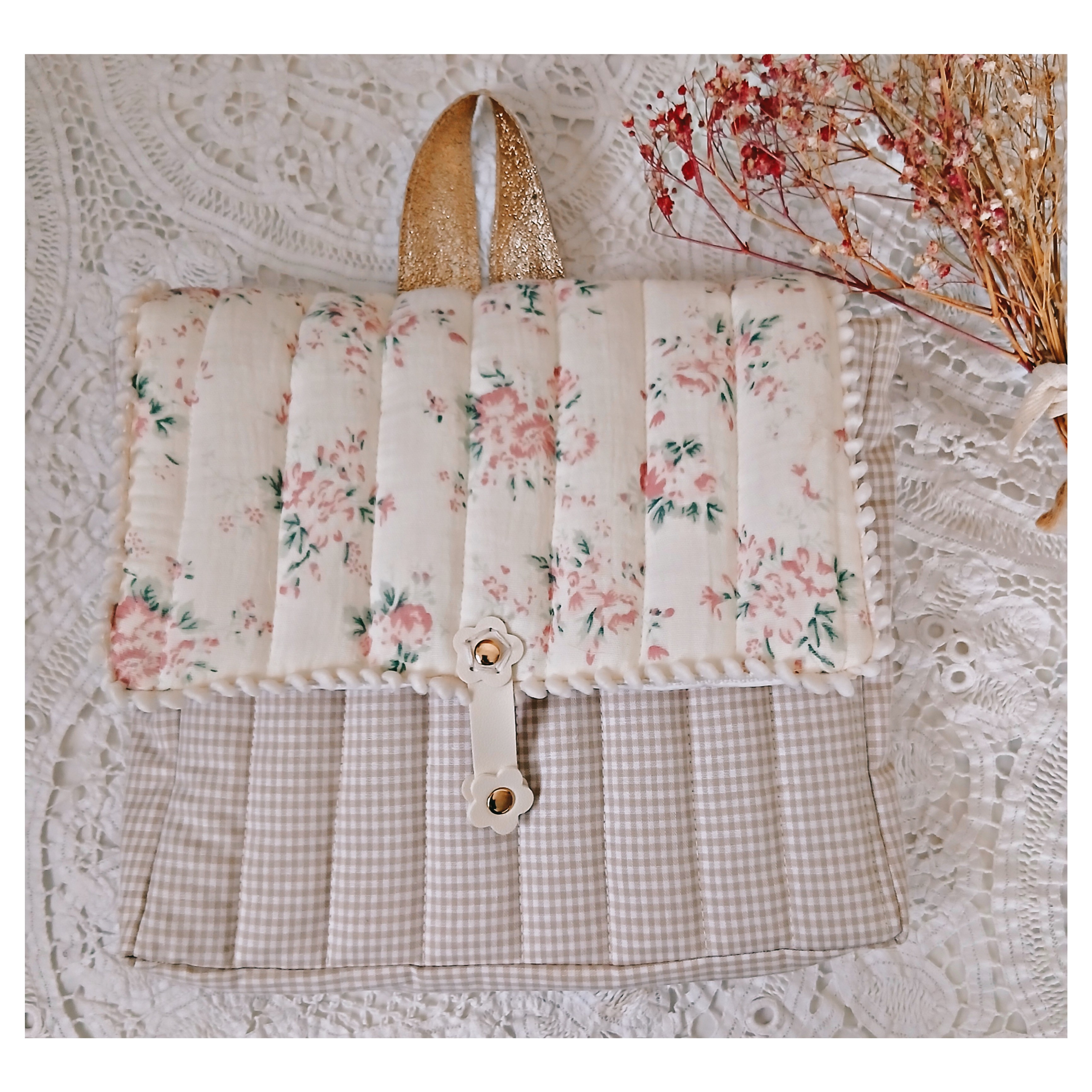 Ce cartable se décline en plusieurs versions , vous avez le choix entre le velours rose , le velours beige ou bien le coton vichy sable . Le rabat est en double gaze fleuri et matelassé orné d'un petit galon pompons tout autour et il se ferme avec un bouton pression en forme de fleur . .