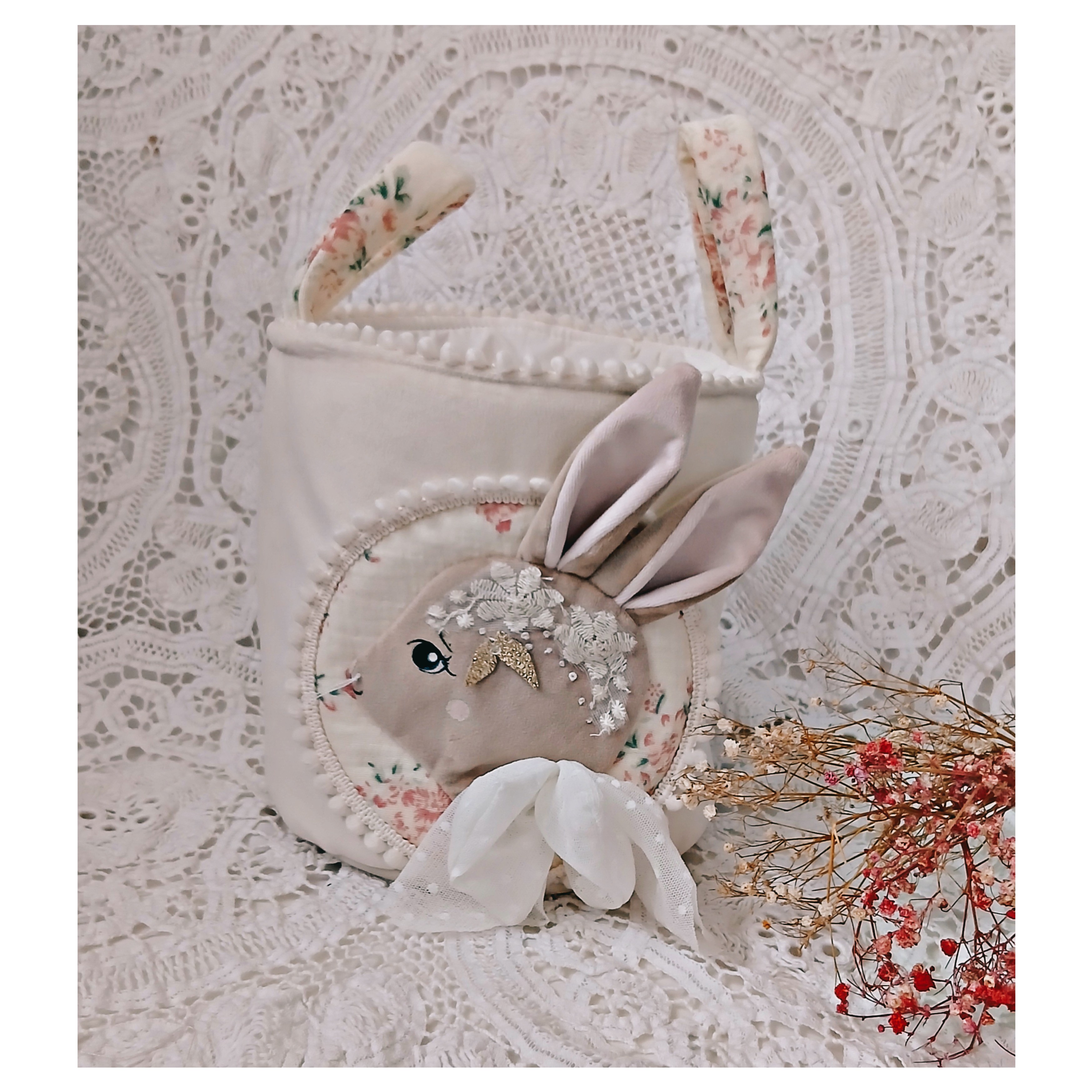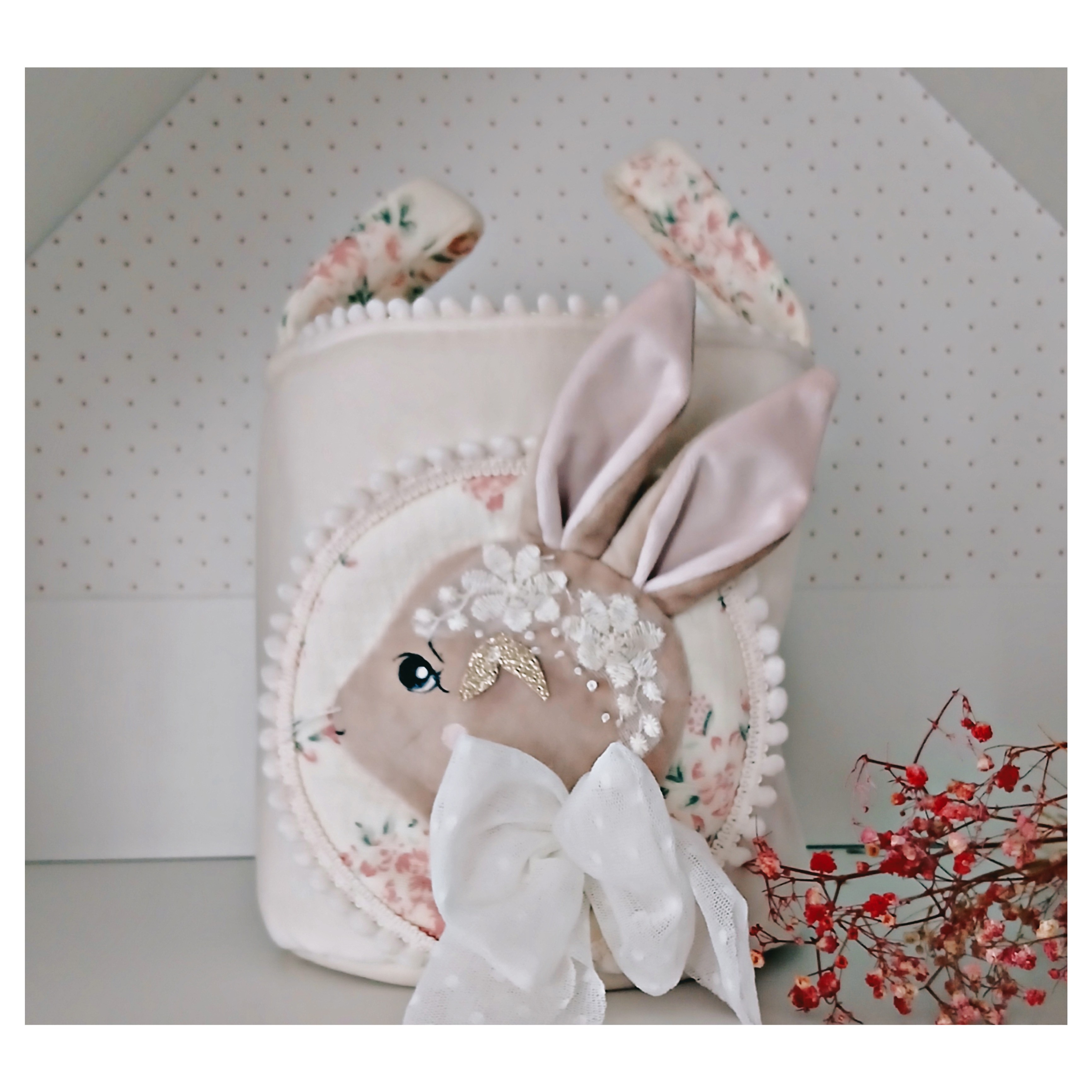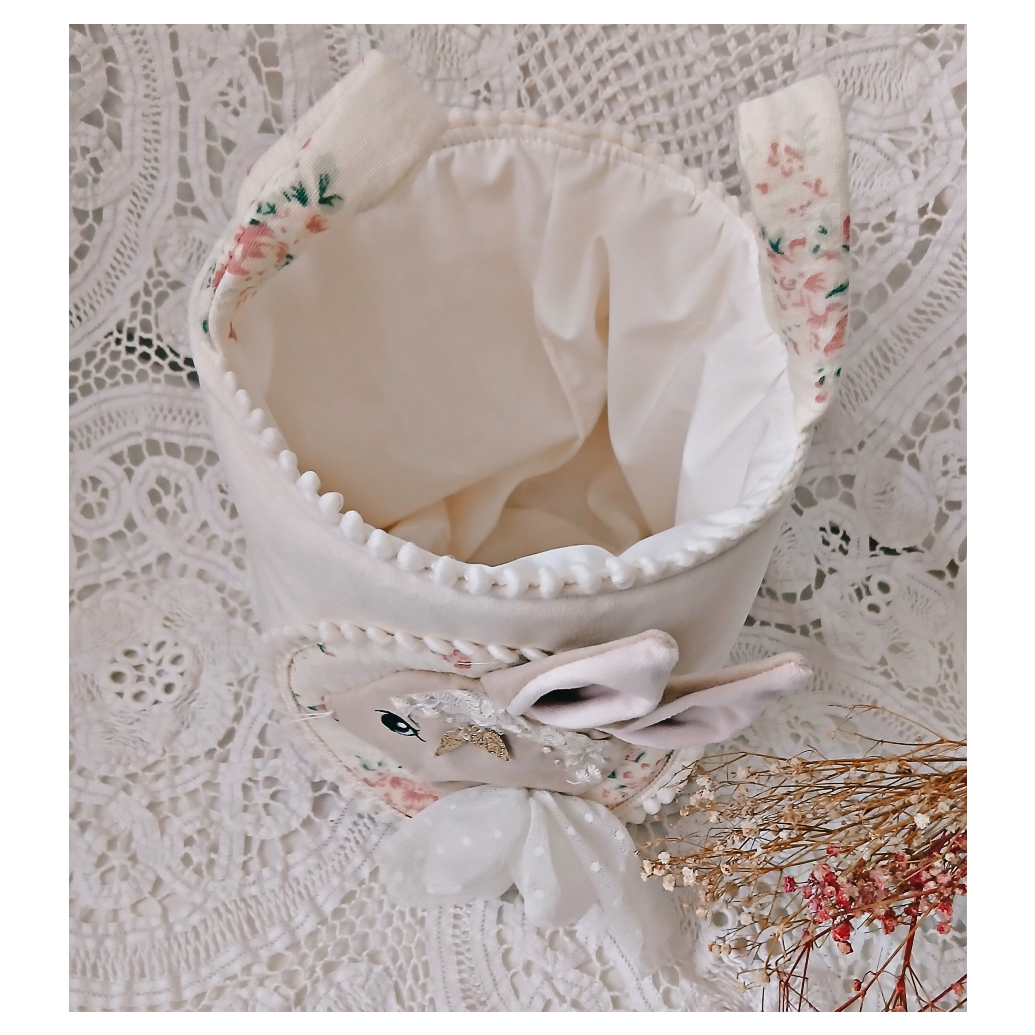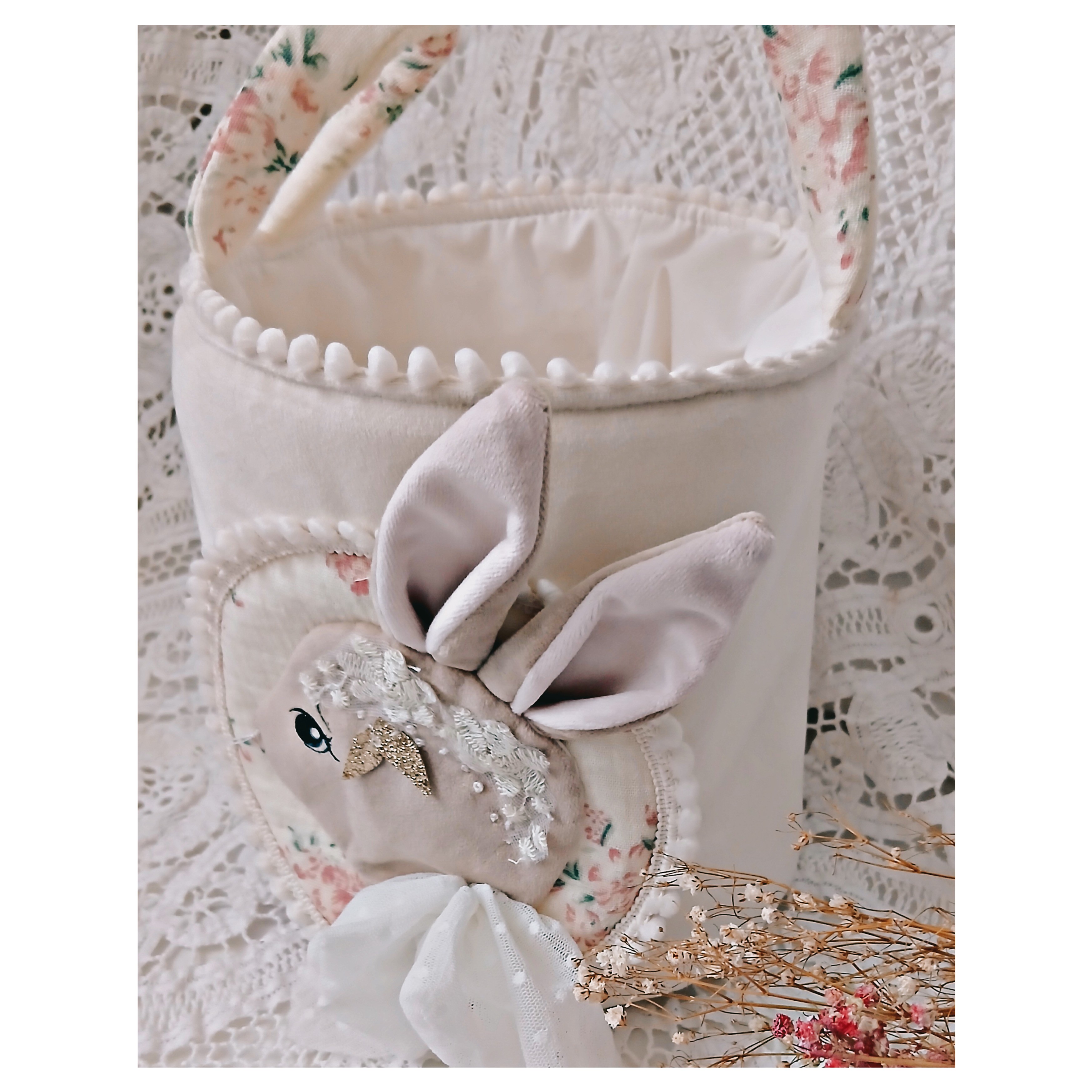 Petite panière ou corbeille pour y ranger les petites affaires de bébé en velours ivoire , ornée d'un petit galon pompons . Médaillon avec une tête de lapin en velours beige , petites anses sur le côté pour transporter la panière. Doublure coton ivoire uni .