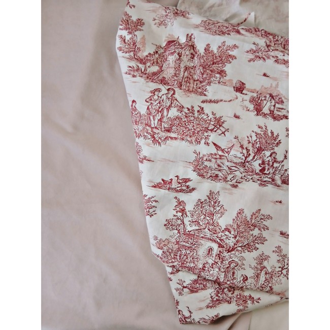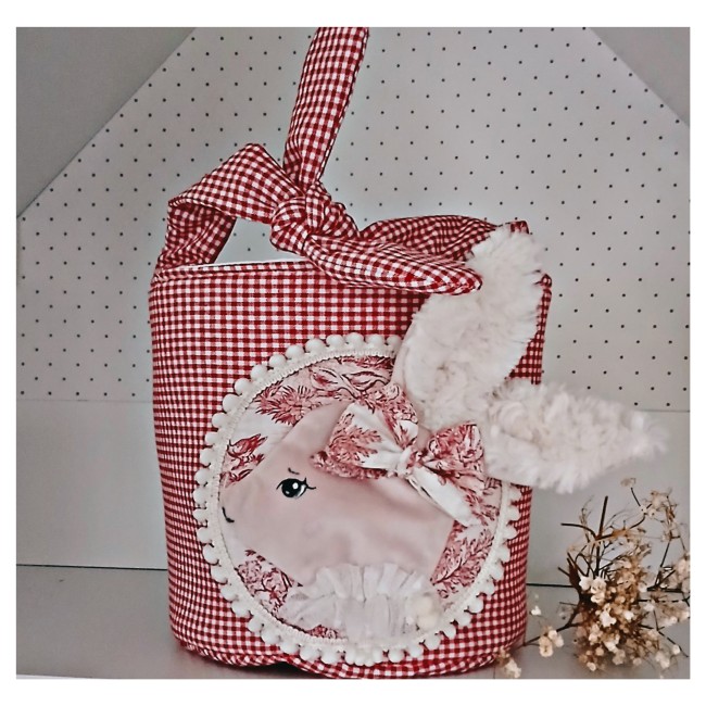 Cartable format A4 , il est en velours lisse rose uni , le rabat est en toile de Jouy vieux rose orné d'un galon pompons , application d'une tête de lapin en velours rose avec les oreilles en fausse fourrure ivoire , noeud en toile de Jouy et noeud en tulle plumetis ivoire. Le rabat se ferme avec un bouton aimanté.