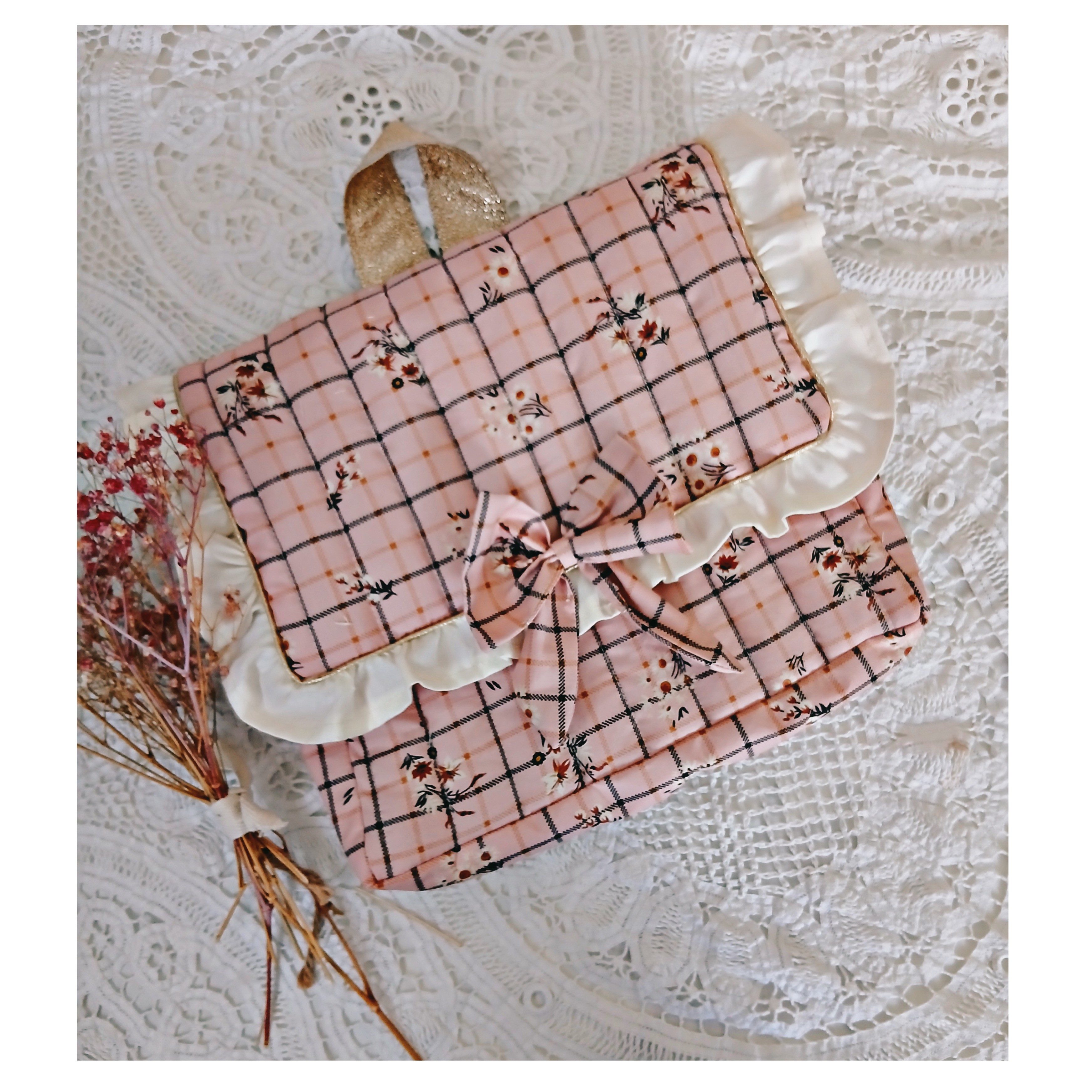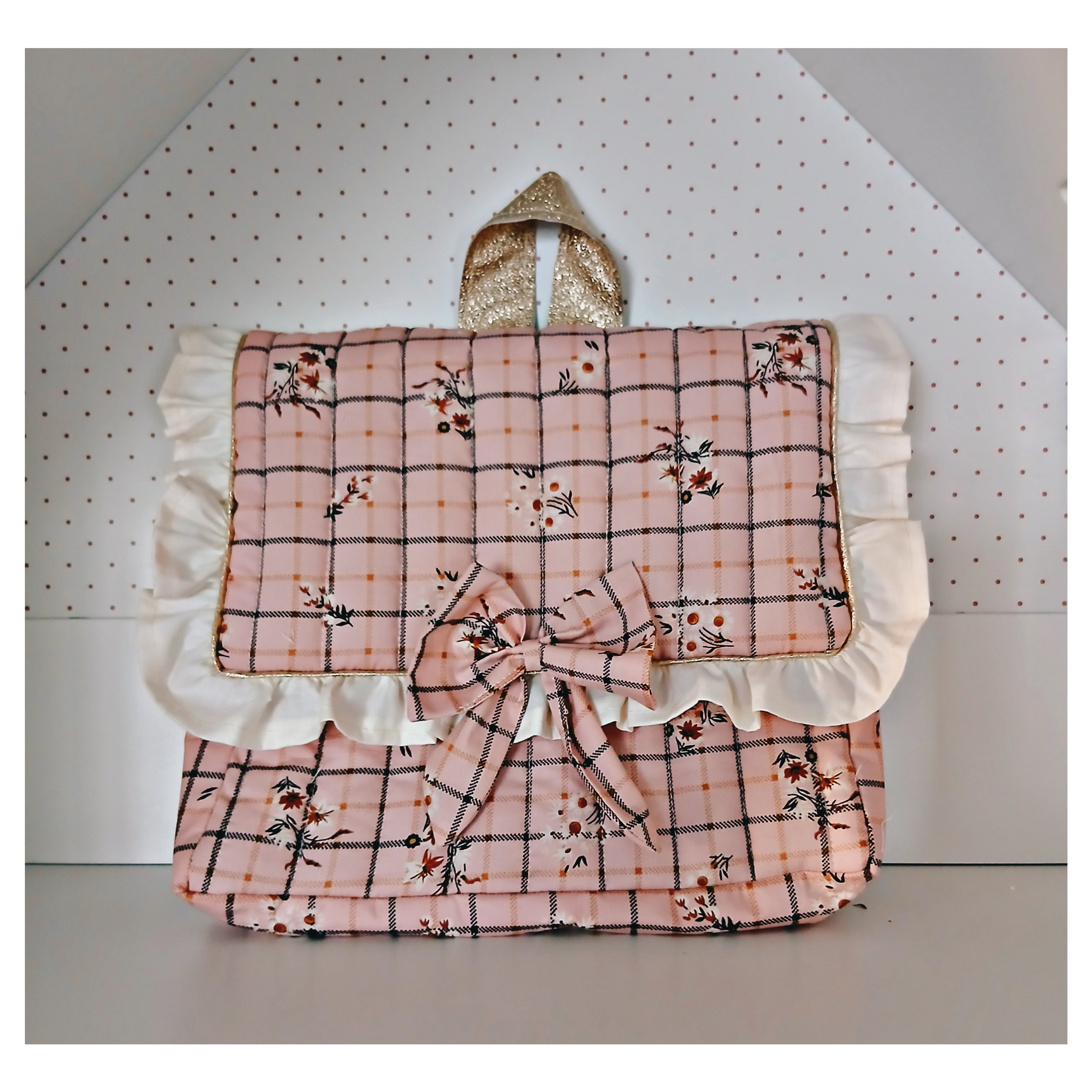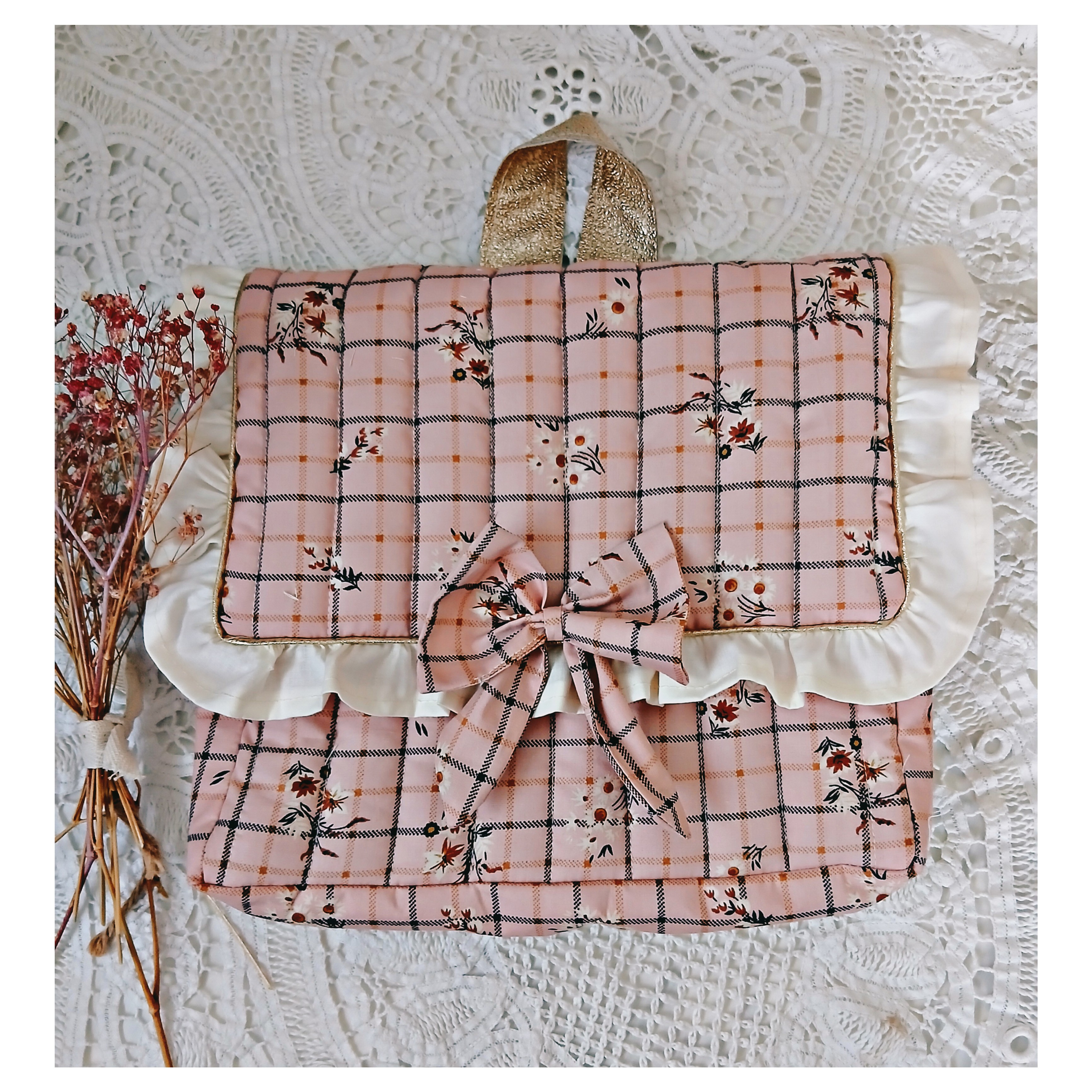 Ce cartable est en coton à carreaux fleuri sur un fond vieux rose il est entièrement matelassé . Petit volant en coton beige autour du rabat .