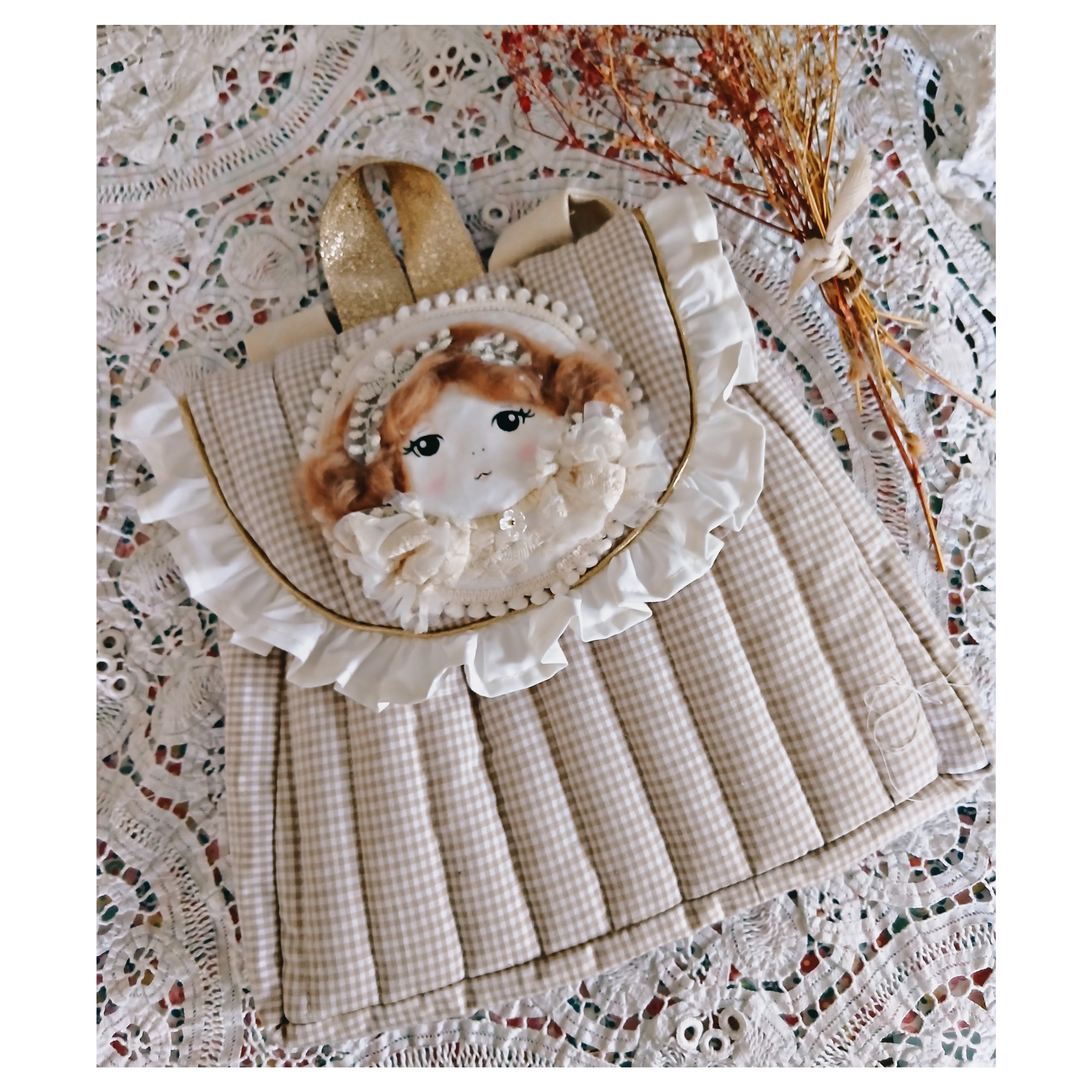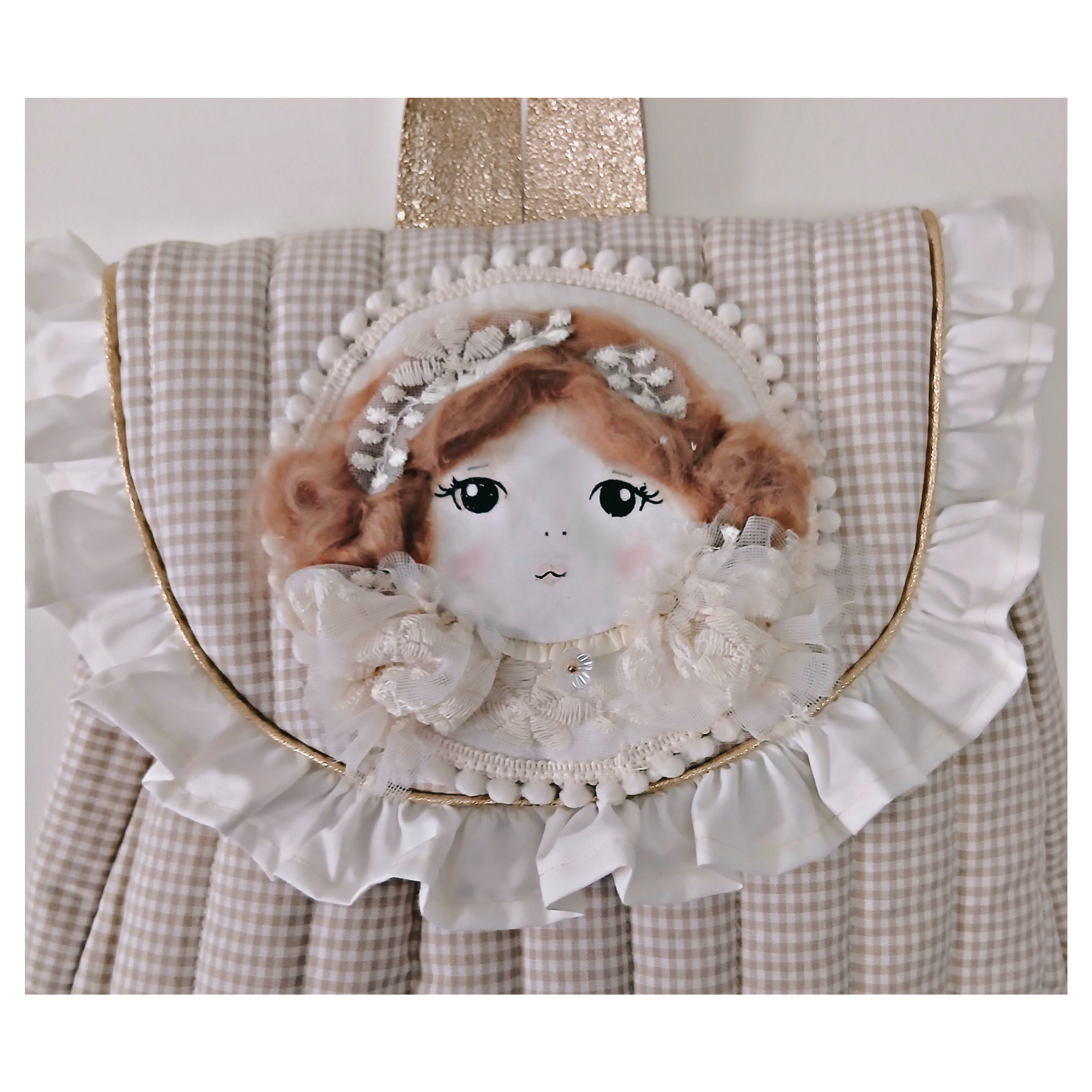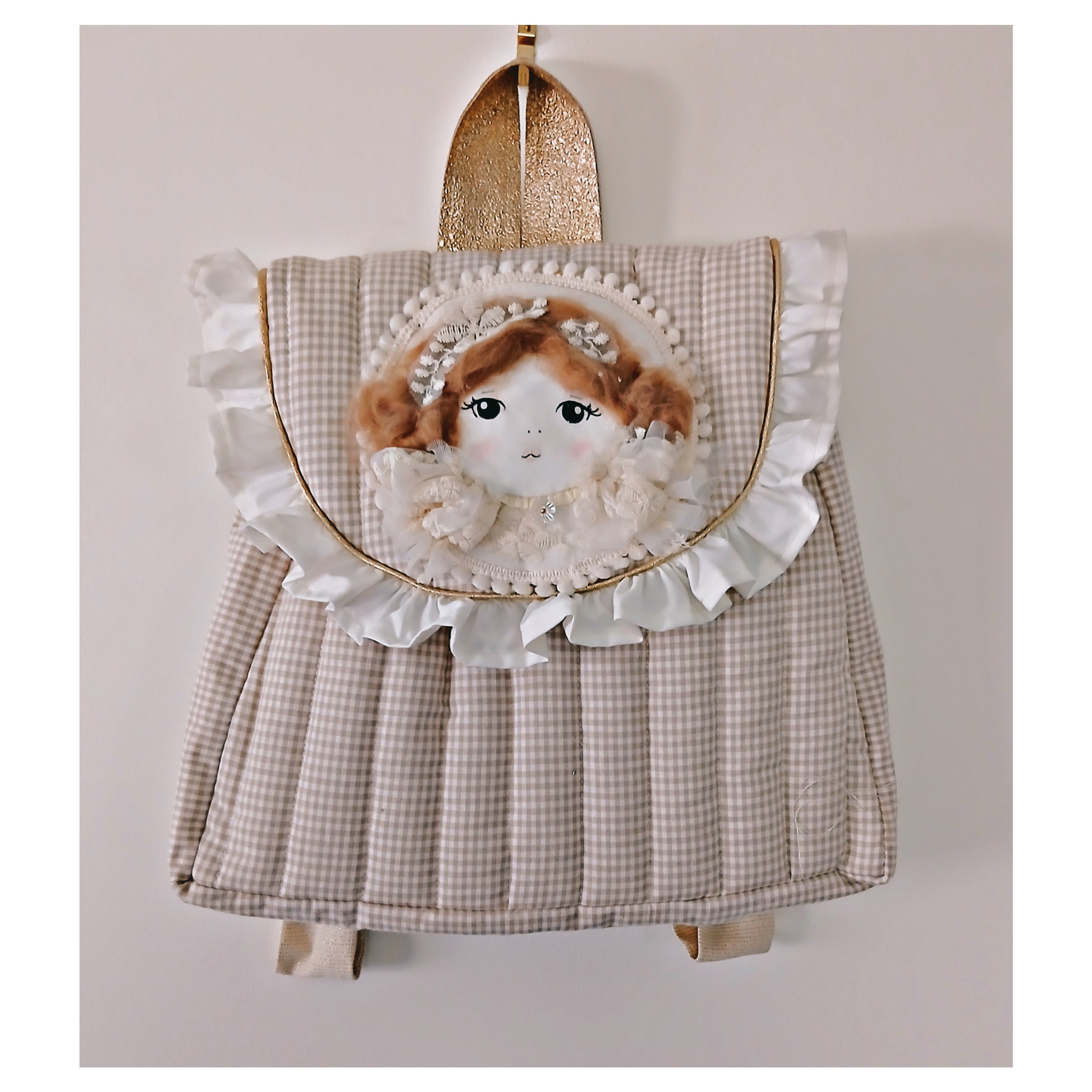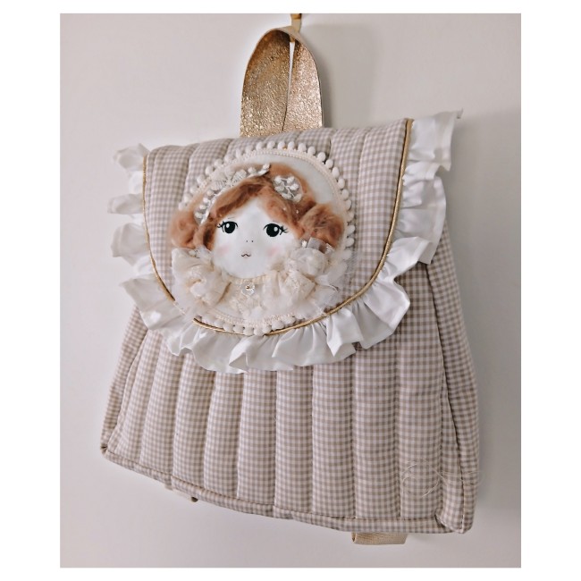 Sac à dos en coton vichy beige tout matelassé doublé de coton uni avec un petit volant en coton ivoire .