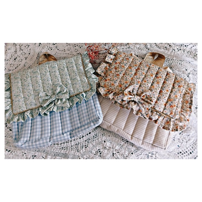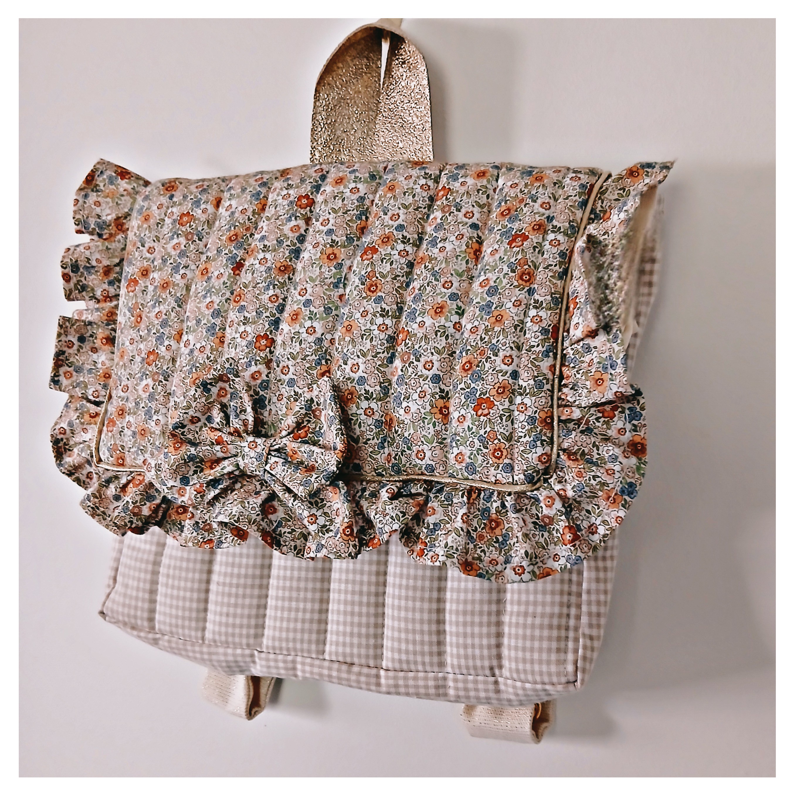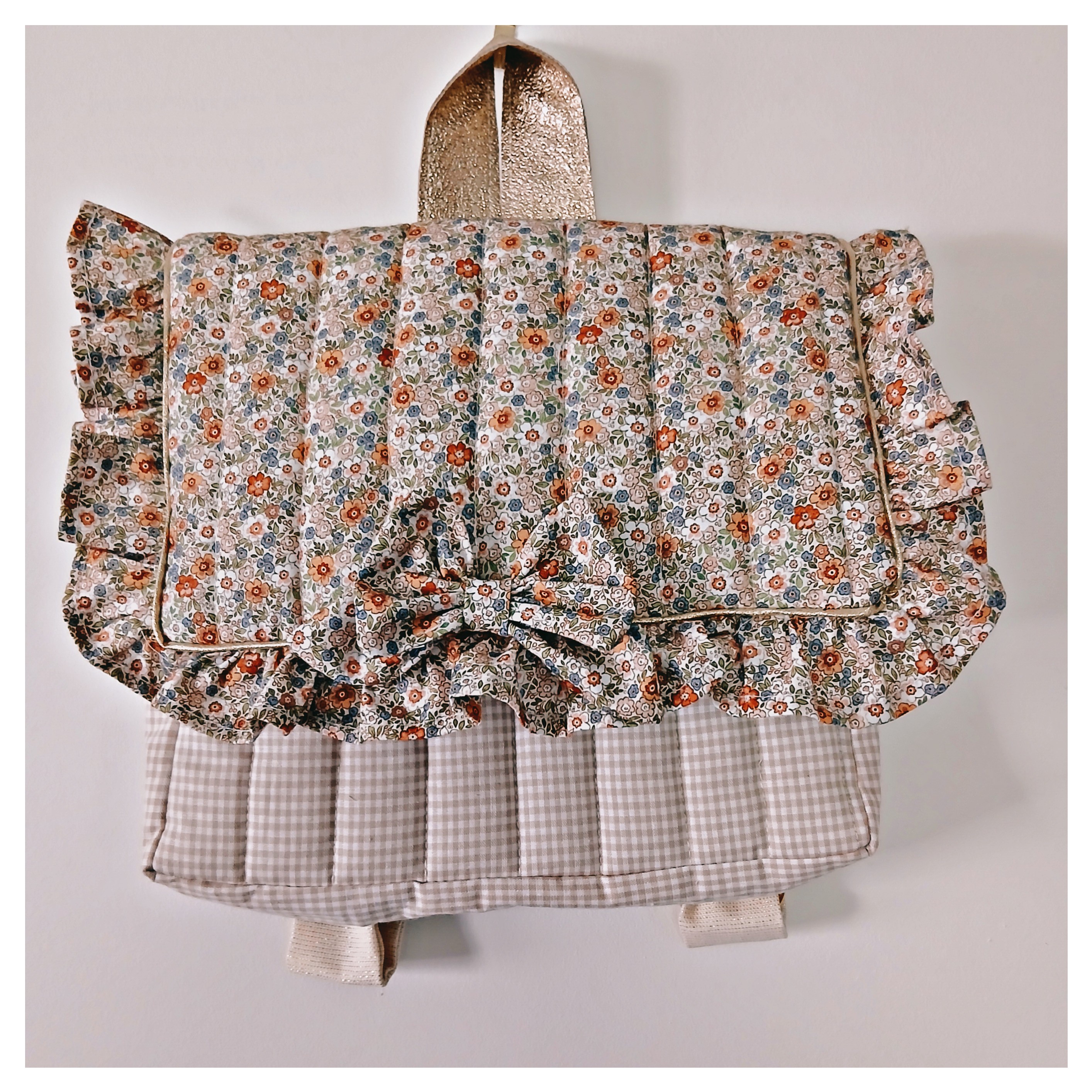 Ce cartable est en coton vichy beige et blanc , le rabat est en coton fleuri avec un petit volant tout autour. Il est entièrement matelassé .