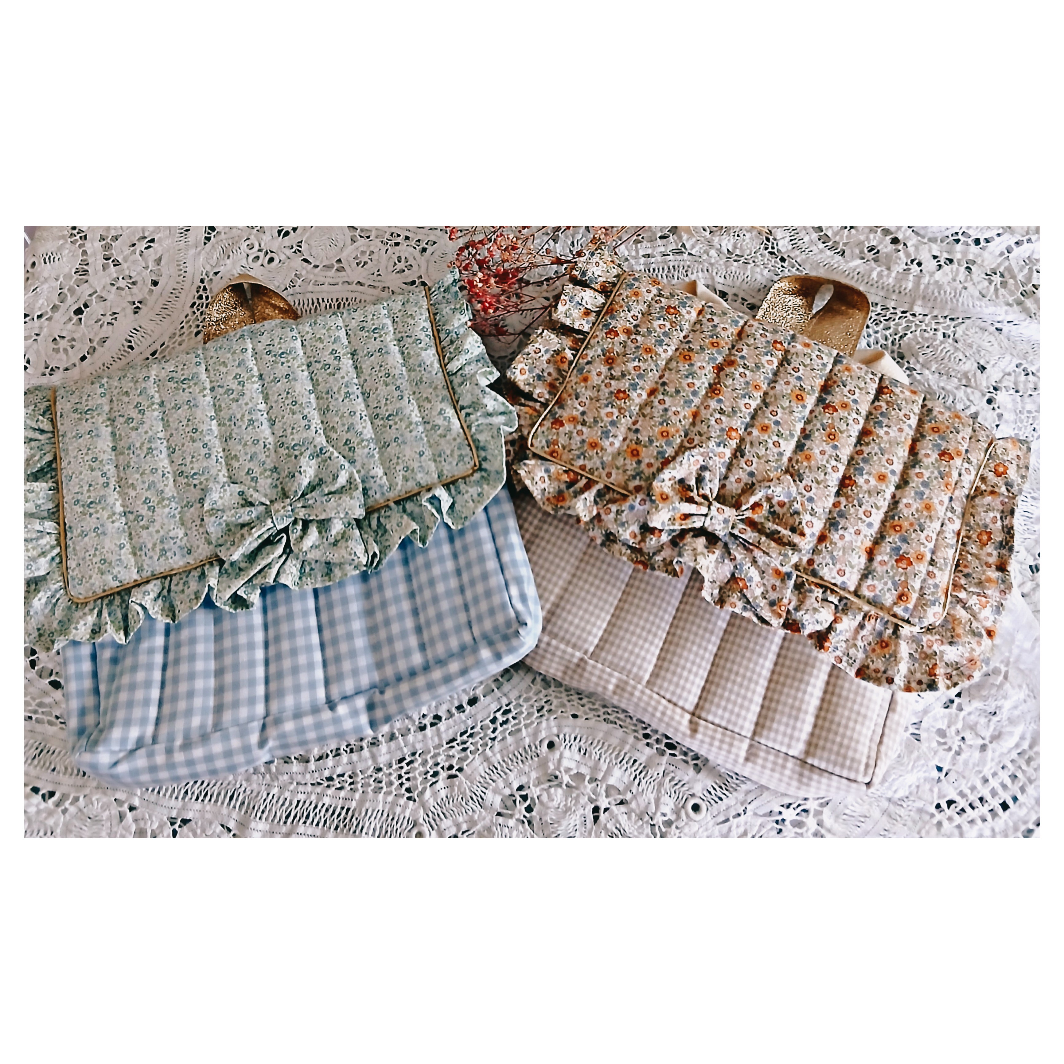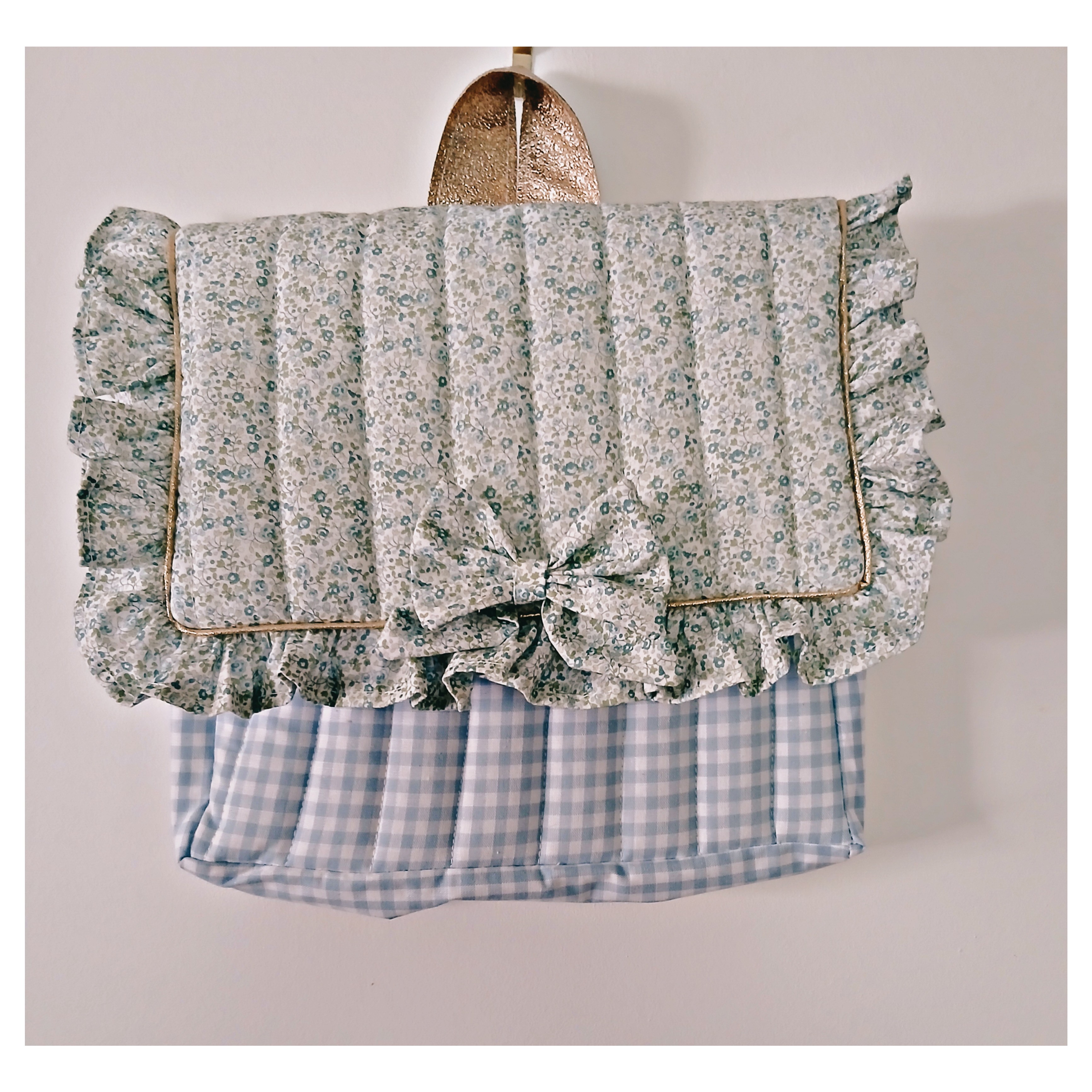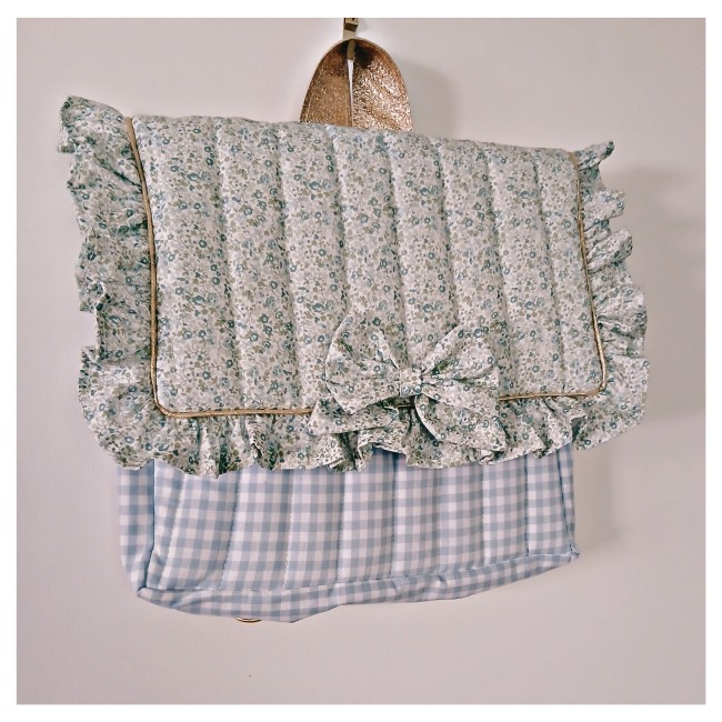 Ce cartable est en coton vichy bleu et blanc , le rabat est en coton fleuri avec un petit volant tout autour. Il est entièrement matelassé .