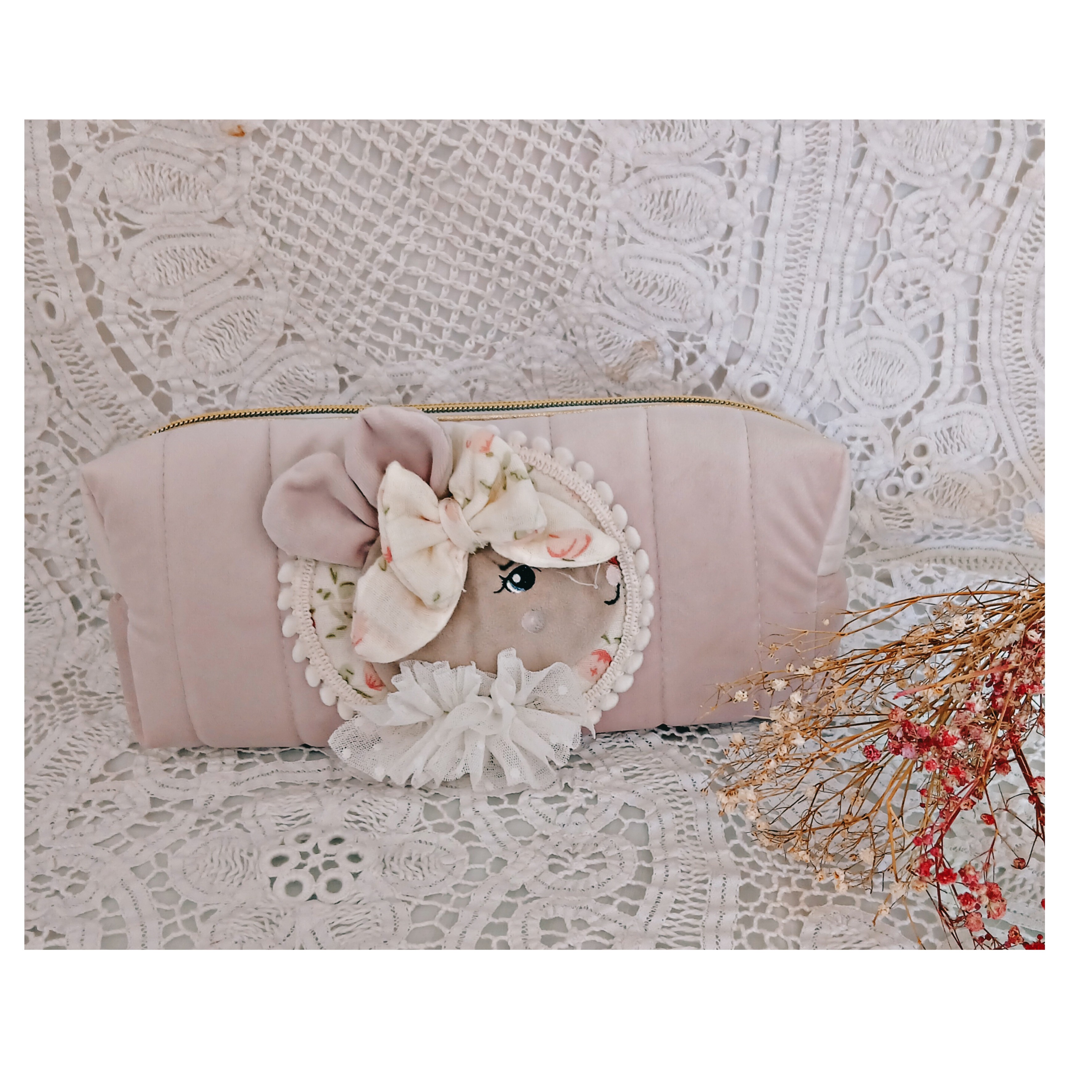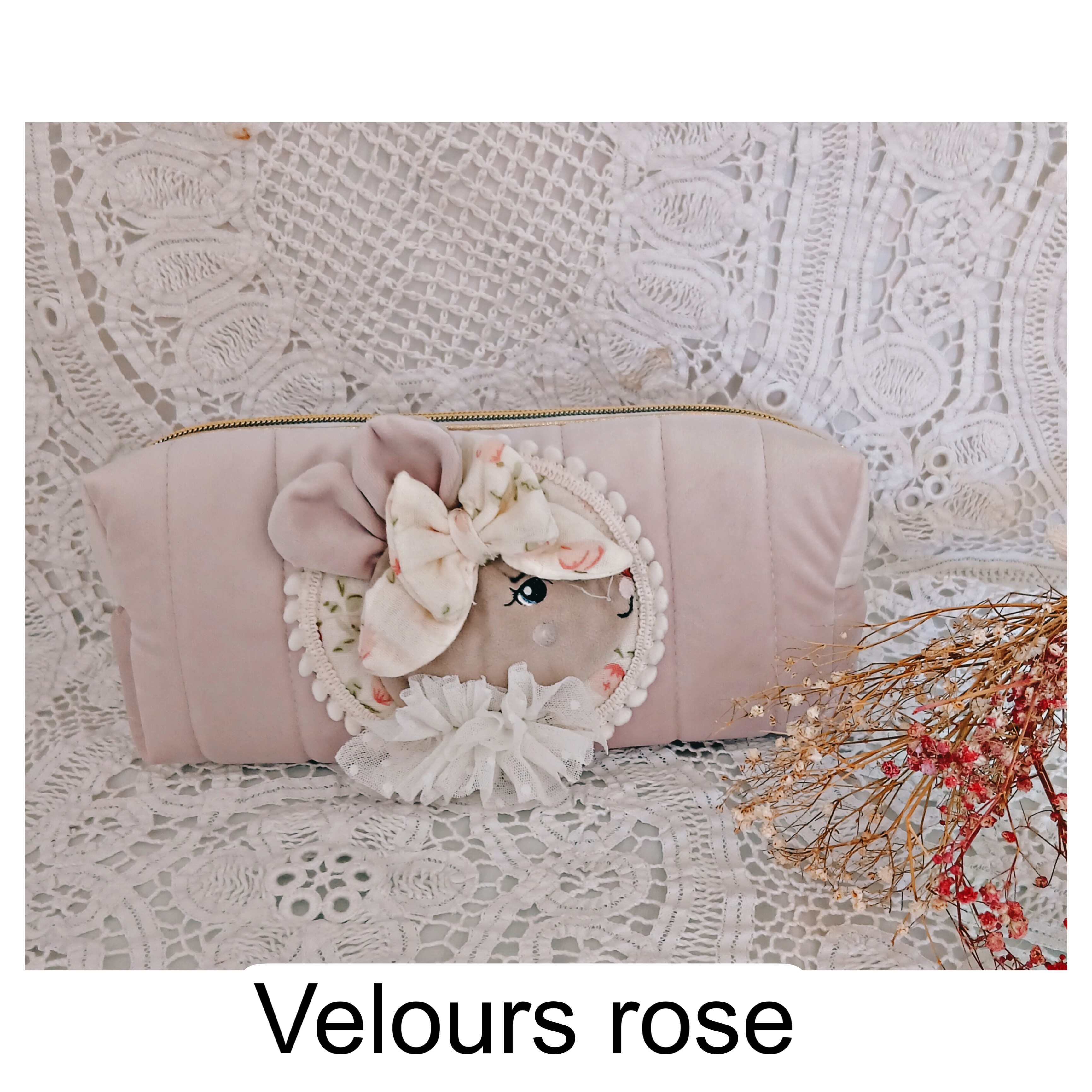 Pour compléter joliment la collection cartable voici une trousse en velours matelassé avec une application d'une tête de souris en velours également, les oreilles sont en velours rose .