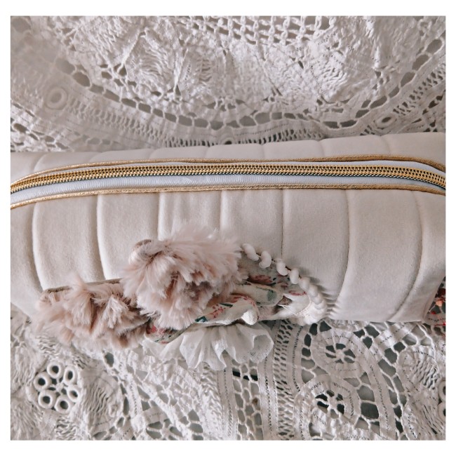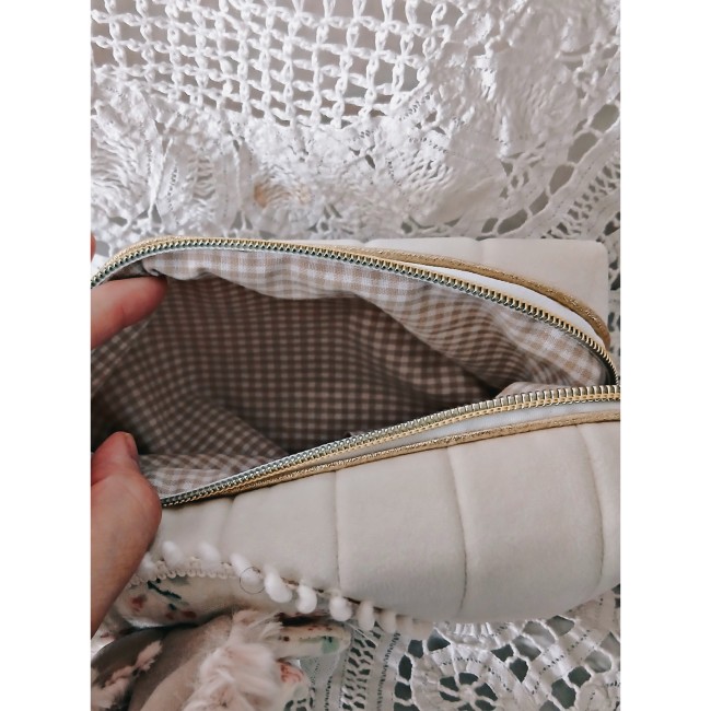 La trousse est doublé de coton vichy beige . Elle se ferme à l'aide d'une fermeture éclaire.